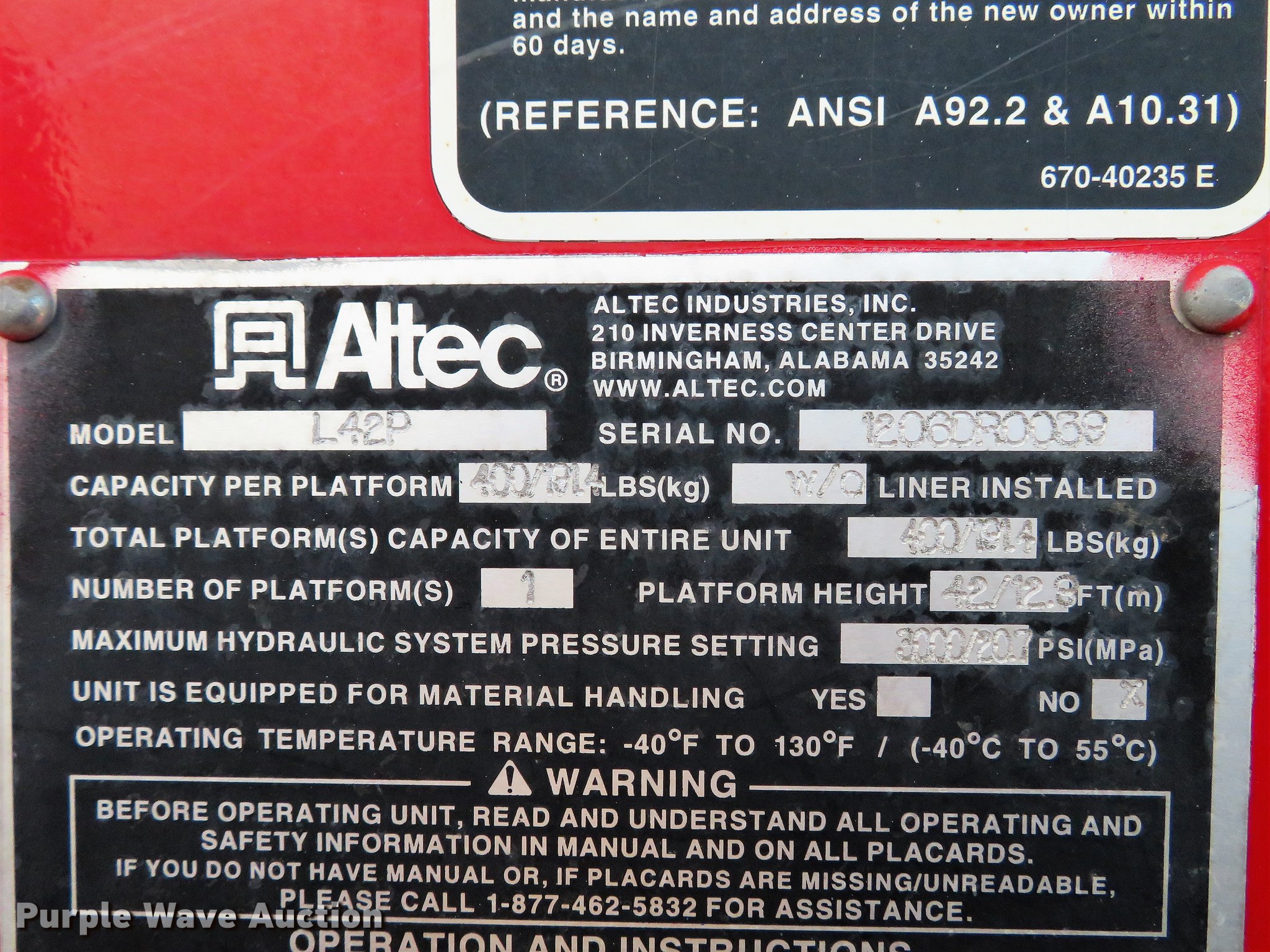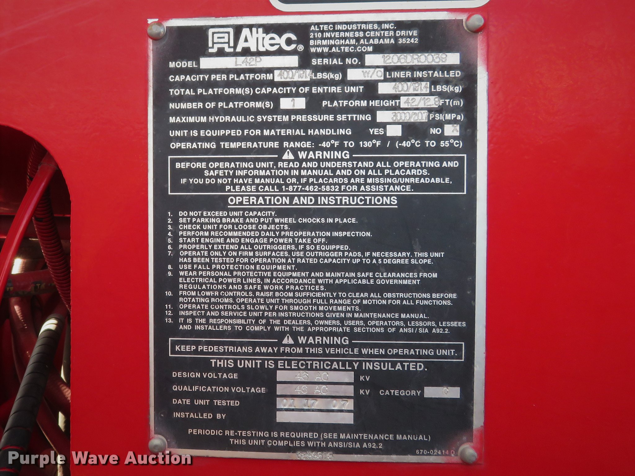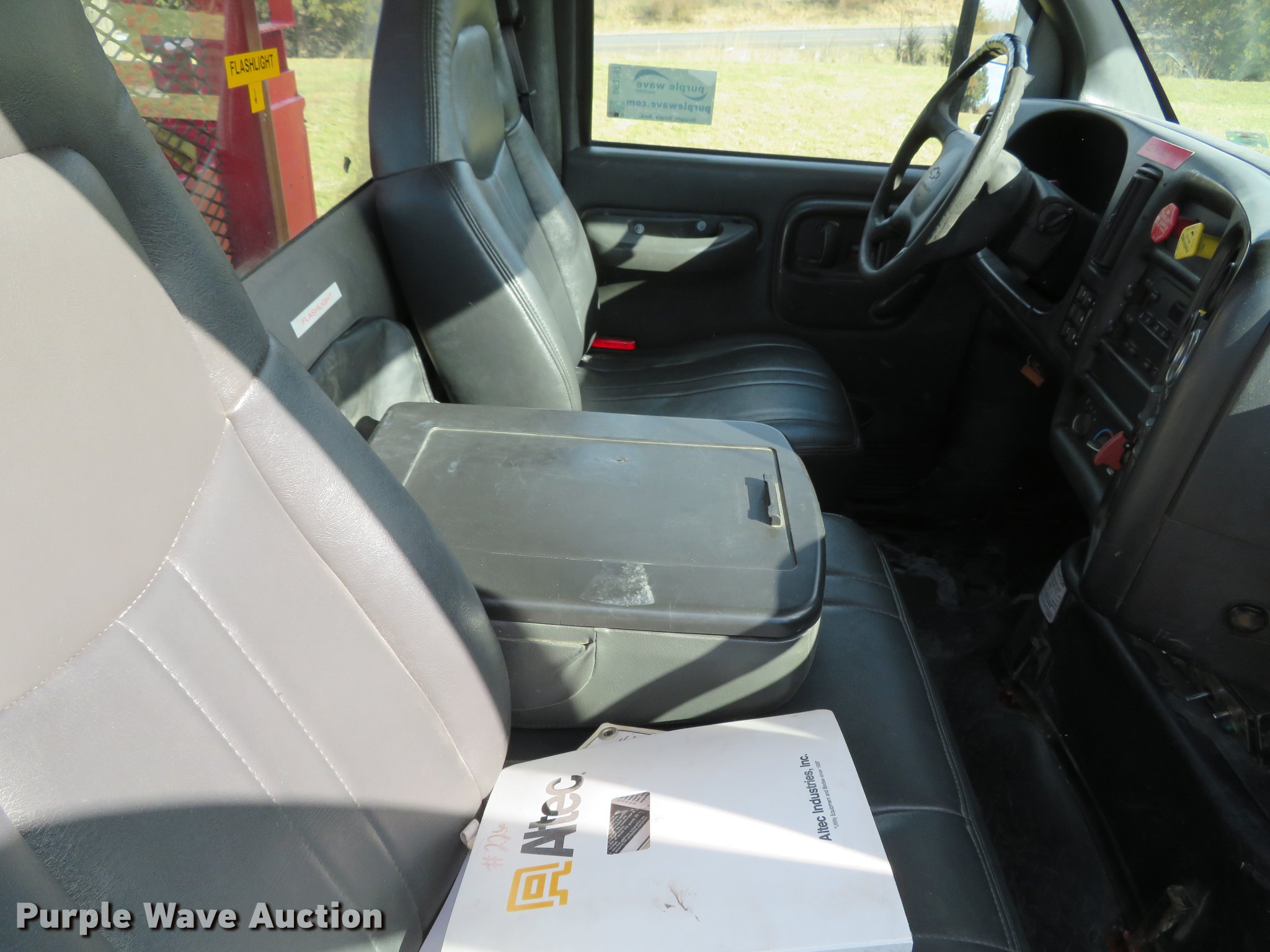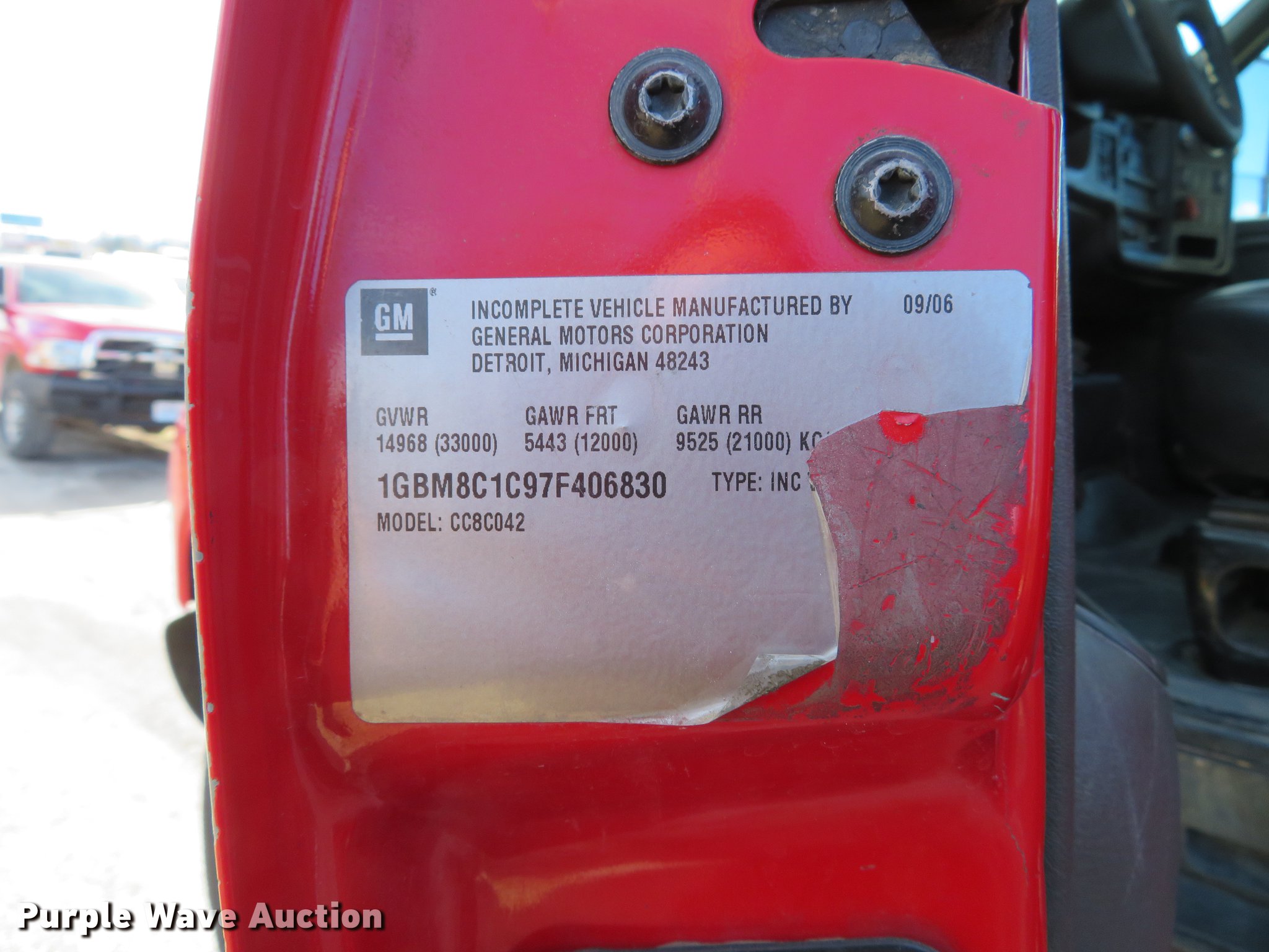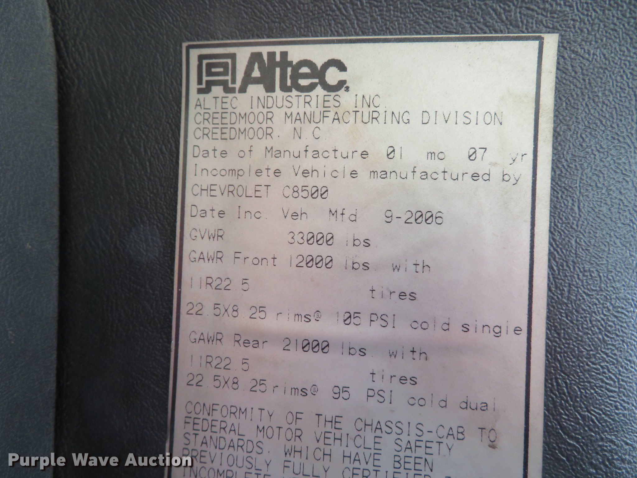 Purple Wave is selling a used Bucket Truck in Missouri. This item is a 2007 Chevrolet C8500 bucket truck with the following: 124,056 miles on odometer, 9,813 hours on meter, 1,467 PTO hours on meter, Caterpillar C7 7.2L L6 turbo diesel engine, Allison automatic transmission, Single axle, AC and heat, AM/FM, Heated mirrors, Block heater, PTO, Backup alarm, Beacon light, Knapheide 6136HC utility bed, 11'L, Shelving, Compartment lights, Work lights, 24"W rear bumper, Power inverter, 2007 Altec L42P boom, 400 lbs maximum lift capacity, 42' maximum lift height, Man basket, Ground and platform controls, Boom rotation, Articulating insulated boom, Grounding cable reel, (2) outriggers, Certification valid through December 2018, Single fuel tank, Pintle hitch, Rear air connections, 152" wheelbase, Spring suspension, Air brakes, 11R22.5 tires, On spot traction aid chains, GVWR 33,000 lbs, ABS light on