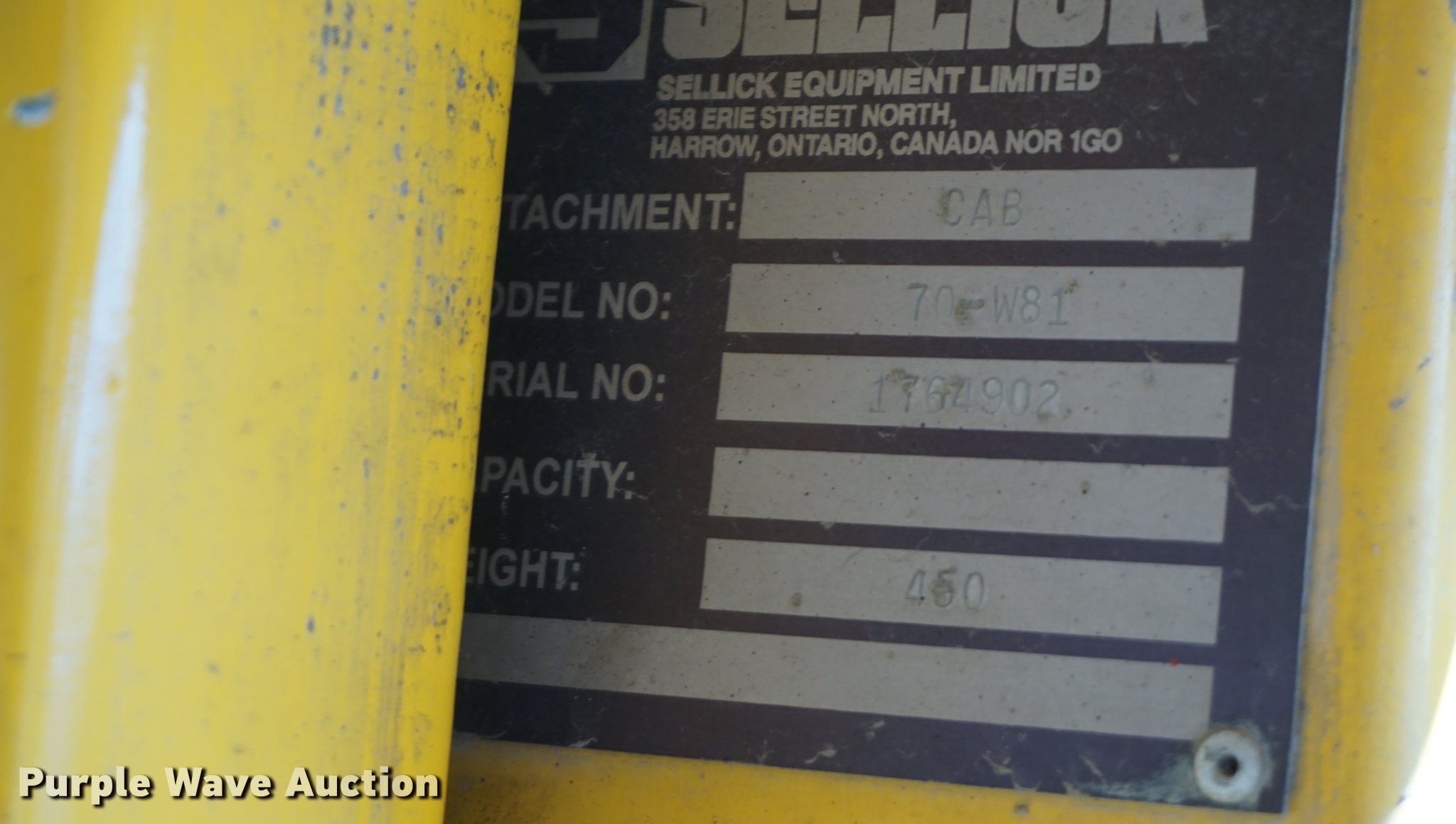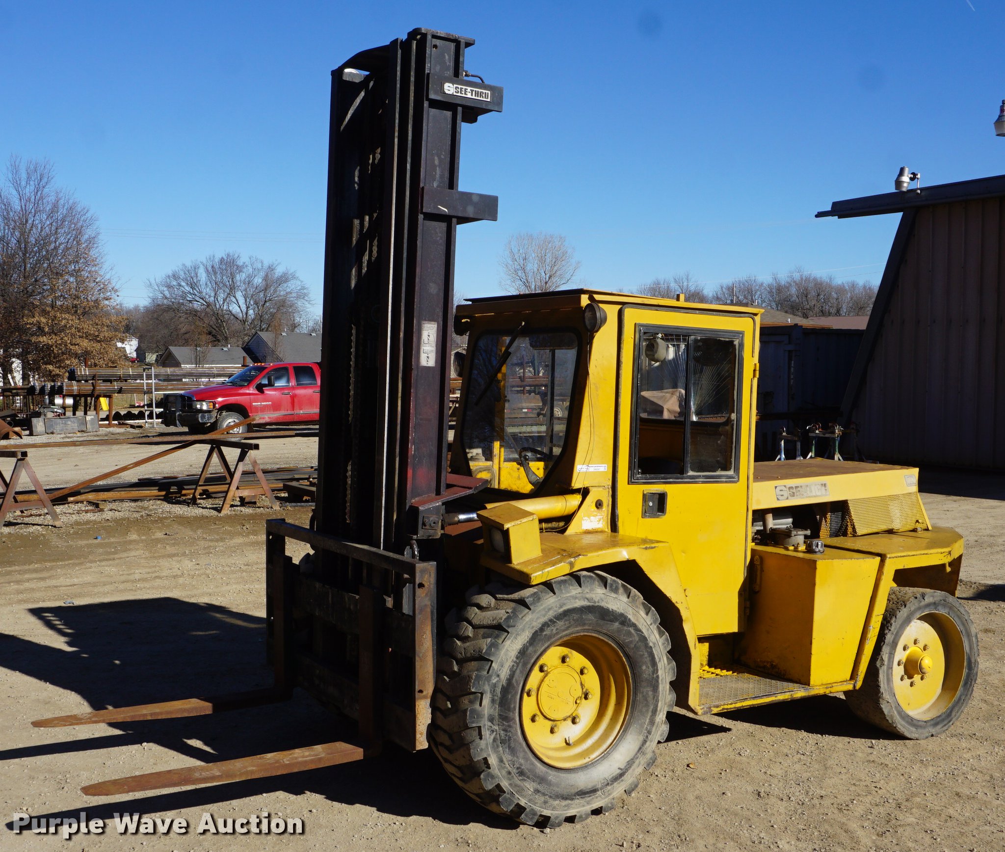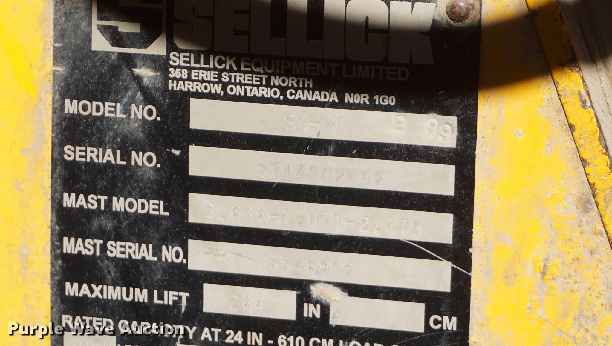 Purple Wave is selling a used Strt. Mast Rough Terr. Forklift in Kansas. This item is a 1999 Sellick SG60 forklift with the following: 7,100 hours on meter, Perkins four cylinder diesel engine, Shuttle shift transmission, 4F-4R gears, Enclosed cab, 6,000 lbs maximum lift capacity, 21' maximum lift height, Three stage mast, Side shift, Mast tilt, 42" fork length, 15-19.5 air front tires, 33 x 6-10 solid rear tires, Serial 3714902652