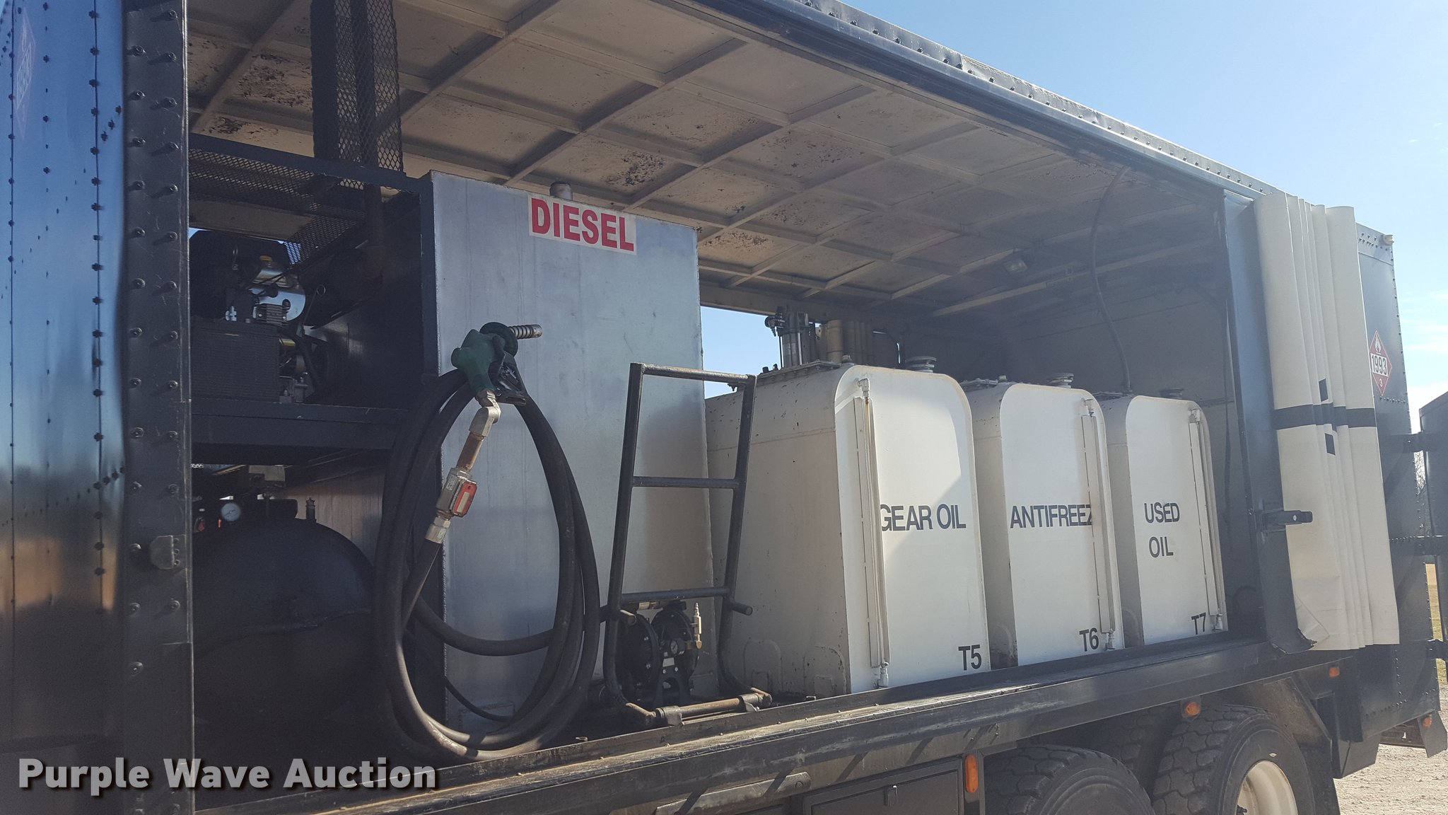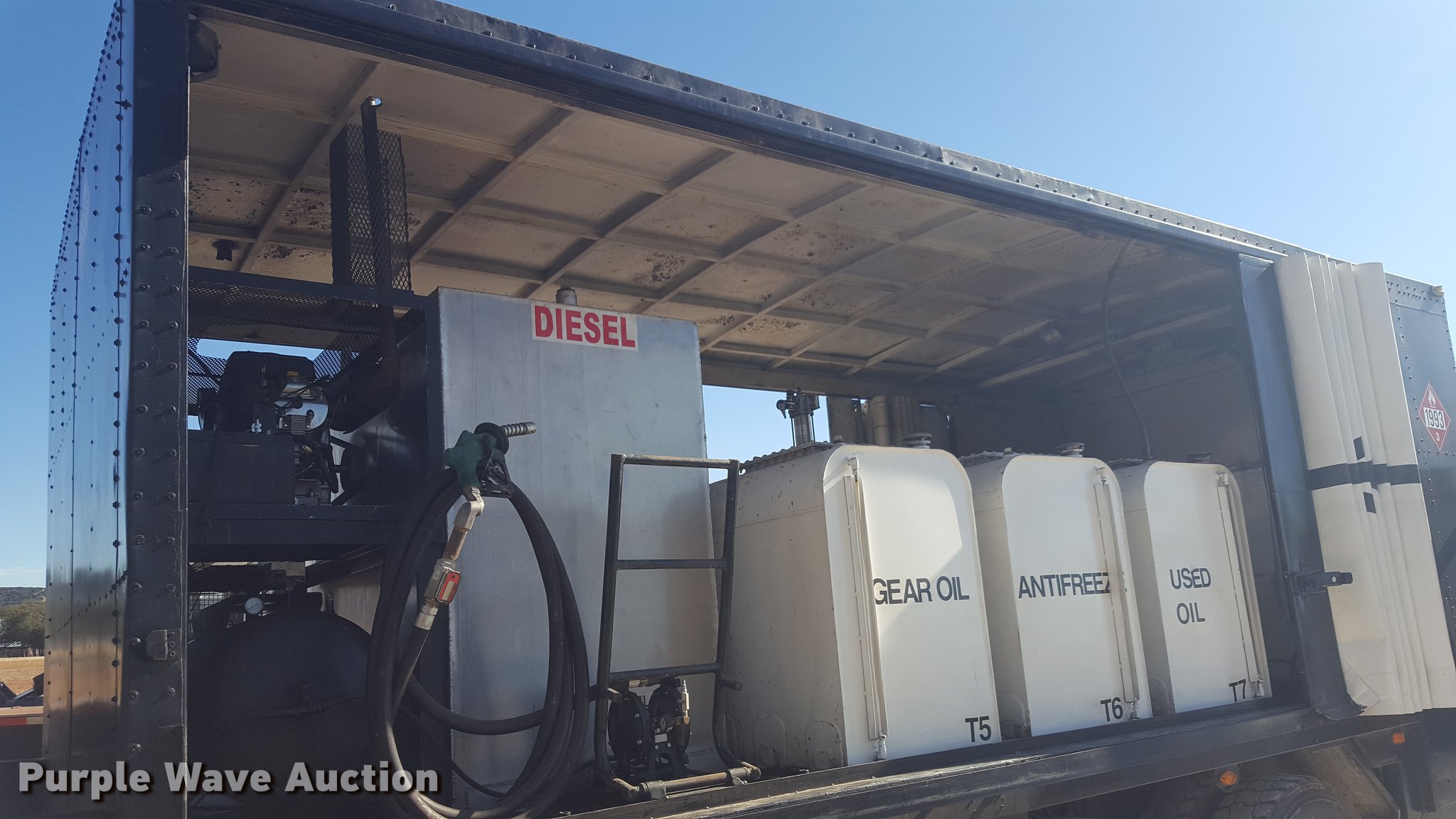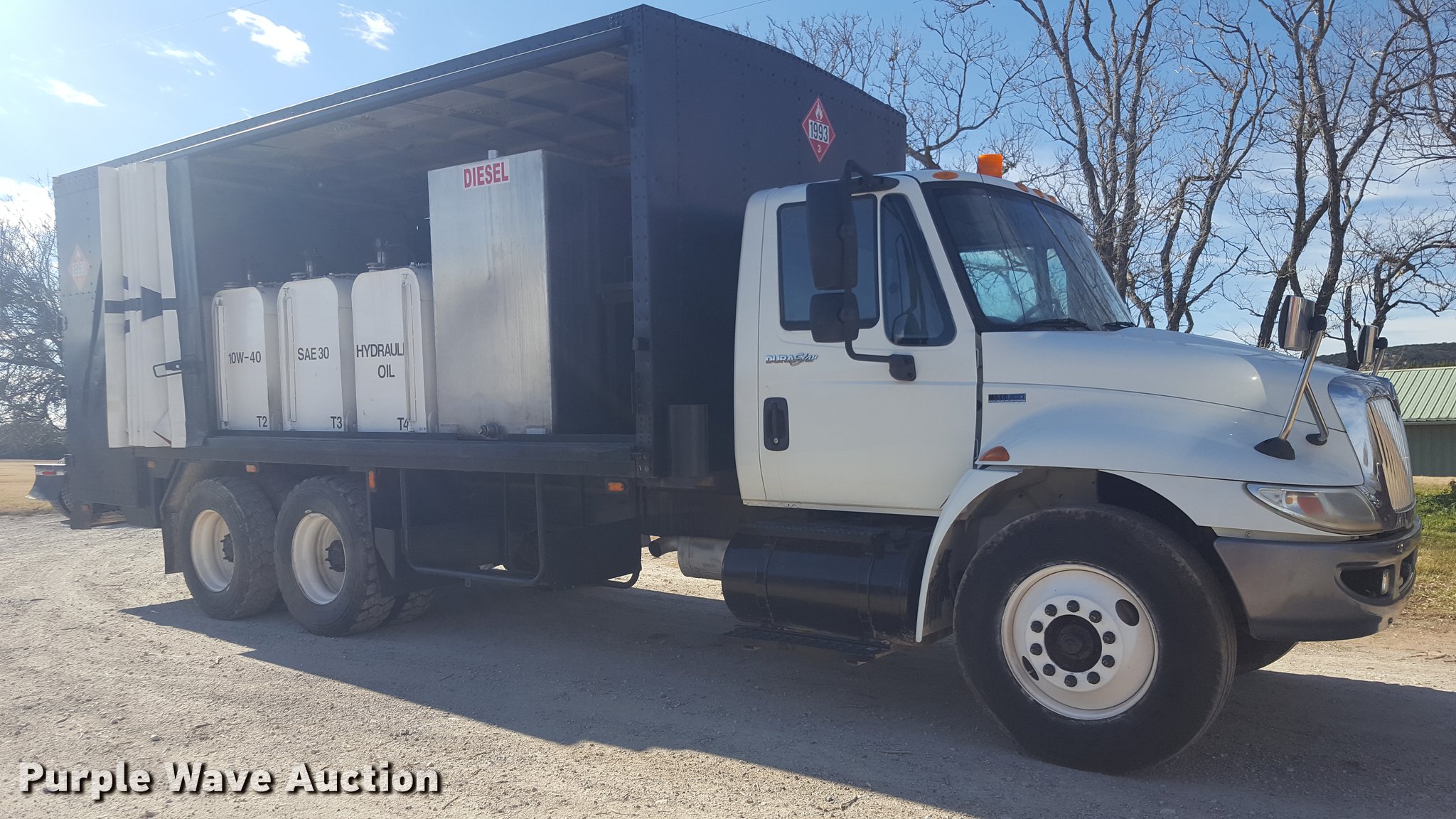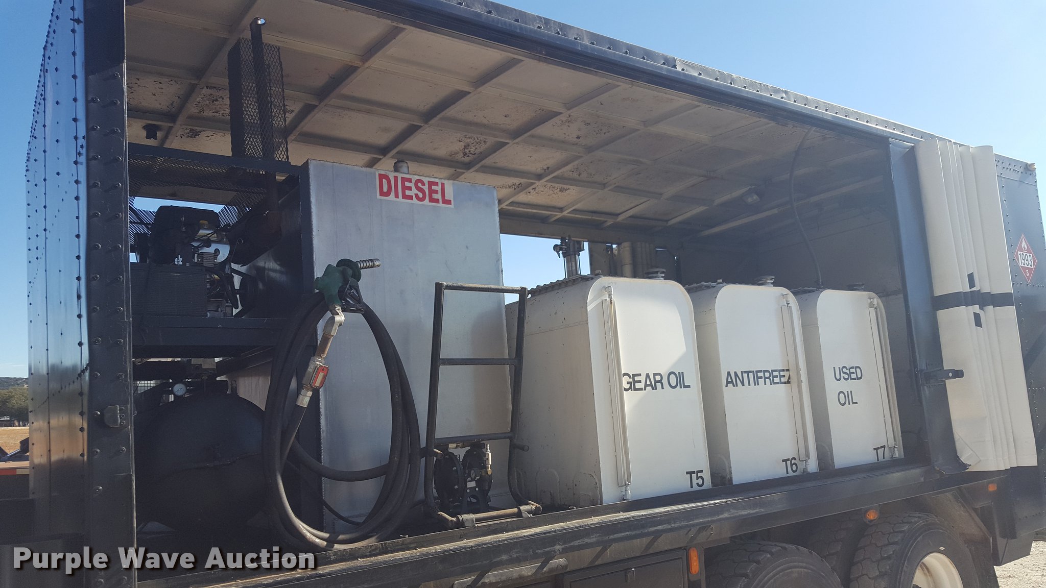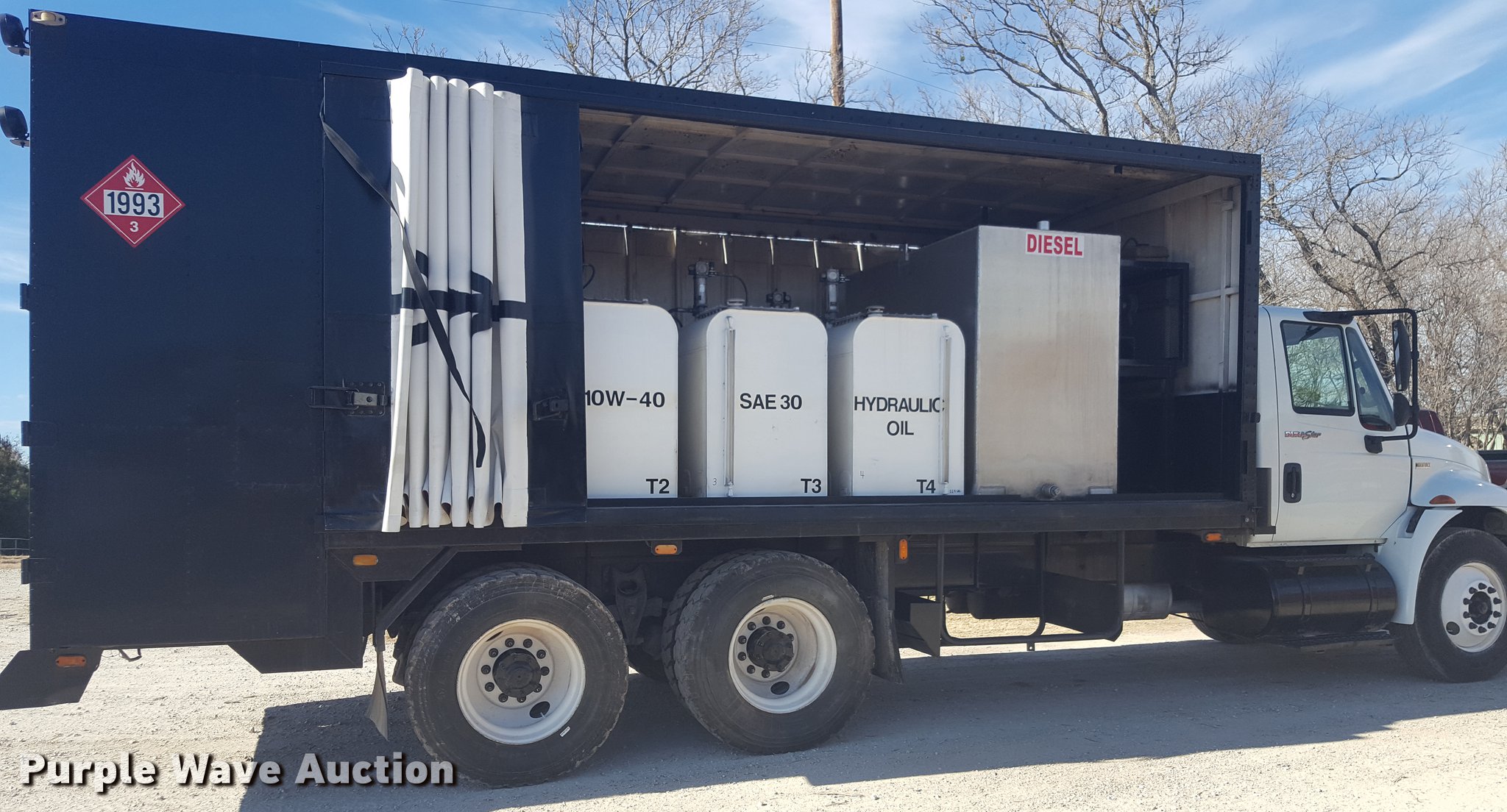 Purple Wave is selling a used Service Truck in Texas. This item is a 2012 International 4400 service truck with the following: 27,115 miles on odometer, International DT530 8.7L L6 turbo diesel engine, Eaton Fuller 10 speed manual transmission, Tandem axle, AC and heat, Air suspension seat, Backup alarm, Beacon light, Front tow hooks, Enclosed body service bed, Compartment lights, Work lights, Oil/lube system, 125 gallon oil reservoir, 750 gallon diesel fuel tank, Nozzles, Pump, Hydraulic fluid reservoir, Grease reservoir, Used oil reservoir, Hose reels, Metered nozzles, Pneumatic pumps,, Dual fuel tanks, Spring suspension, Air brakes, 12R22.5 front tires, 11R22.5 rear tires