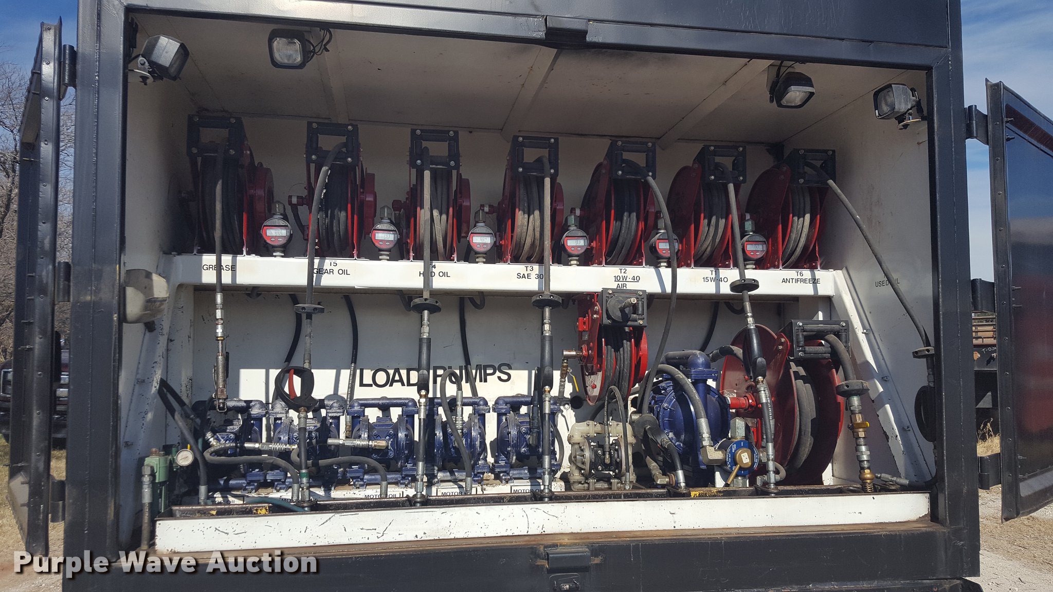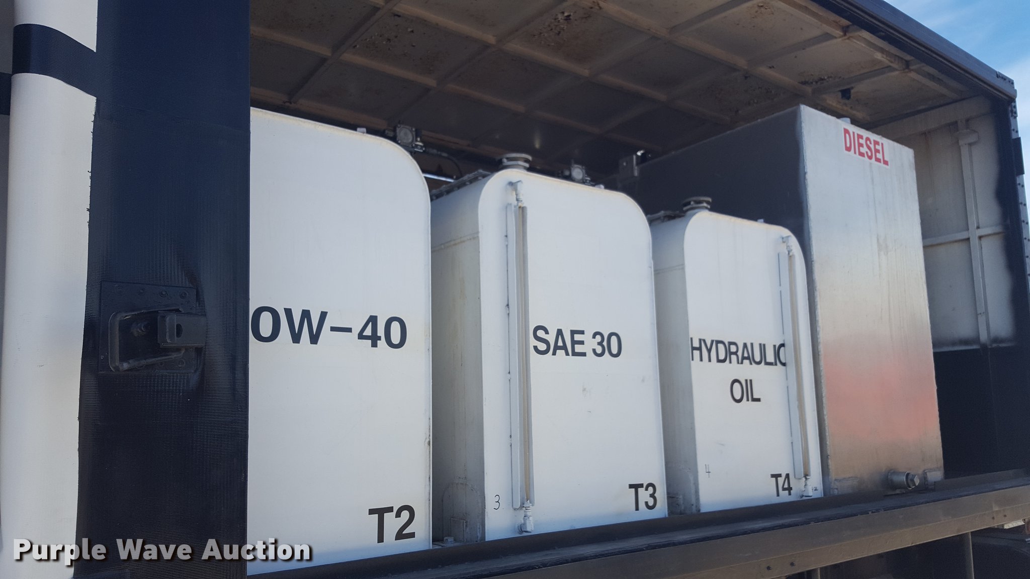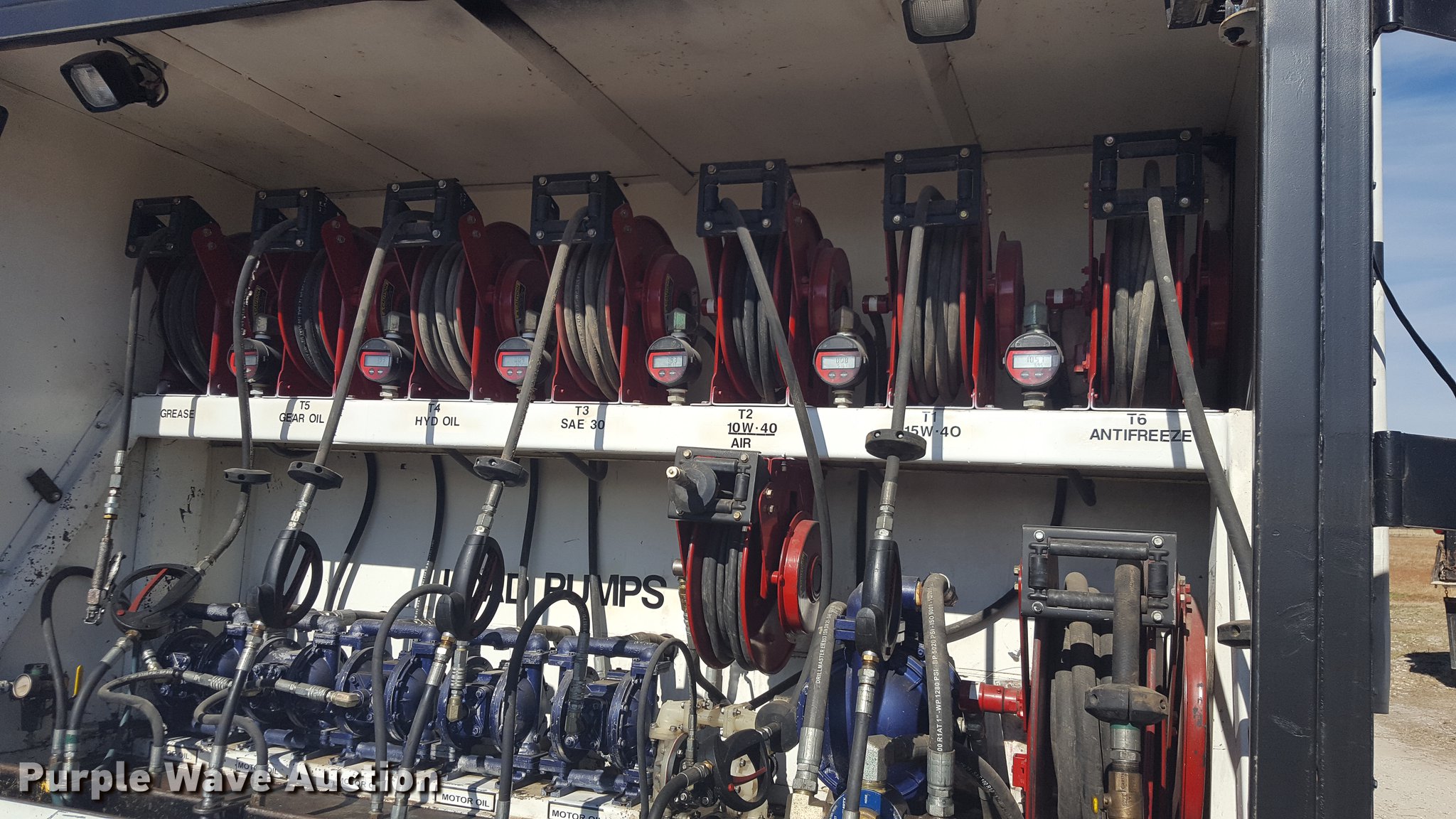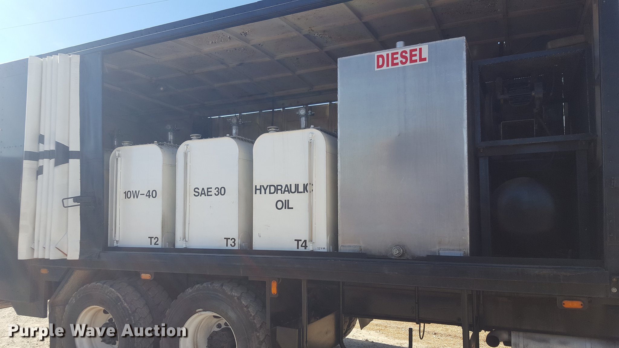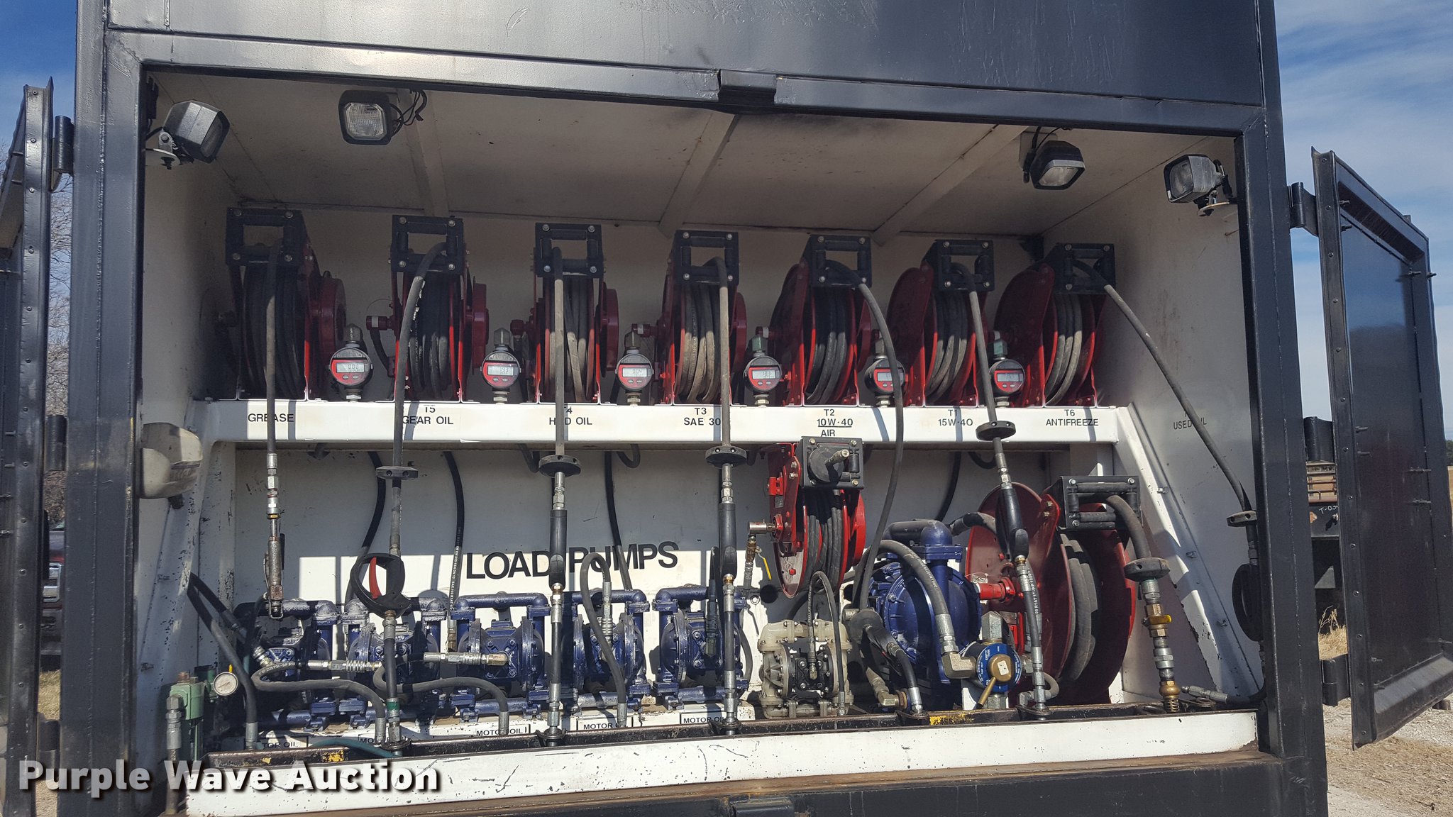 Purple Wave is selling a used Service Truck in Texas. This item is a 2012 International 4400 service truck with the following: 27,115 miles on odometer, International DT530 8.7L L6 turbo diesel engine, Eaton Fuller 10 speed manual transmission, Tandem axle, AC and heat, Air suspension seat, Backup alarm, Beacon light, Front tow hooks, Enclosed body service bed, Compartment lights, Work lights, Oil/lube system, 125 gallon oil reservoir, 750 gallon diesel fuel tank, Nozzles, Pump, Hydraulic fluid reservoir, Grease reservoir, Used oil reservoir, Hose reels, Metered nozzles, Pneumatic pumps,, Dual fuel tanks, Spring suspension, Air brakes, 12R22.5 front tires, 11R22.5 rear tires