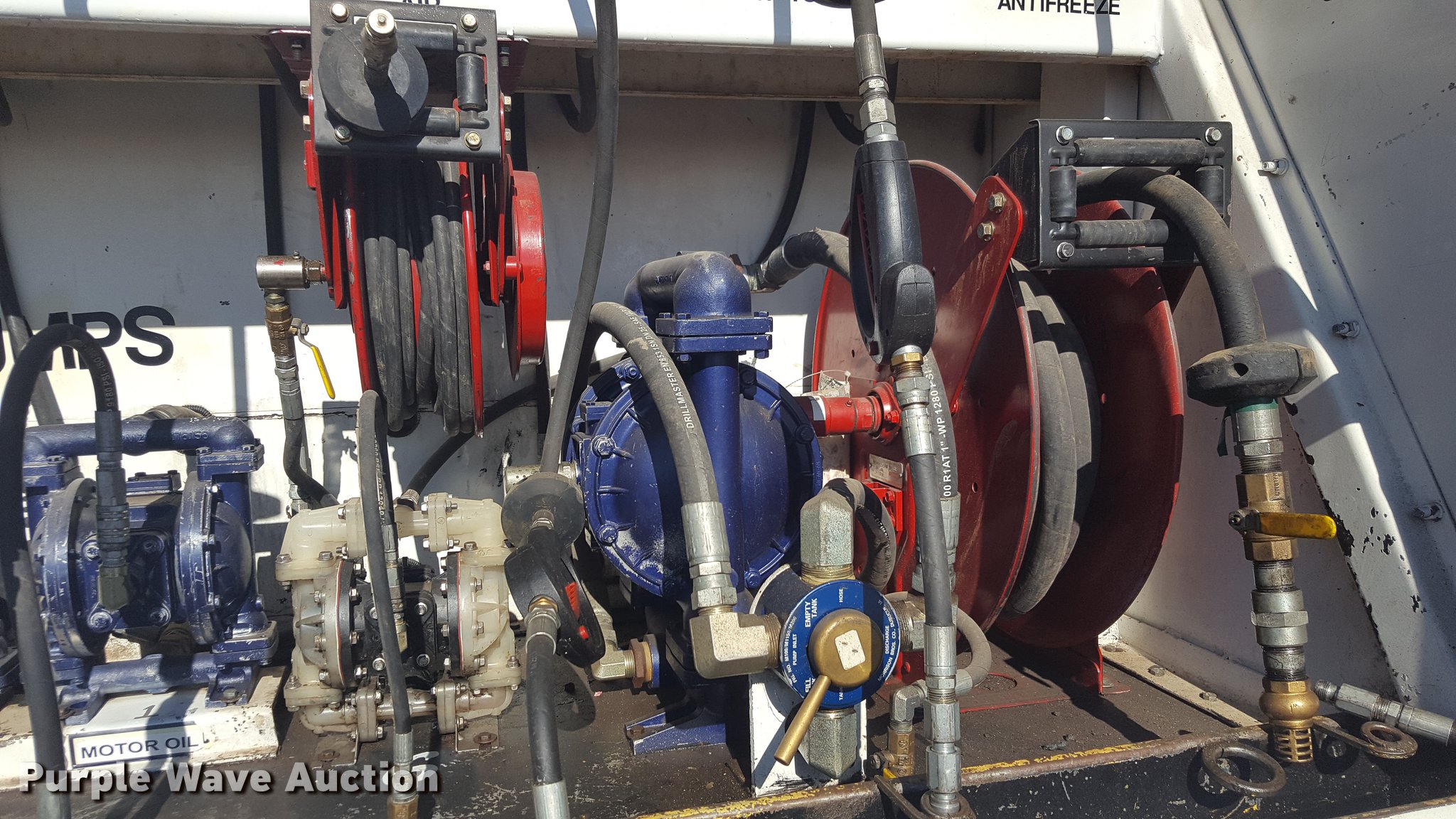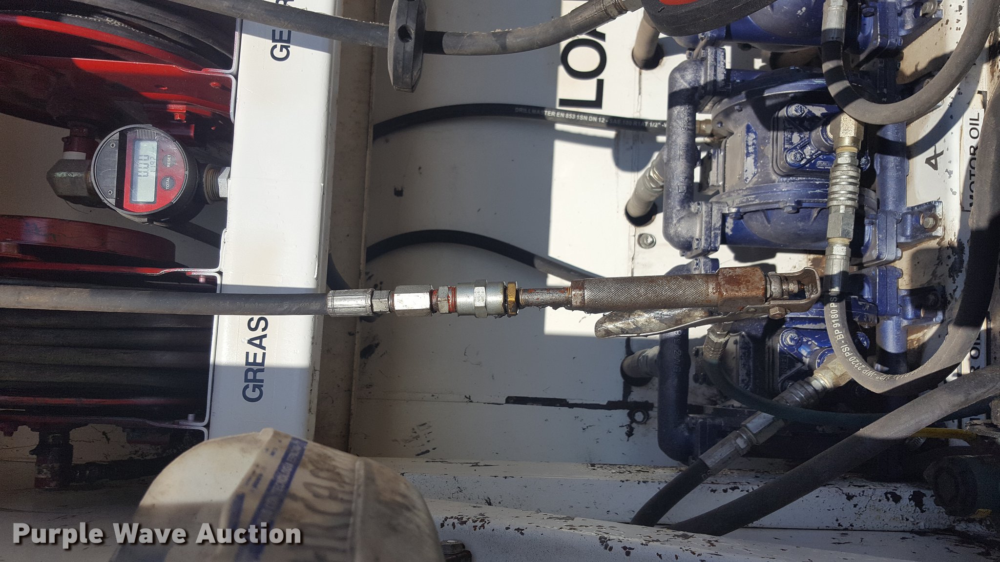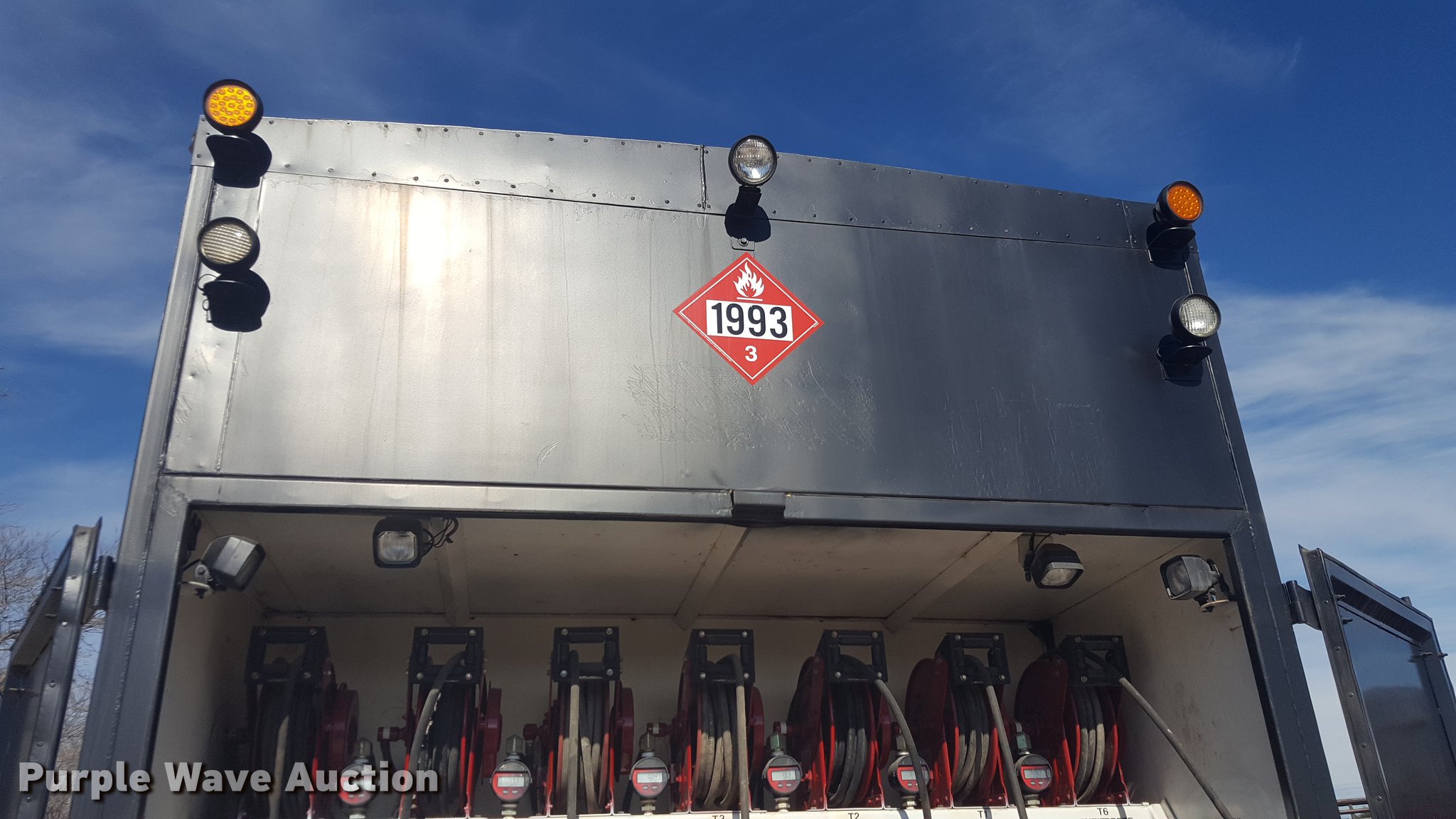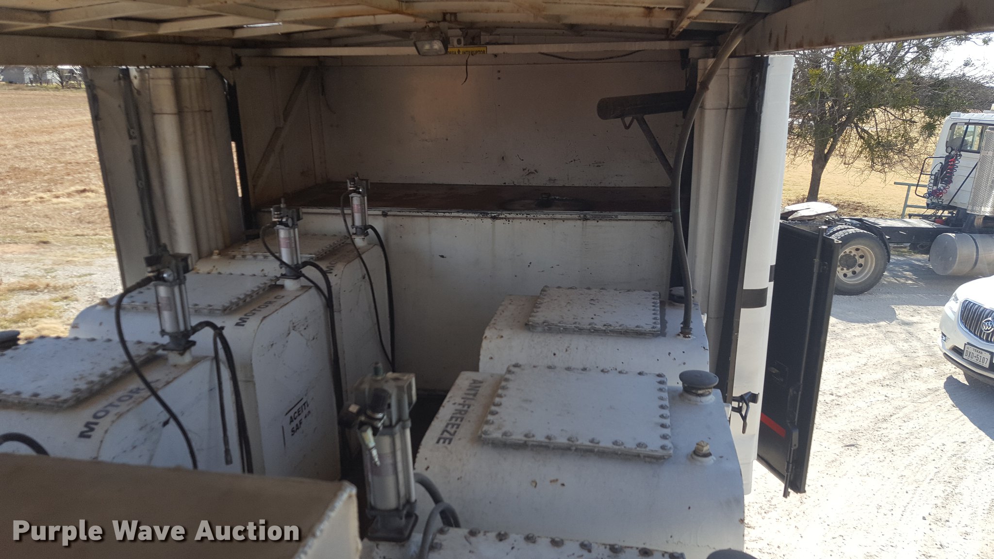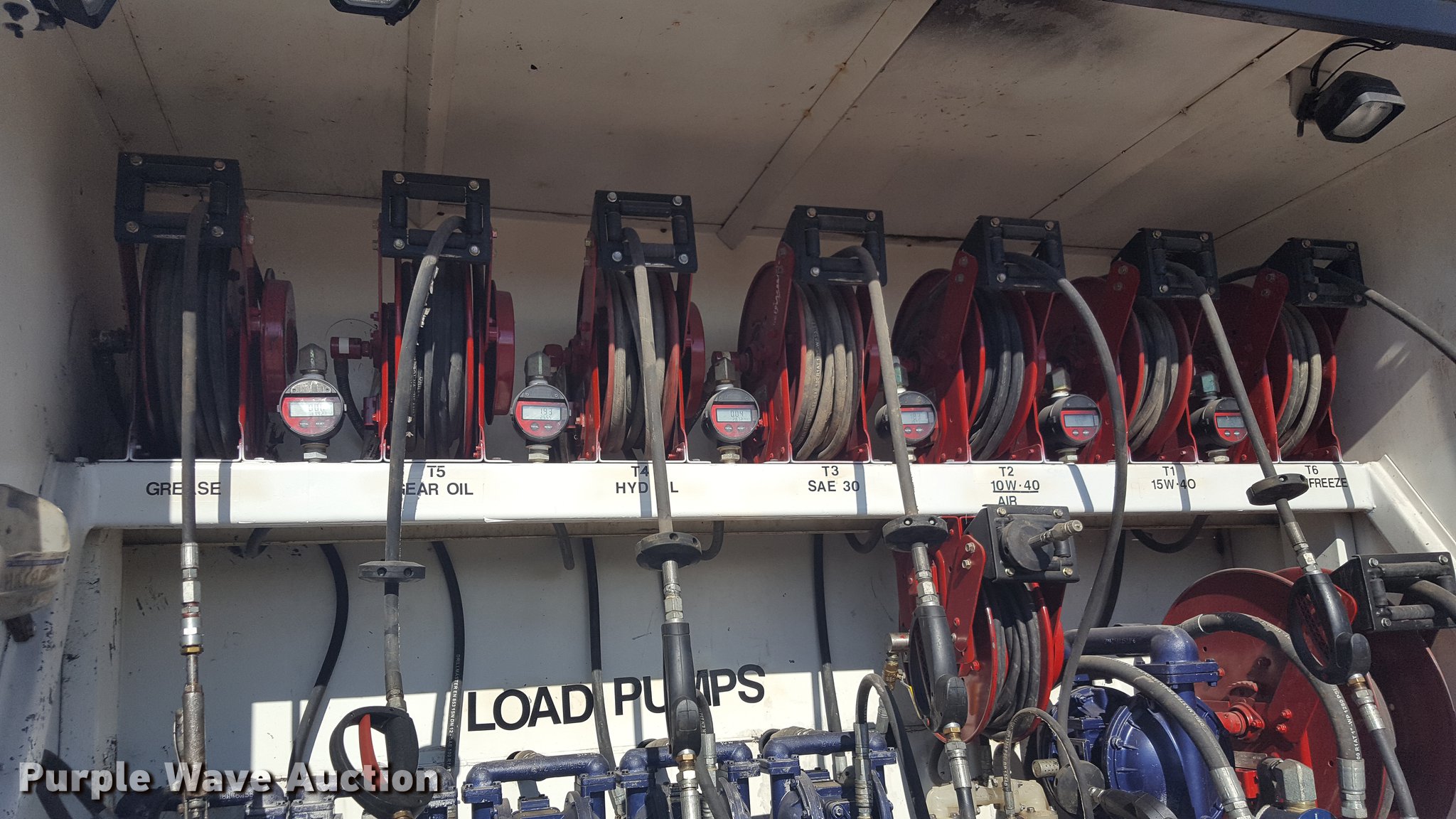 Purple Wave is selling a used Service Truck in Texas. This item is a 2012 International 4400 service truck with the following: 27,115 miles on odometer, International DT530 8.7L L6 turbo diesel engine, Eaton Fuller 10 speed manual transmission, Tandem axle, AC and heat, Air suspension seat, Backup alarm, Beacon light, Front tow hooks, Enclosed body service bed, Compartment lights, Work lights, Oil/lube system, 125 gallon oil reservoir, 750 gallon diesel fuel tank, Nozzles, Pump, Hydraulic fluid reservoir, Grease reservoir, Used oil reservoir, Hose reels, Metered nozzles, Pneumatic pumps,, Dual fuel tanks, Spring suspension, Air brakes, 12R22.5 front tires, 11R22.5 rear tires