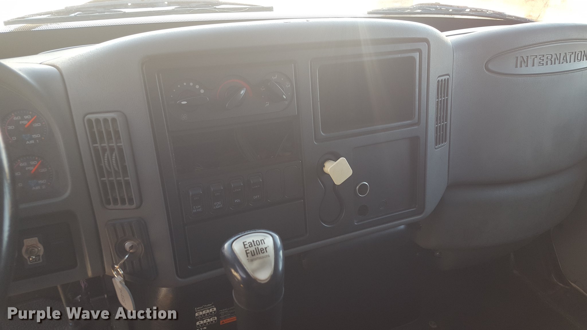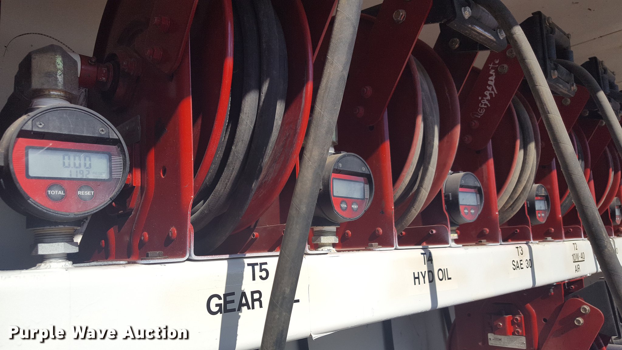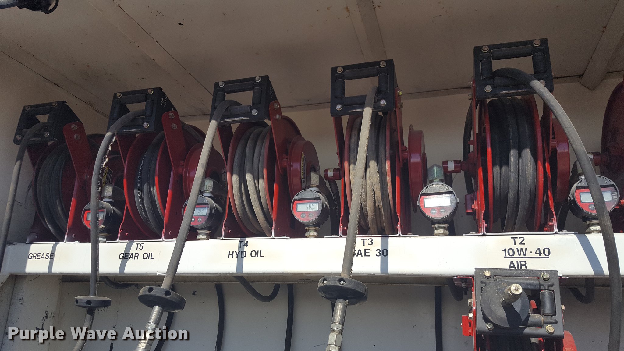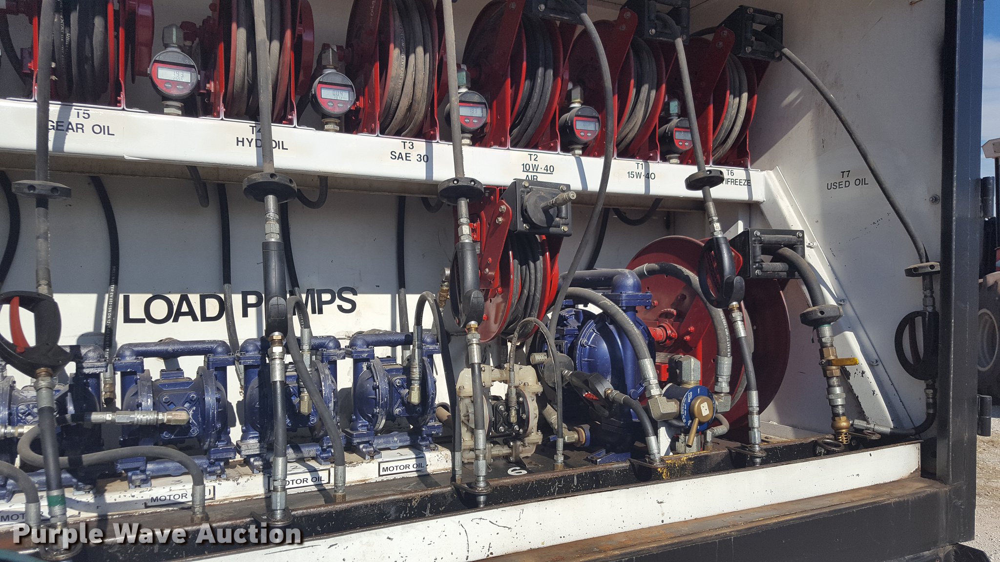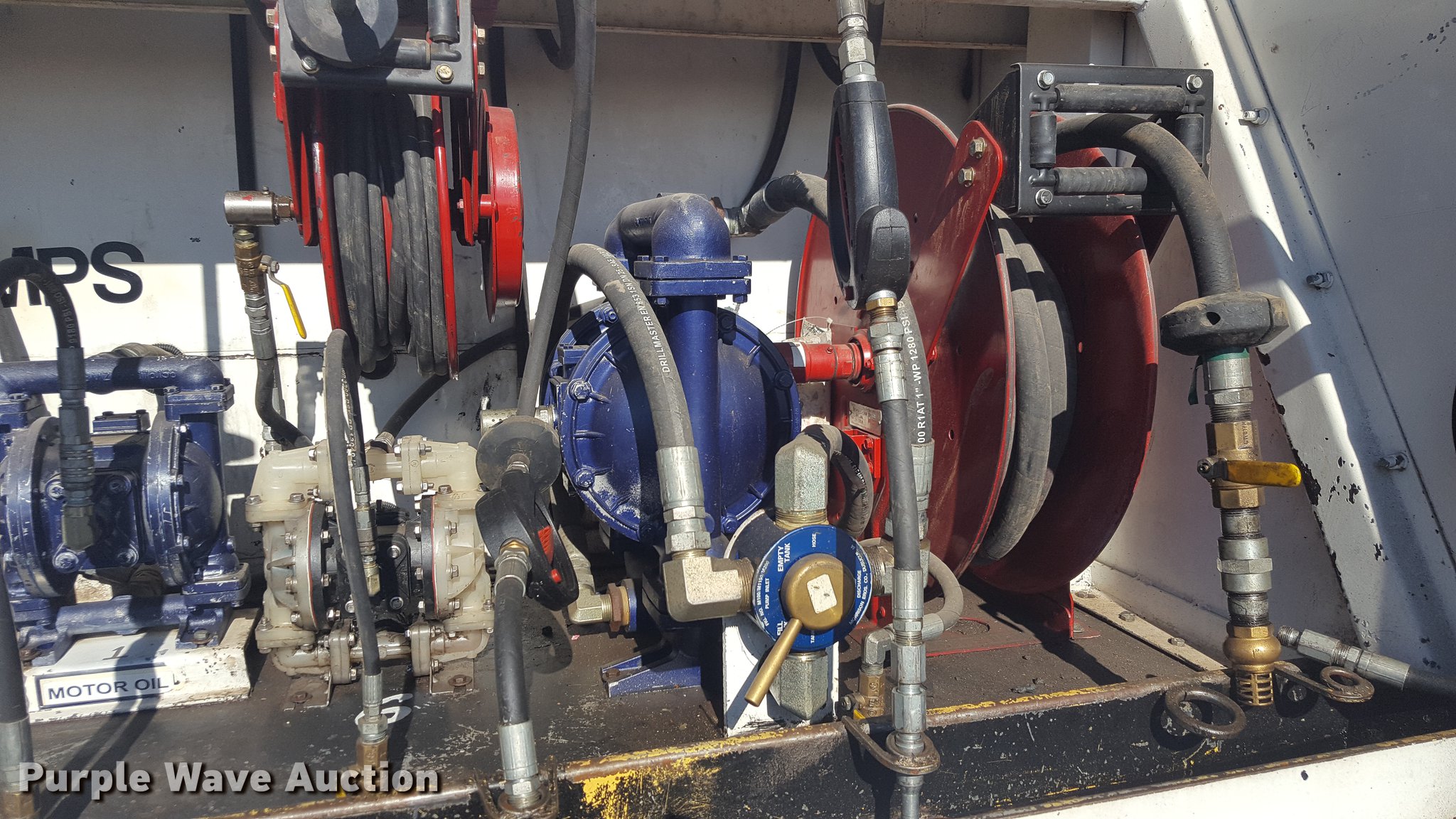 Purple Wave is selling a used Service Truck in Texas. This item is a 2012 International 4400 service truck with the following: 27,115 miles on odometer, International DT530 8.7L L6 turbo diesel engine, Eaton Fuller 10 speed manual transmission, Tandem axle, AC and heat, Air suspension seat, Backup alarm, Beacon light, Front tow hooks, Enclosed body service bed, Compartment lights, Work lights, Oil/lube system, 125 gallon oil reservoir, 750 gallon diesel fuel tank, Nozzles, Pump, Hydraulic fluid reservoir, Grease reservoir, Used oil reservoir, Hose reels, Metered nozzles, Pneumatic pumps,, Dual fuel tanks, Spring suspension, Air brakes, 12R22.5 front tires, 11R22.5 rear tires
