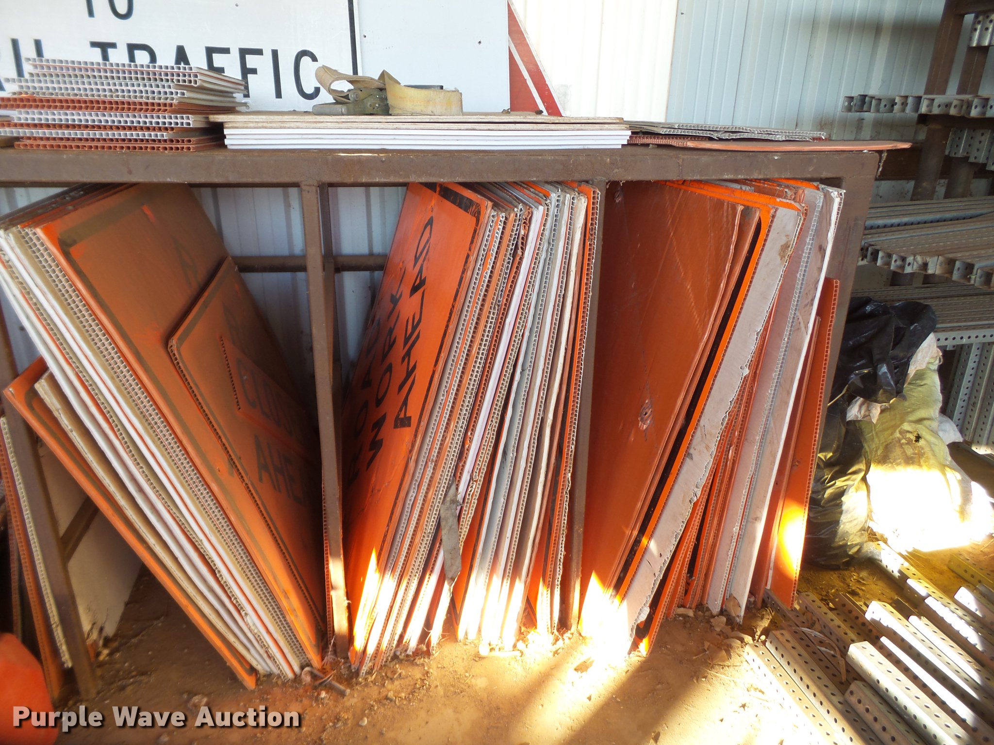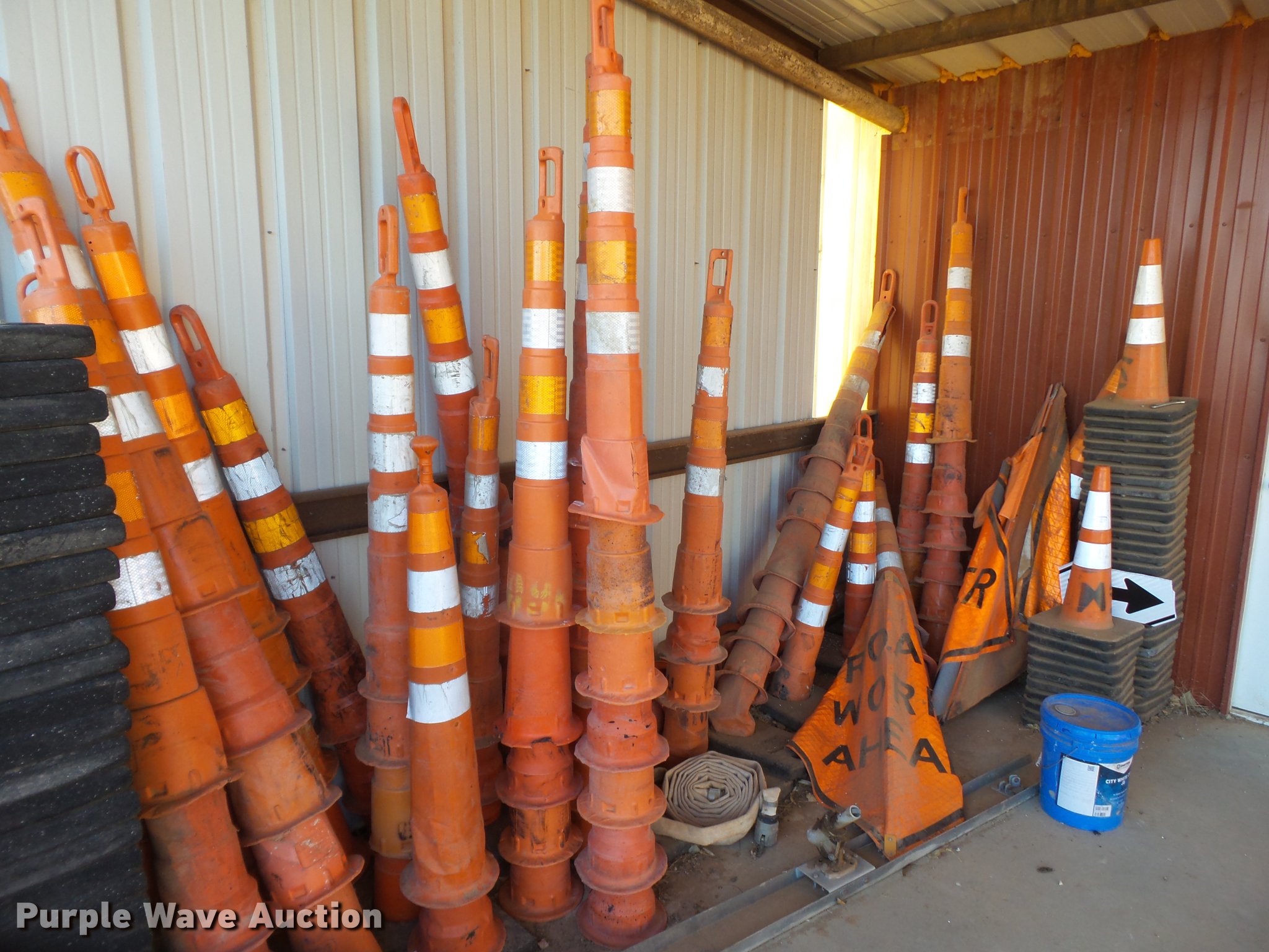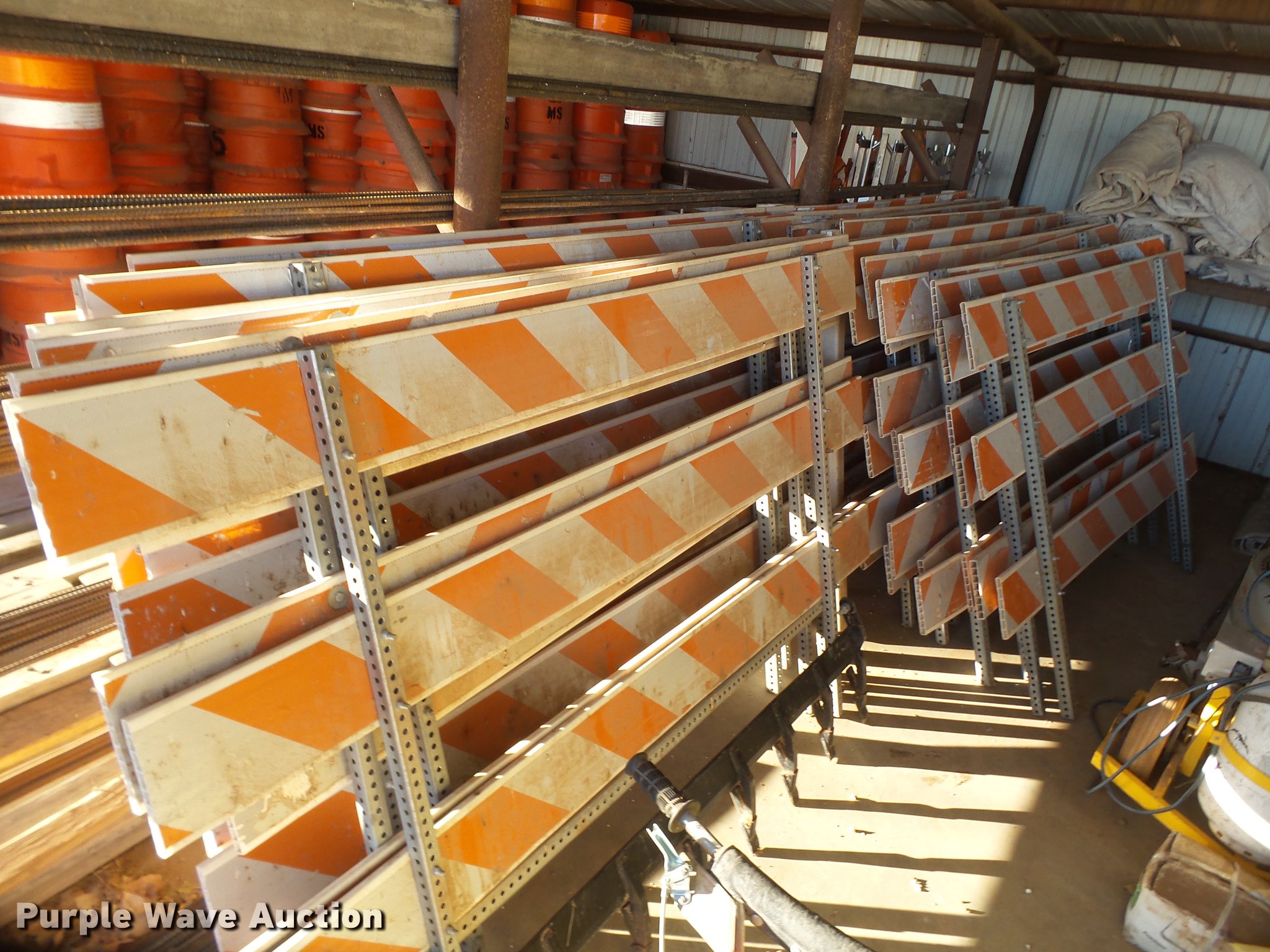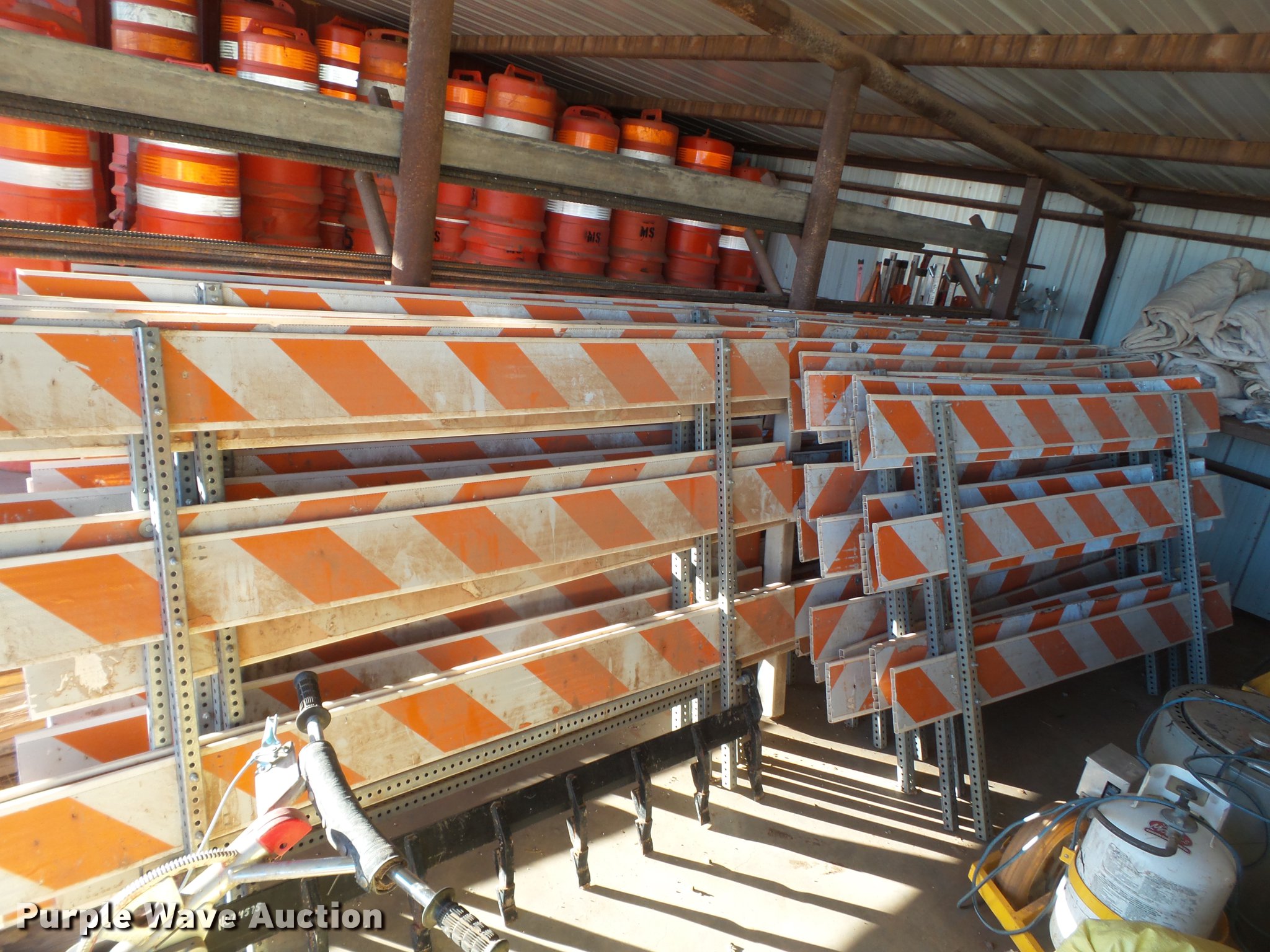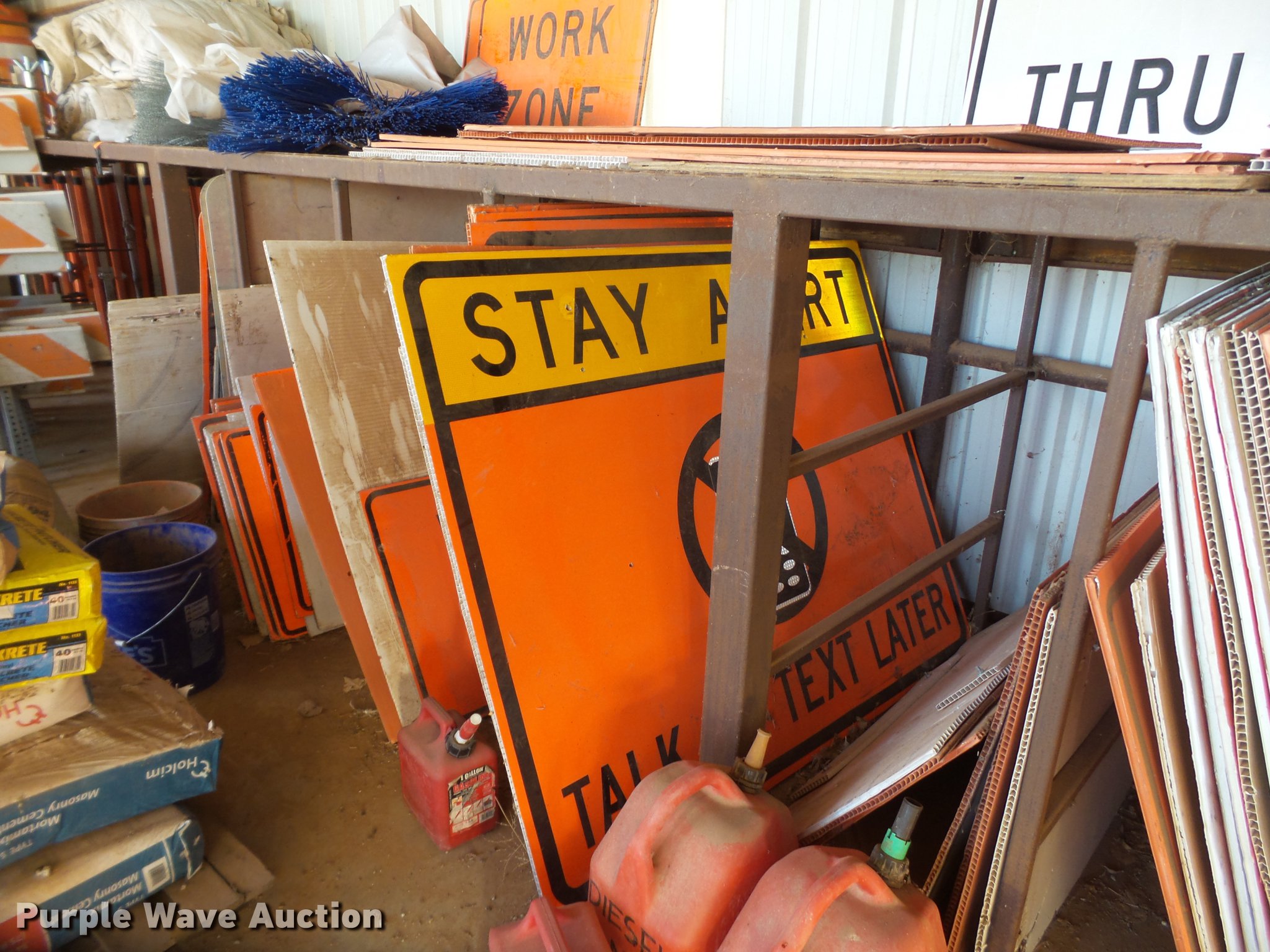 Purple Wave is selling a used Road Safety Equip. in Texas. This item is a Road safety equipment with the following: (133) 4'H T stands, (122) 12"H T stands, (110) 30" braces, (167) legs, 10' to 14'L, (17) type III, Metal braces, (4) type III, 4 x 4 plastic braces, (9) type III with rubber braces, (198) barrels, (252) tire bases, Approximately 130 cones, 4'H, Approximately 300 rubber cone bases, (10) road work ahead signs, 3' x 3', (20) road work ahead signs, 4' x 4', (19) right lane closed signs, 4' x 4', (4) obey warning signs, (23) end road work signs, Roll-up signs, Folding sign bases, Flags, Tape, Stop signs, Markers, Lights, Barrier fence, 174"W x 55"H sign rack