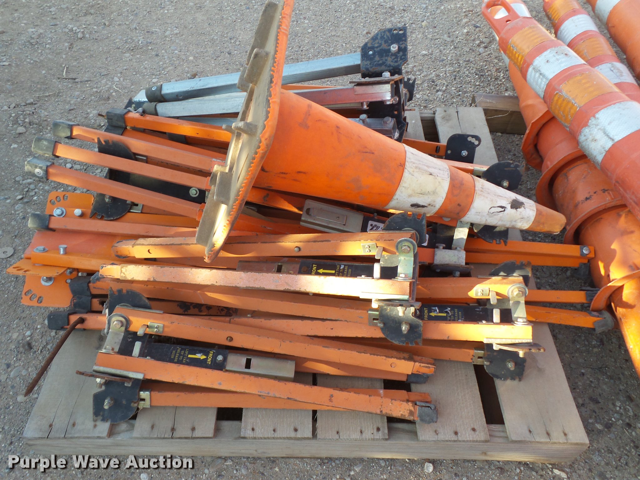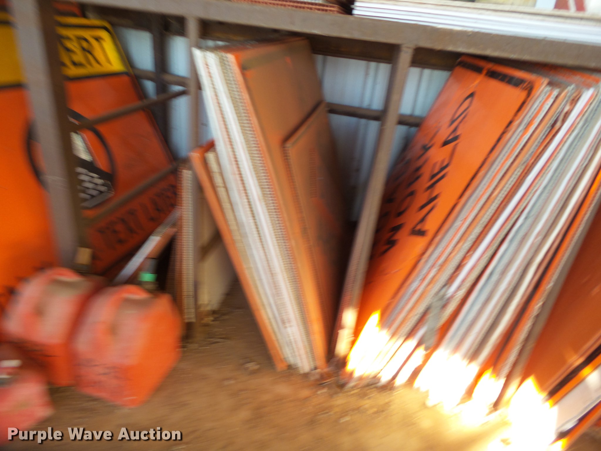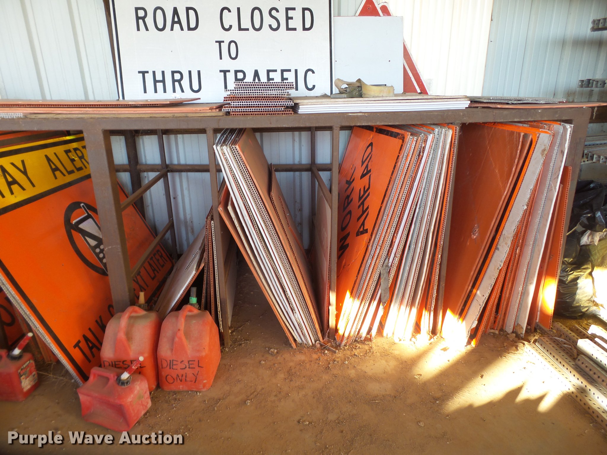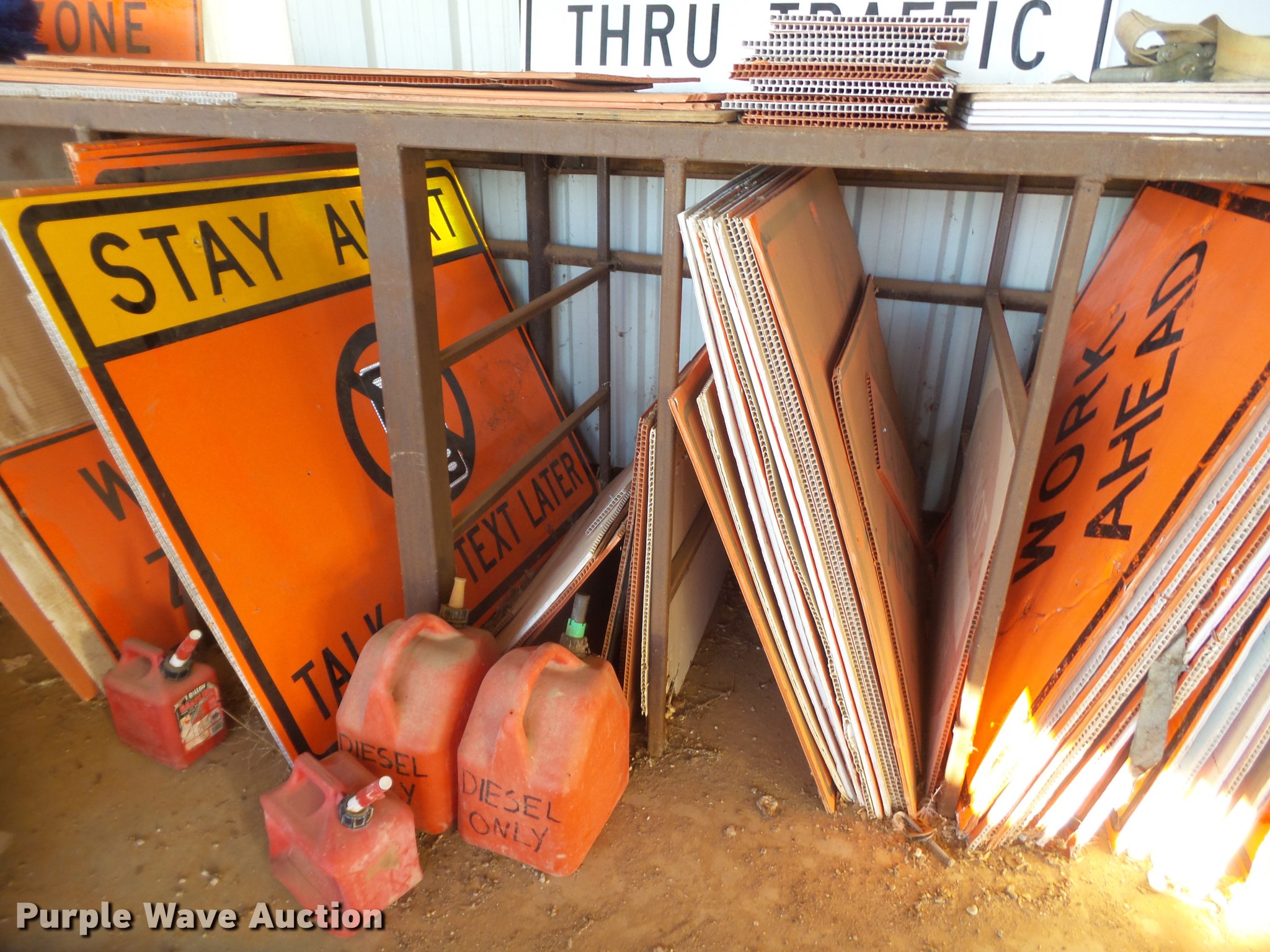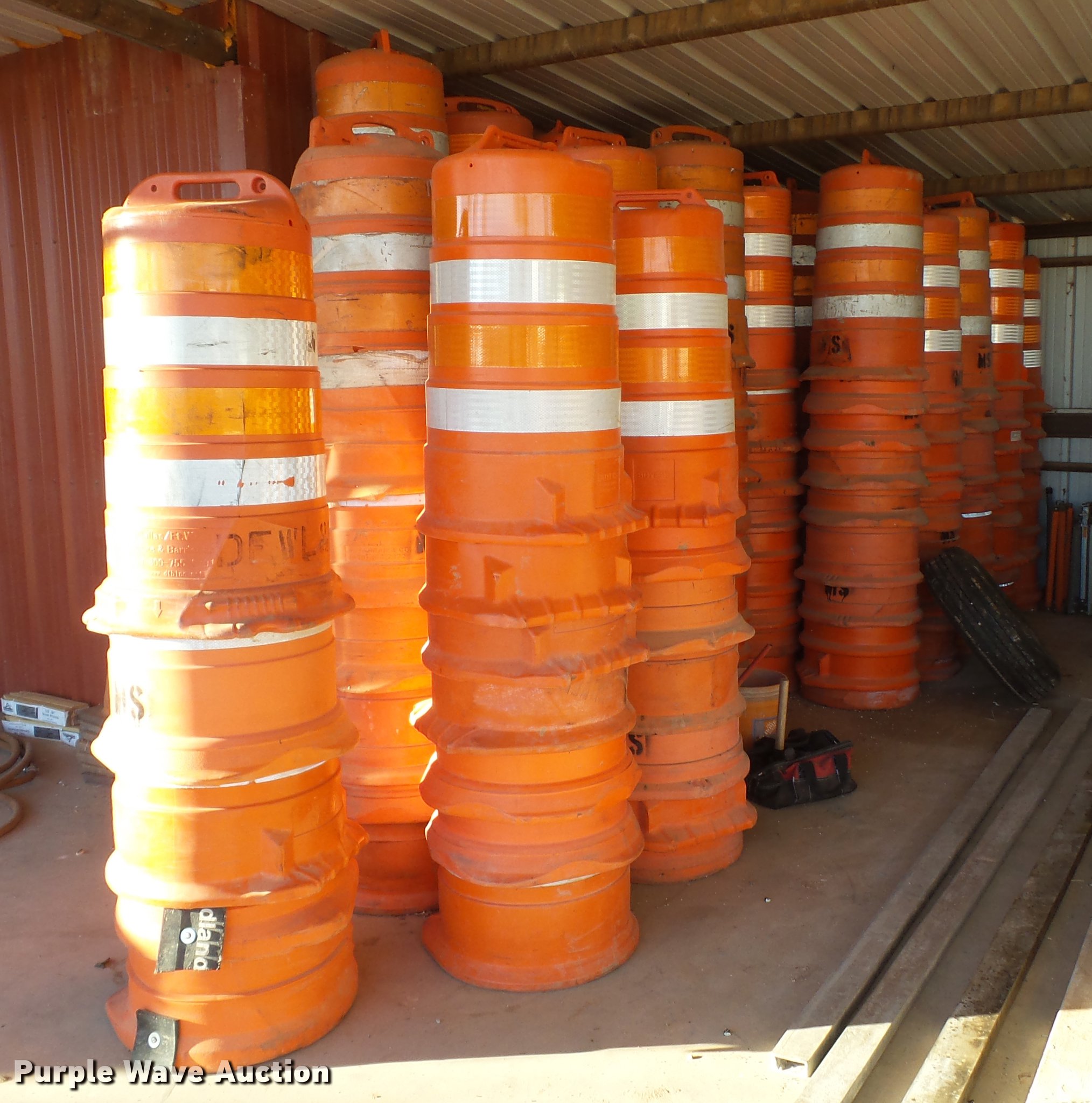 Purple Wave is selling a used Road Safety Equip. in Texas. This item is a Road safety equipment with the following: (133) 4'H T stands, (122) 12"H T stands, (110) 30" braces, (167) legs, 10' to 14'L, (17) type III, Metal braces, (4) type III, 4 x 4 plastic braces, (9) type III with rubber braces, (198) barrels, (252) tire bases, Approximately 130 cones, 4'H, Approximately 300 rubber cone bases, (10) road work ahead signs, 3' x 3', (20) road work ahead signs, 4' x 4', (19) right lane closed signs, 4' x 4', (4) obey warning signs, (23) end road work signs, Roll-up signs, Folding sign bases, Flags, Tape, Stop signs, Markers, Lights, Barrier fence, 174"W x 55"H sign rack