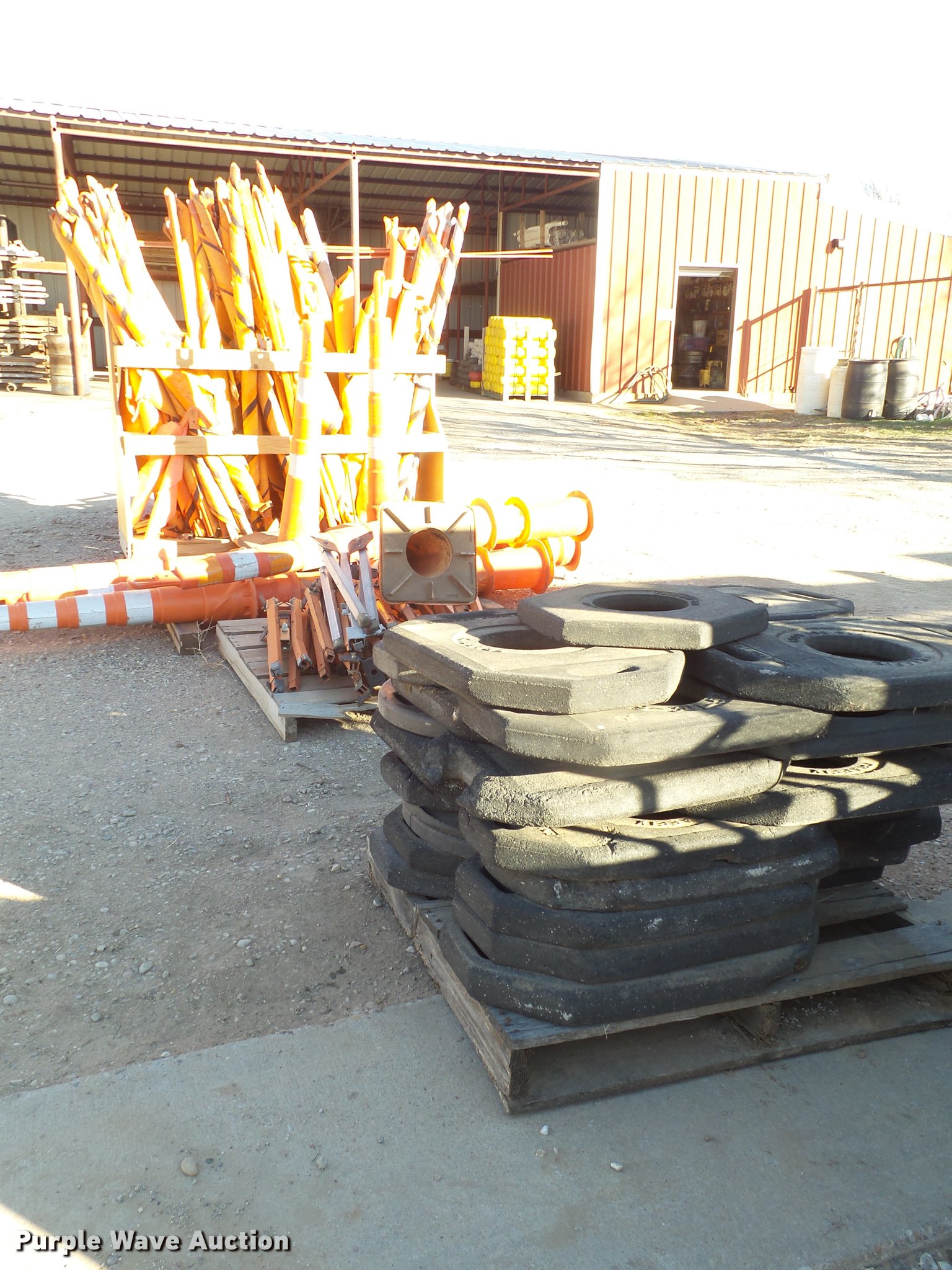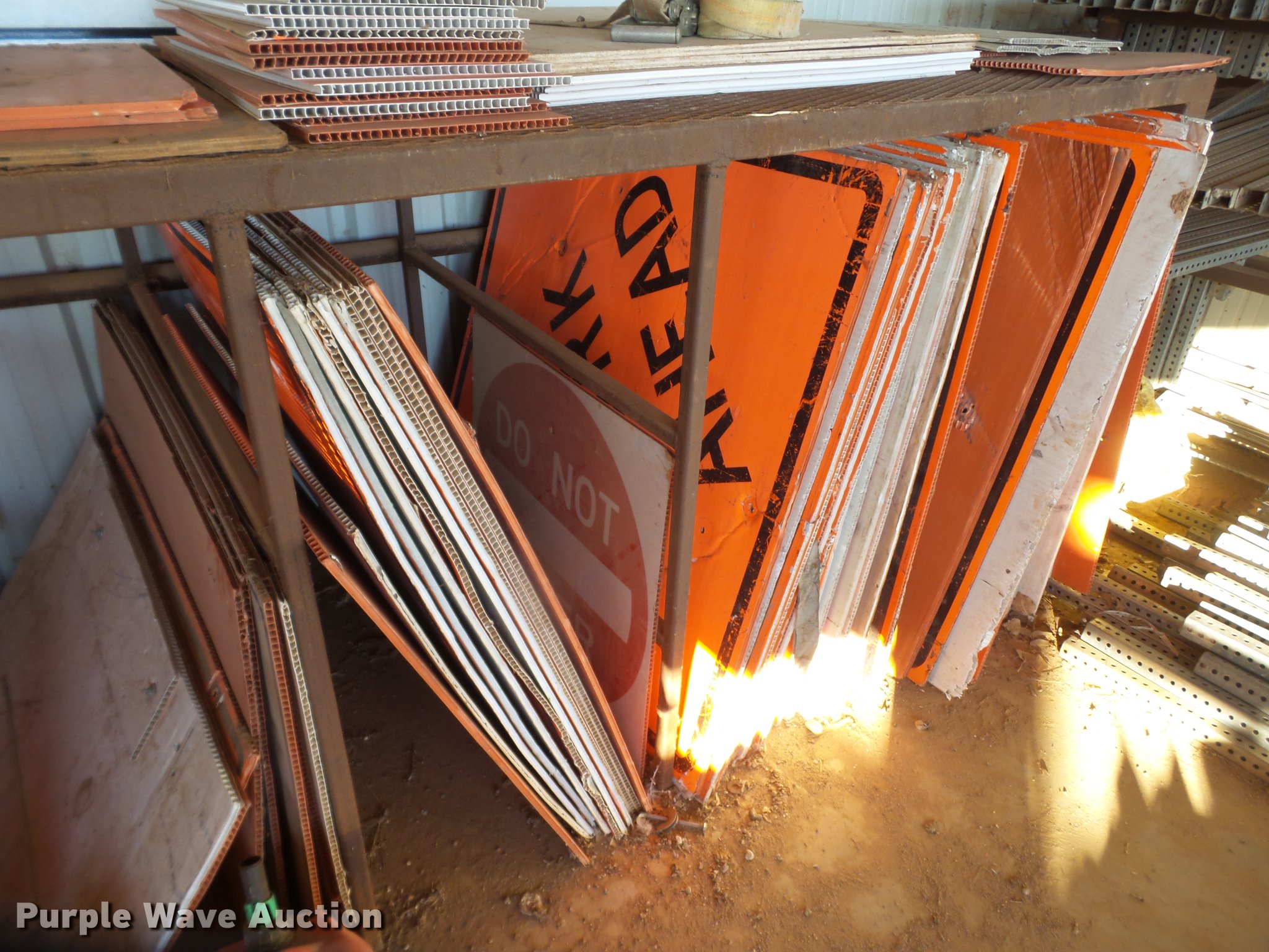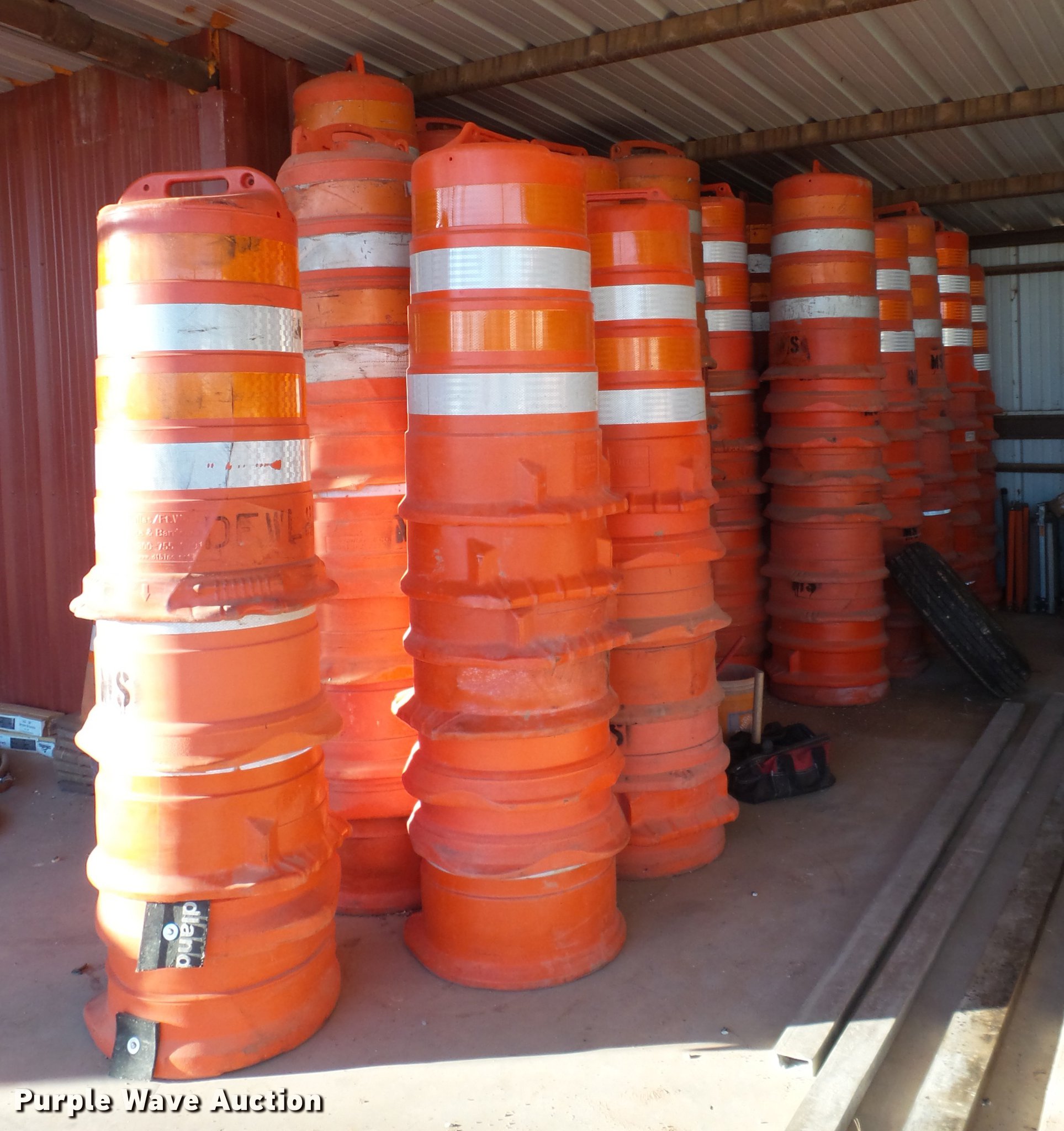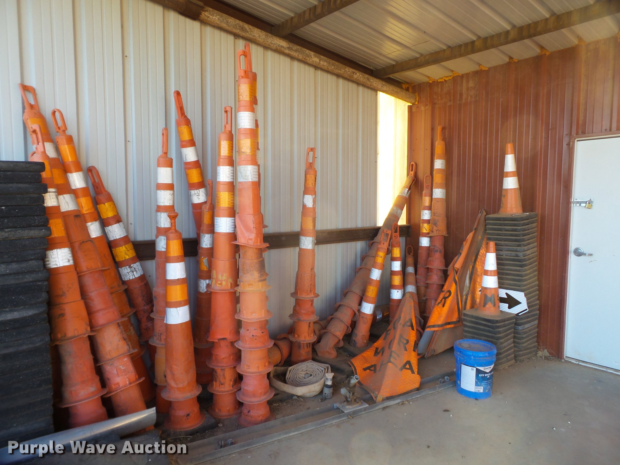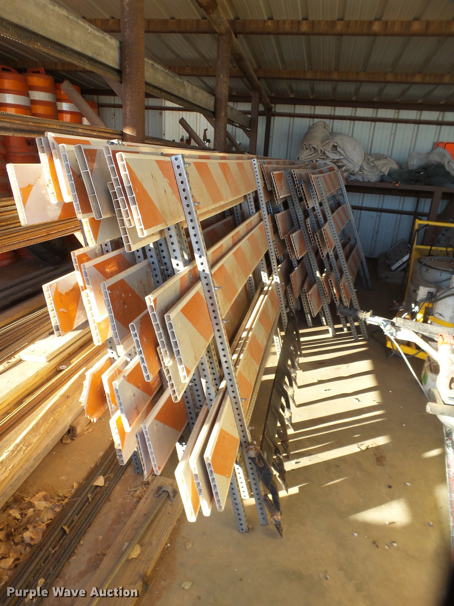 Purple Wave is selling a used Road Safety Equip. in Texas. This item is a Road safety equipment with the following: (133) 4'H T stands, (122) 12"H T stands, (110) 30" braces, (167) legs, 10' to 14'L, (17) type III, Metal braces, (4) type III, 4 x 4 plastic braces, (9) type III with rubber braces, (198) barrels, (252) tire bases, Approximately 130 cones, 4'H, Approximately 300 rubber cone bases, (10) road work ahead signs, 3' x 3', (20) road work ahead signs, 4' x 4', (19) right lane closed signs, 4' x 4', (4) obey warning signs, (23) end road work signs, Roll-up signs, Folding sign bases, Flags, Tape, Stop signs, Markers, Lights, Barrier fence, 174"W x 55"H sign rack
