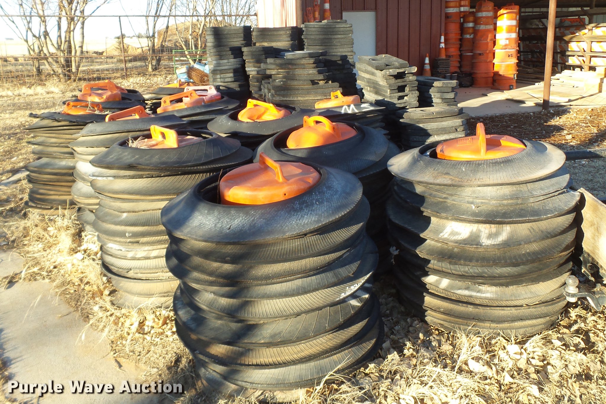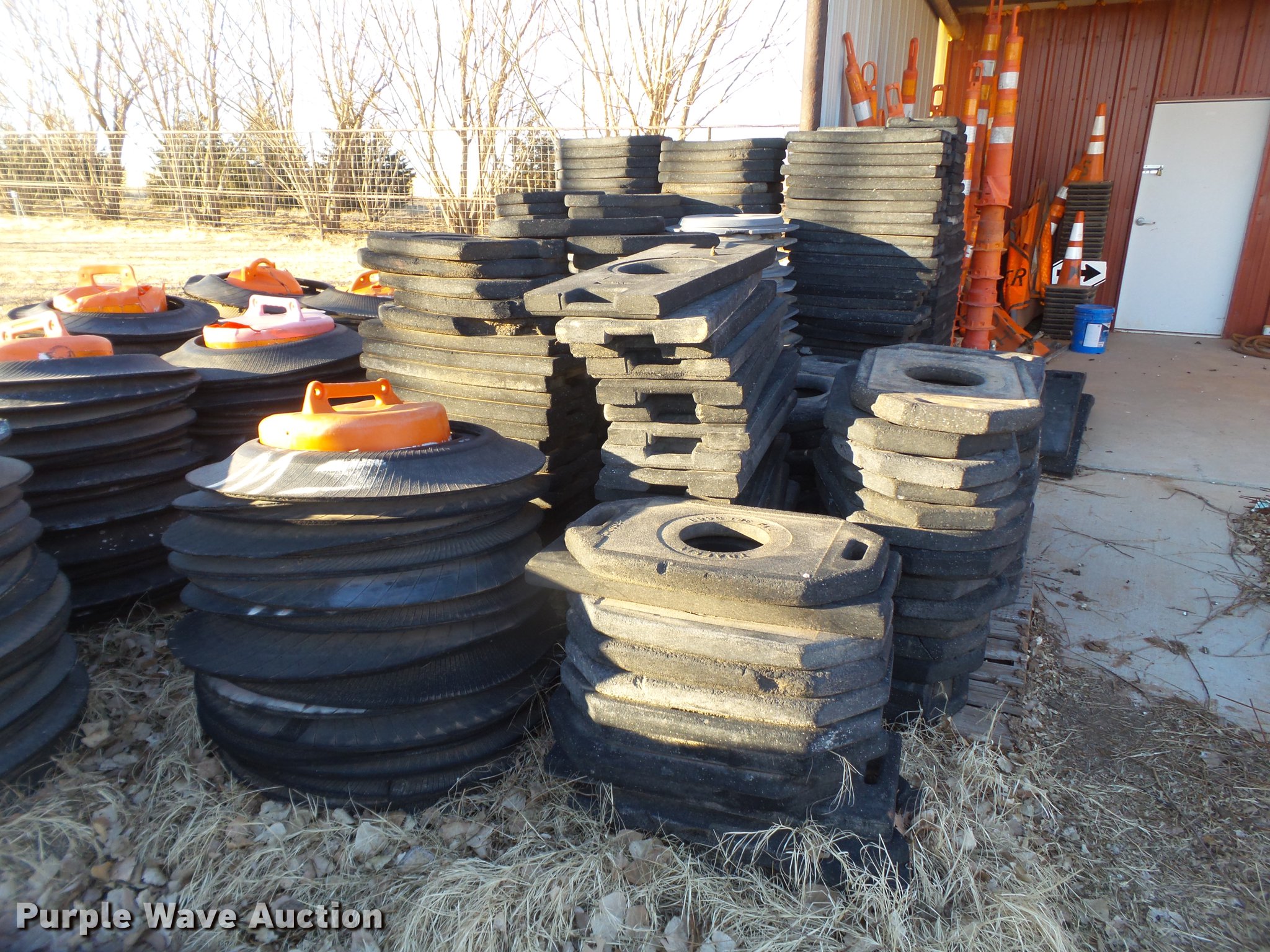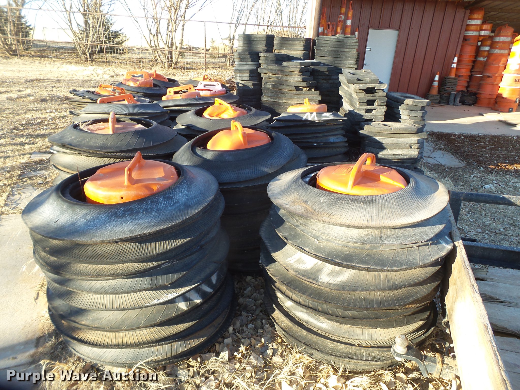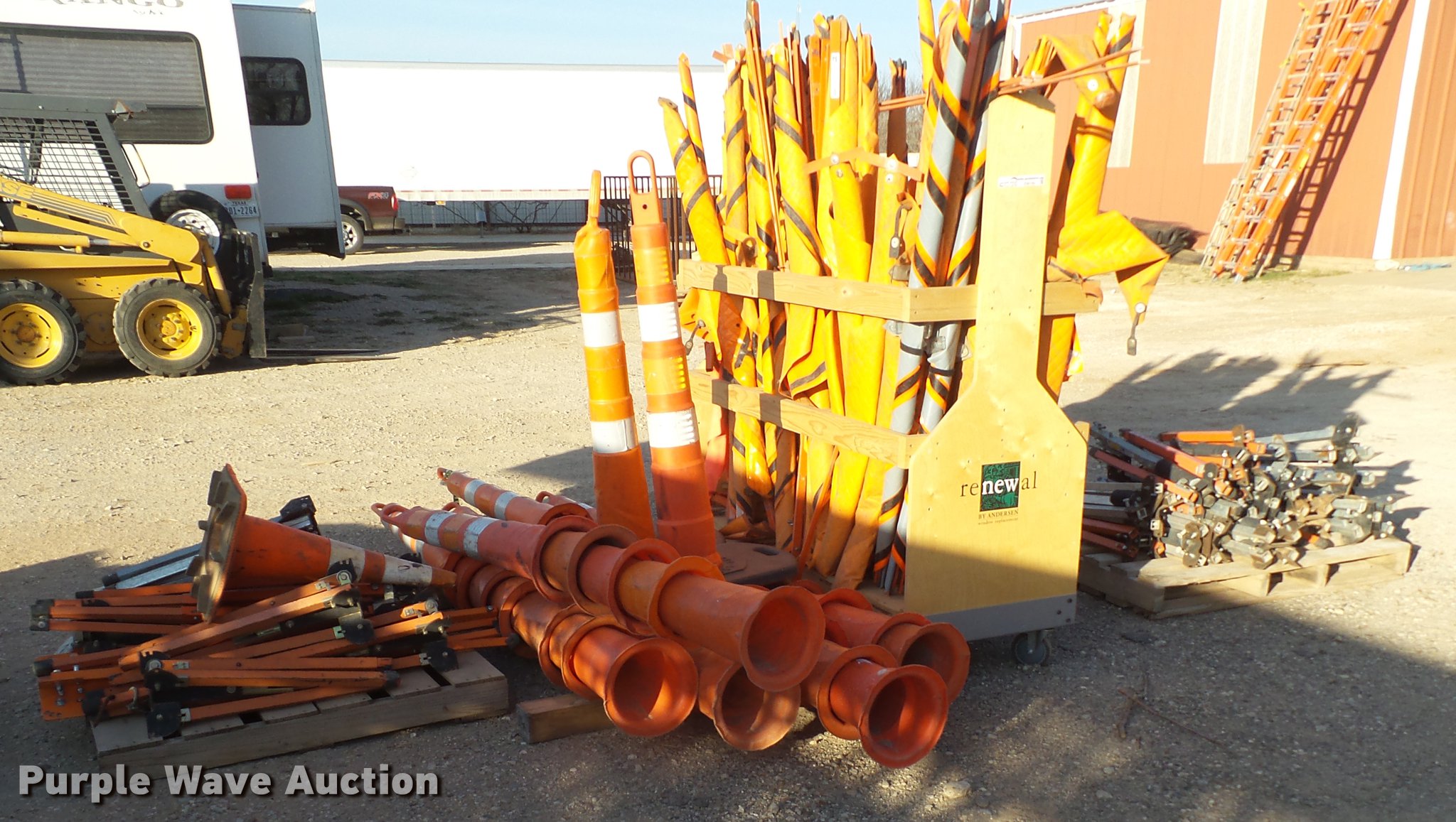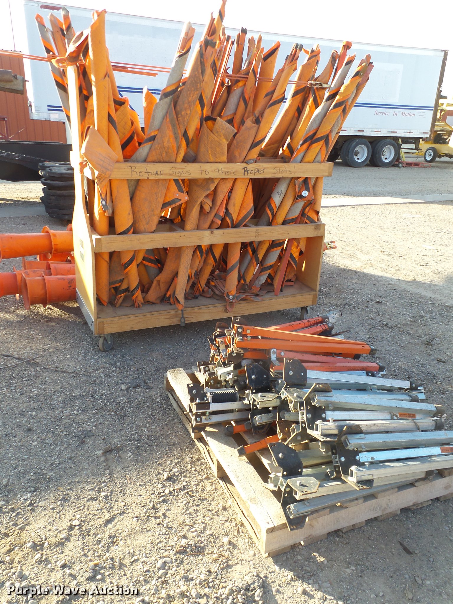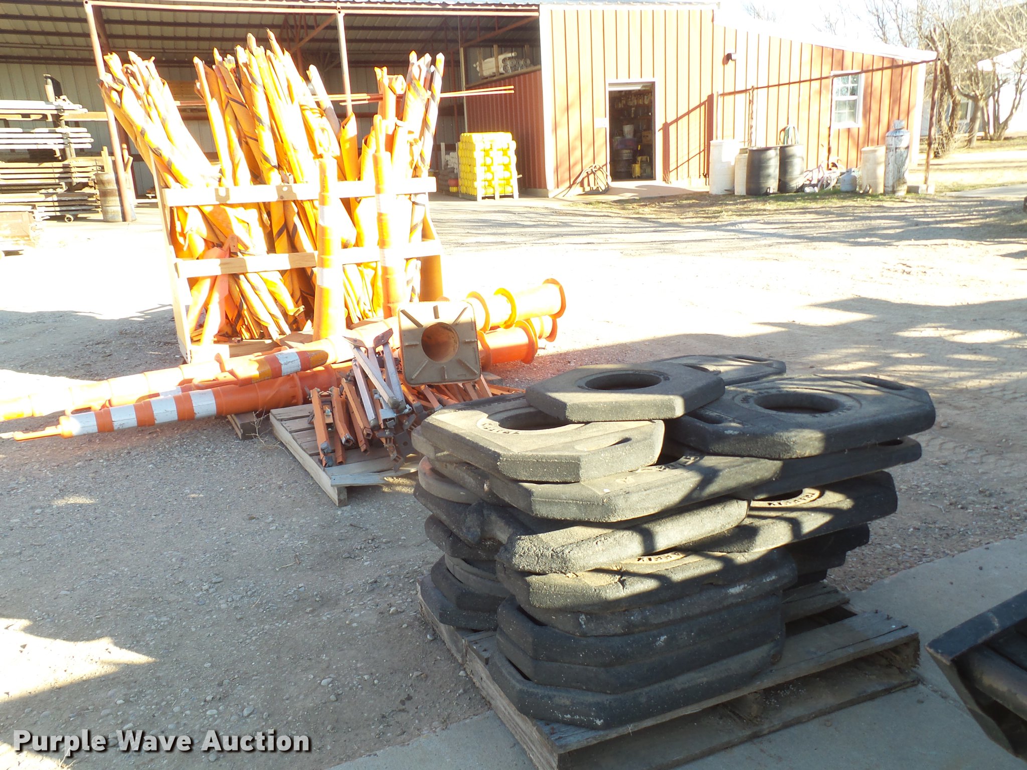 Purple Wave is selling a used Road Safety Equip. in Texas. This item is a Road safety equipment with the following: (133) 4'H T stands, (122) 12"H T stands, (110) 30" braces, (167) legs, 10' to 14'L, (17) type III, Metal braces, (4) type III, 4 x 4 plastic braces, (9) type III with rubber braces, (198) barrels, (252) tire bases, Approximately 130 cones, 4'H, Approximately 300 rubber cone bases, (10) road work ahead signs, 3' x 3', (20) road work ahead signs, 4' x 4', (19) right lane closed signs, 4' x 4', (4) obey warning signs, (23) end road work signs, Roll-up signs, Folding sign bases, Flags, Tape, Stop signs, Markers, Lights, Barrier fence, 174"W x 55"H sign rack