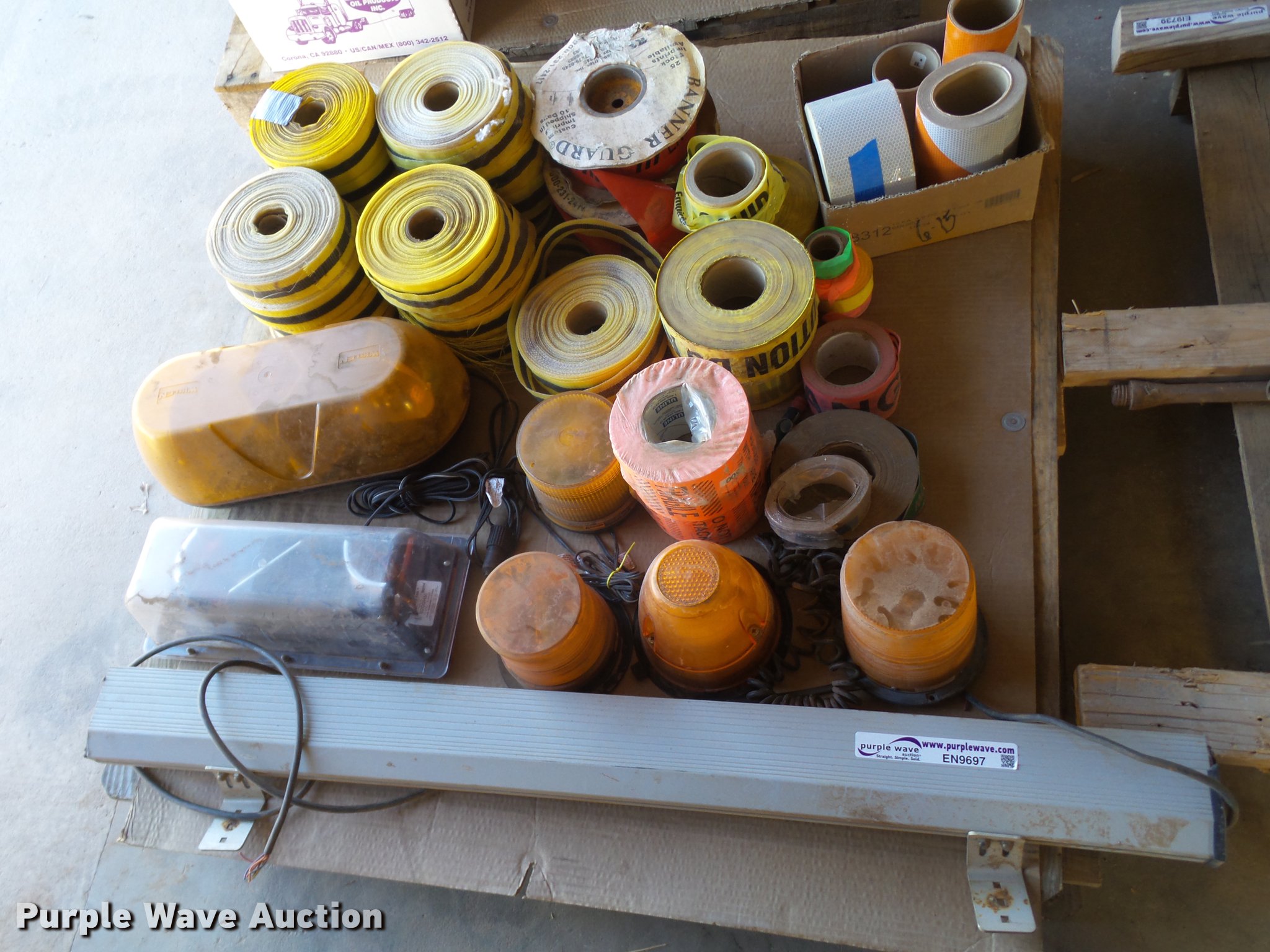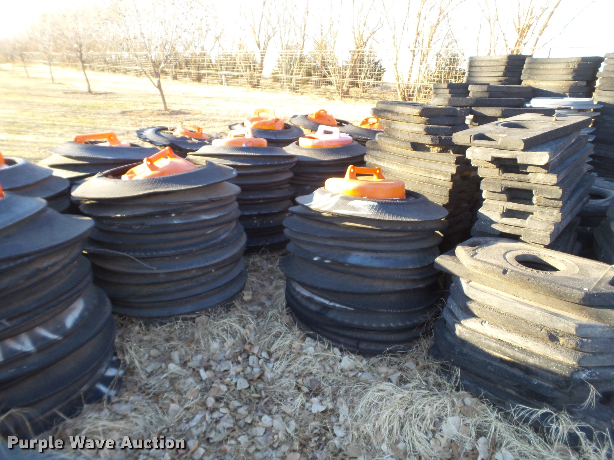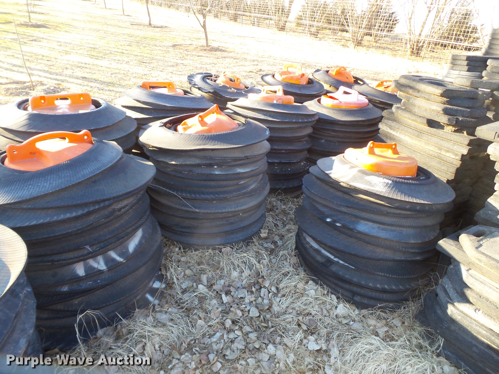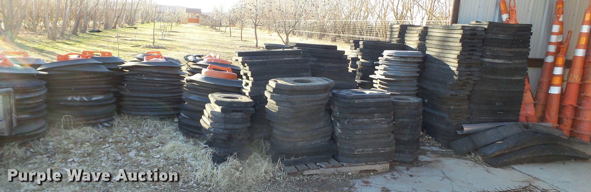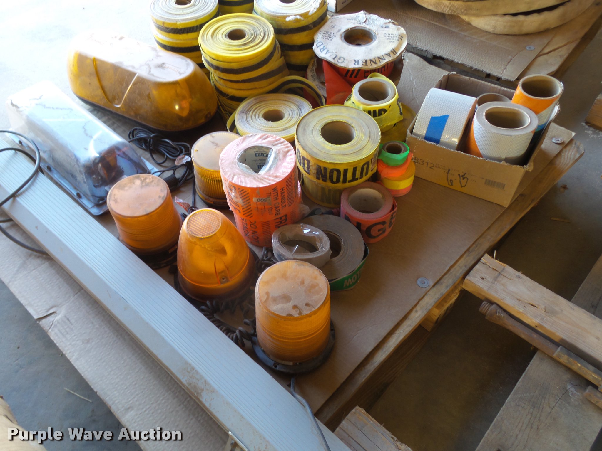 Purple Wave is selling a used Road Safety Equip. in Texas. This item is a Road safety equipment with the following: (133) 4'H T stands, (122) 12"H T stands, (110) 30" braces, (167) legs, 10' to 14'L, (17) type III, Metal braces, (4) type III, 4 x 4 plastic braces, (9) type III with rubber braces, (198) barrels, (252) tire bases, Approximately 130 cones, 4'H, Approximately 300 rubber cone bases, (10) road work ahead signs, 3' x 3', (20) road work ahead signs, 4' x 4', (19) right lane closed signs, 4' x 4', (4) obey warning signs, (23) end road work signs, Roll-up signs, Folding sign bases, Flags, Tape, Stop signs, Markers, Lights, Barrier fence, 174"W x 55"H sign rack