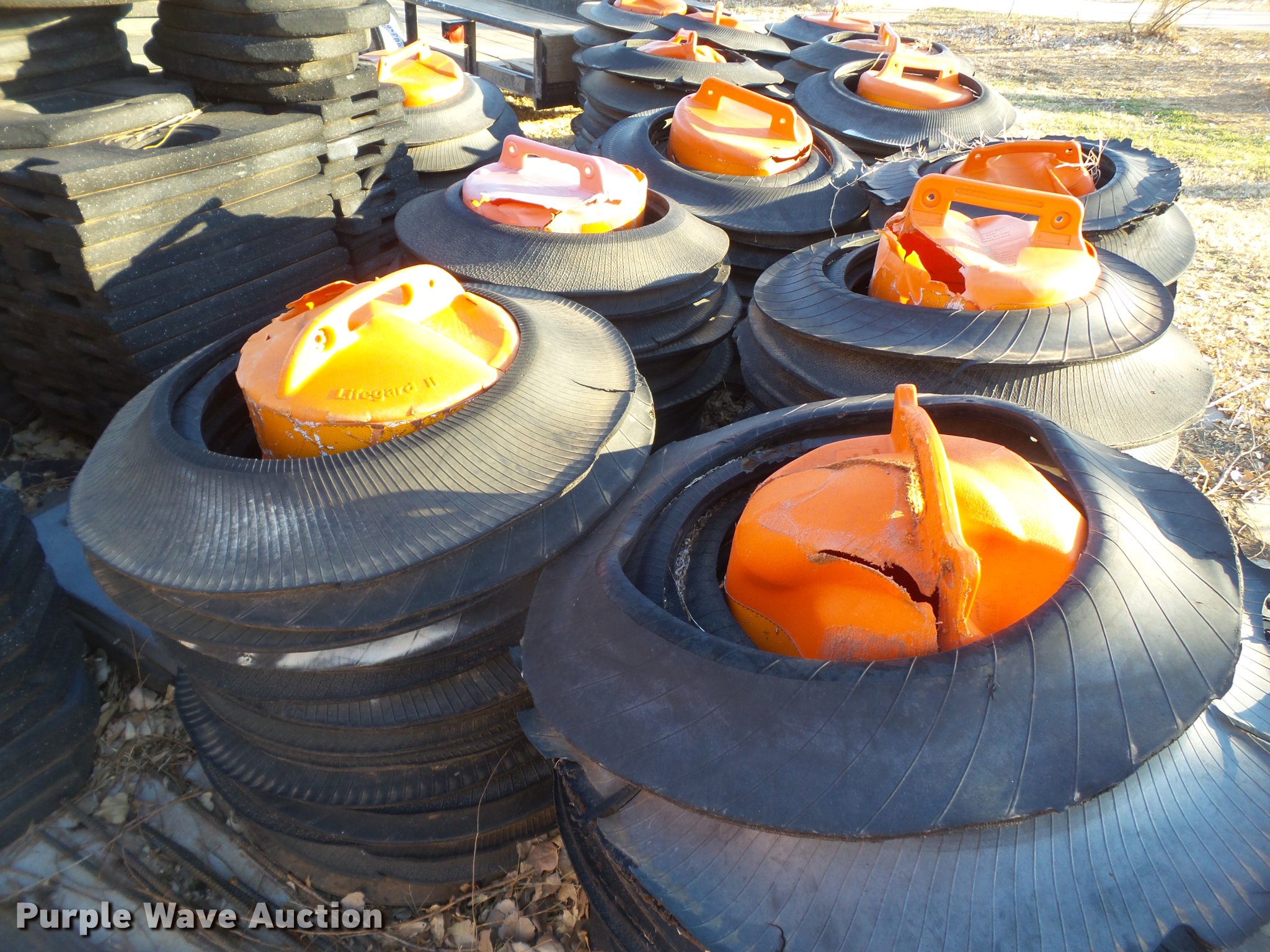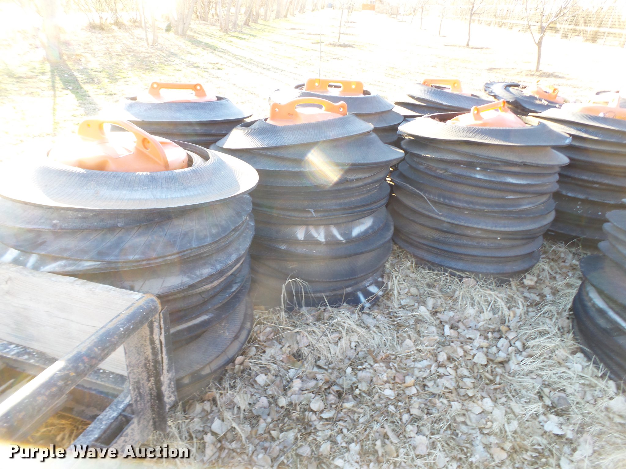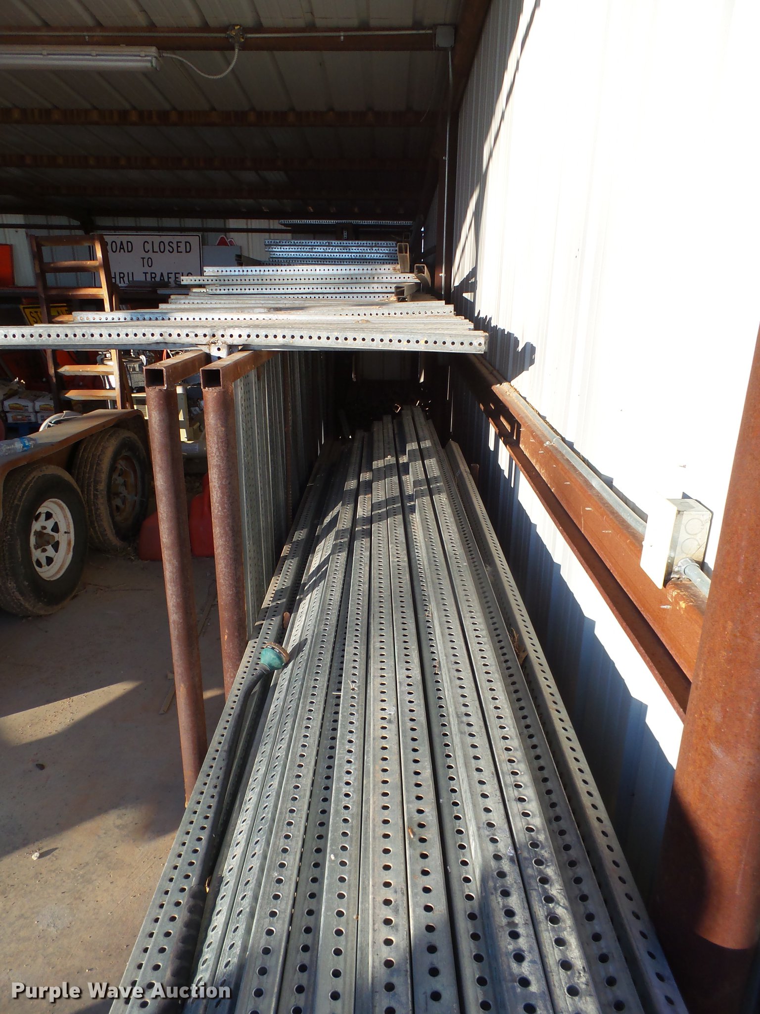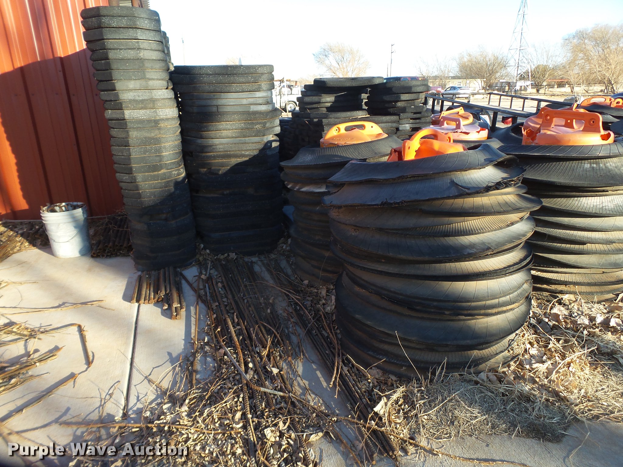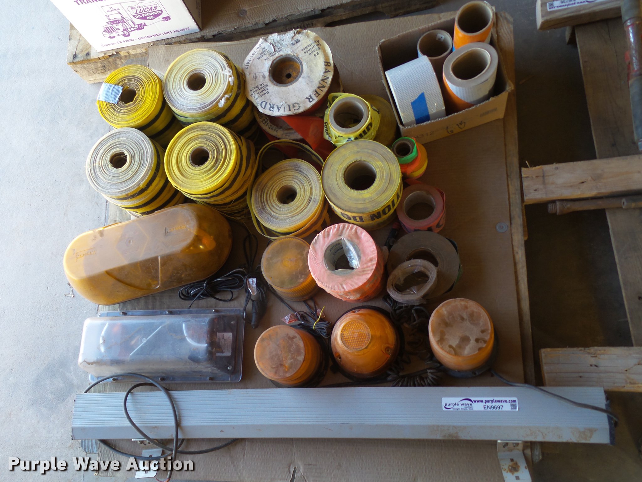 Purple Wave is selling a used Road Safety Equip. in Texas. This item is a Road safety equipment with the following: (133) 4'H T stands, (122) 12"H T stands, (110) 30" braces, (167) legs, 10' to 14'L, (17) type III, Metal braces, (4) type III, 4 x 4 plastic braces, (9) type III with rubber braces, (198) barrels, (252) tire bases, Approximately 130 cones, 4'H, Approximately 300 rubber cone bases, (10) road work ahead signs, 3' x 3', (20) road work ahead signs, 4' x 4', (19) right lane closed signs, 4' x 4', (4) obey warning signs, (23) end road work signs, Roll-up signs, Folding sign bases, Flags, Tape, Stop signs, Markers, Lights, Barrier fence, 174"W x 55"H sign rack