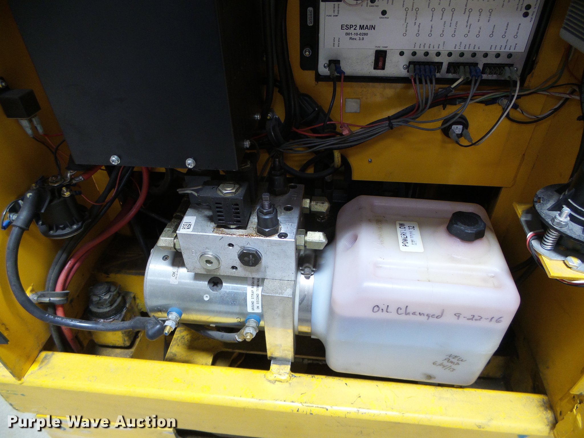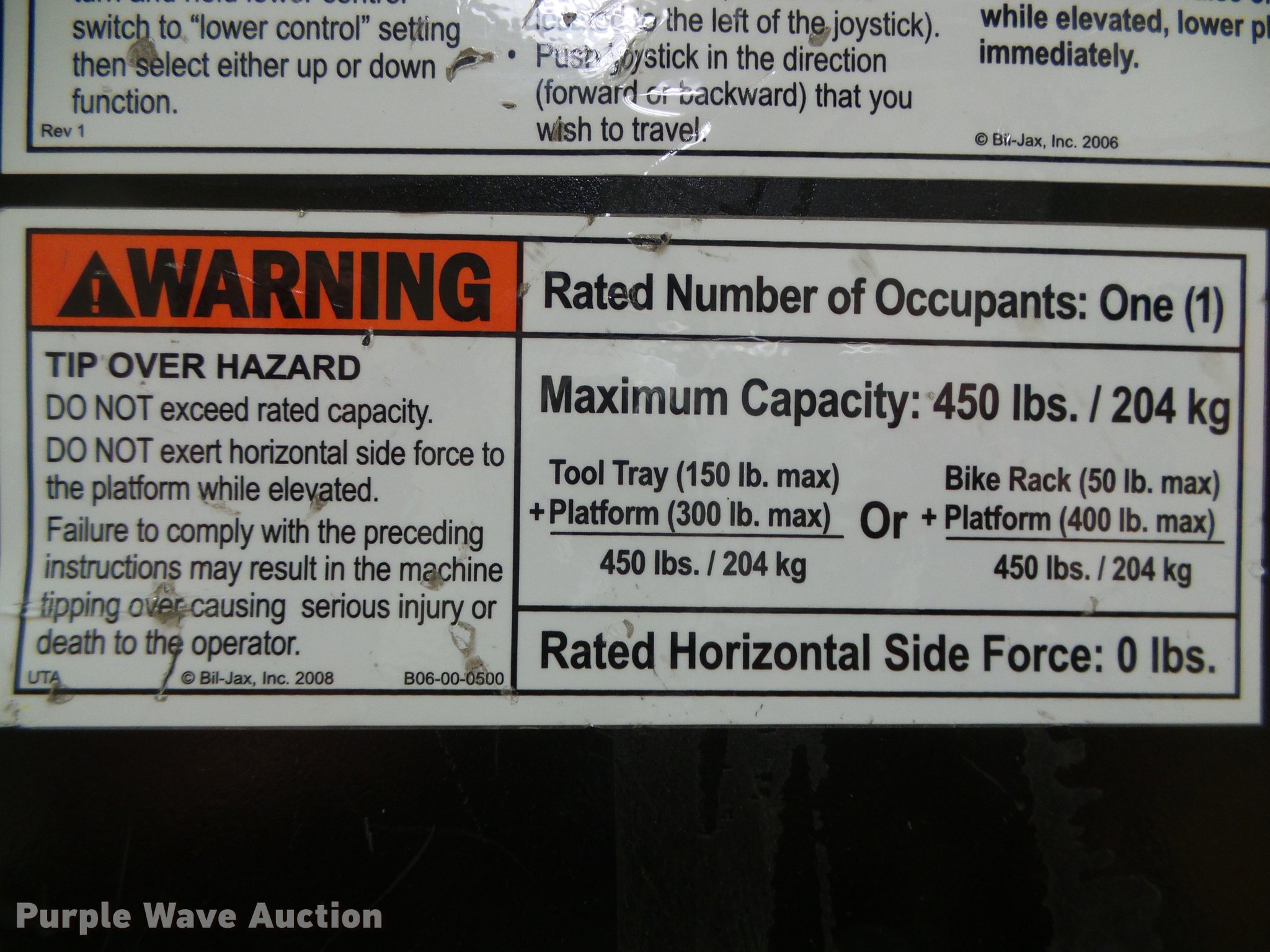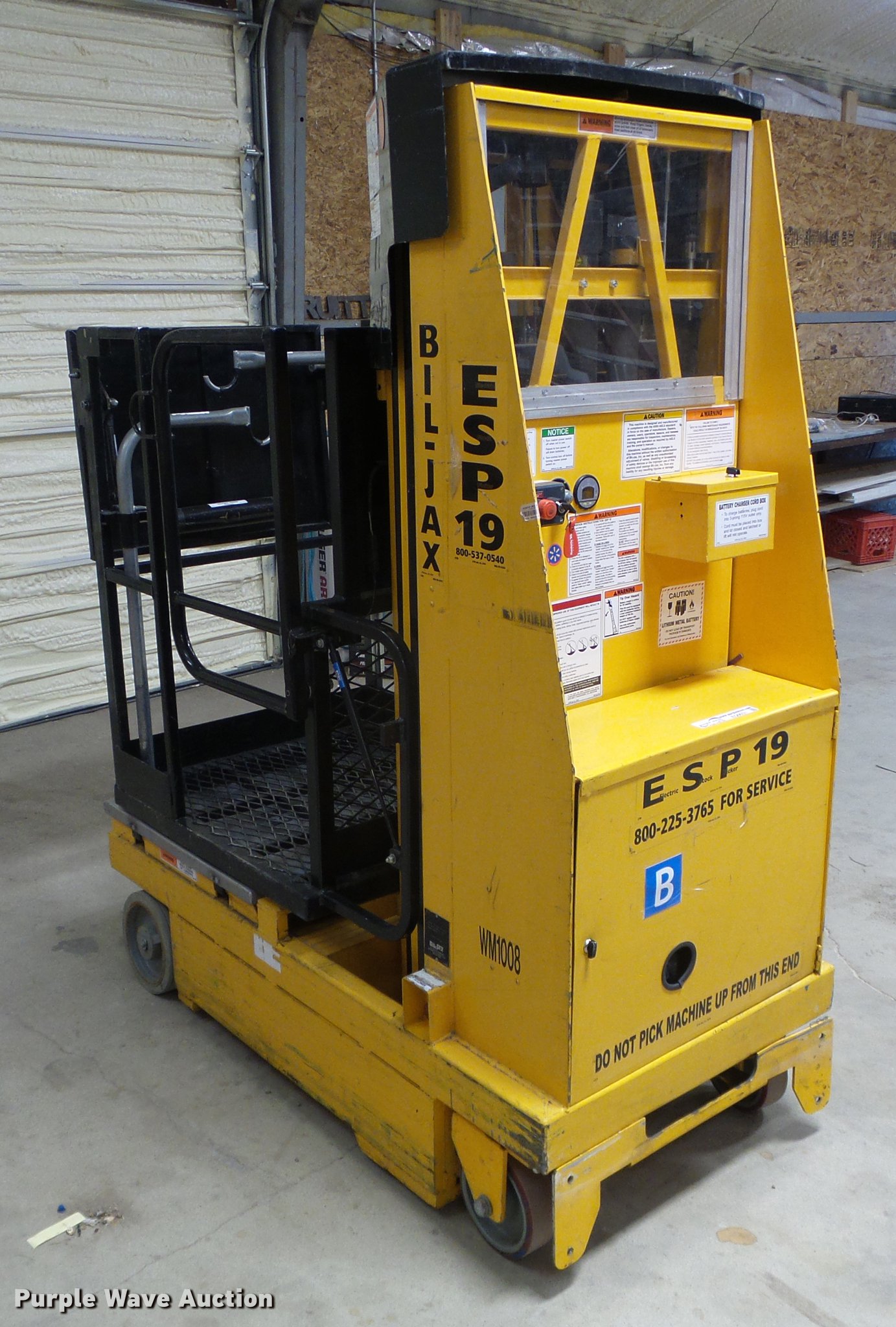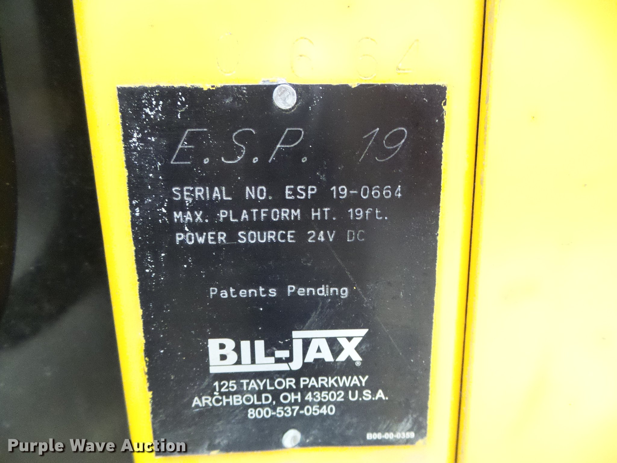 Biljax ESP19 vertical lift. 10,149 hours on meter, 24V operation, 450 lbs maximum lift capacity, 19' maximum lift height, 30" x 31" platform Platform and ground controls, 27" x 21" tool tray, Solid tires, Battery charger, Serial ESP19-0664. Pruitt Electric LLC. 415 N Main St. Spearville, KS 67876