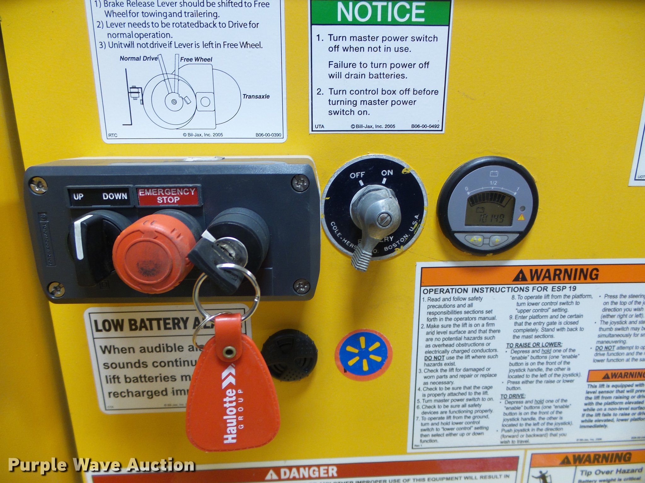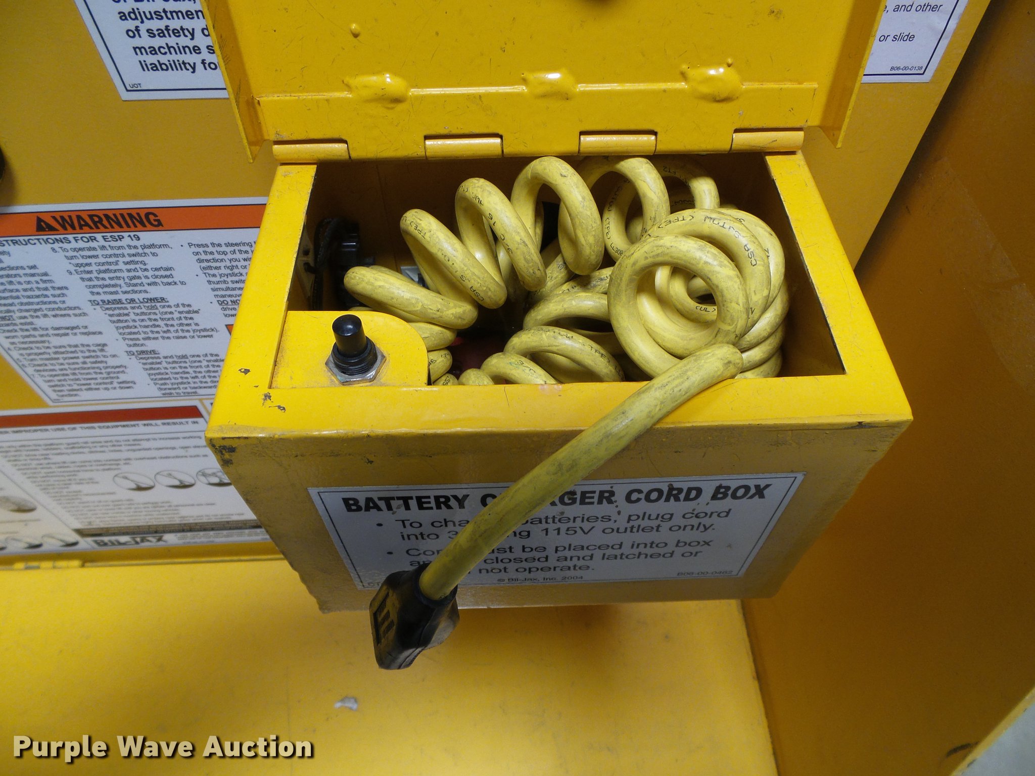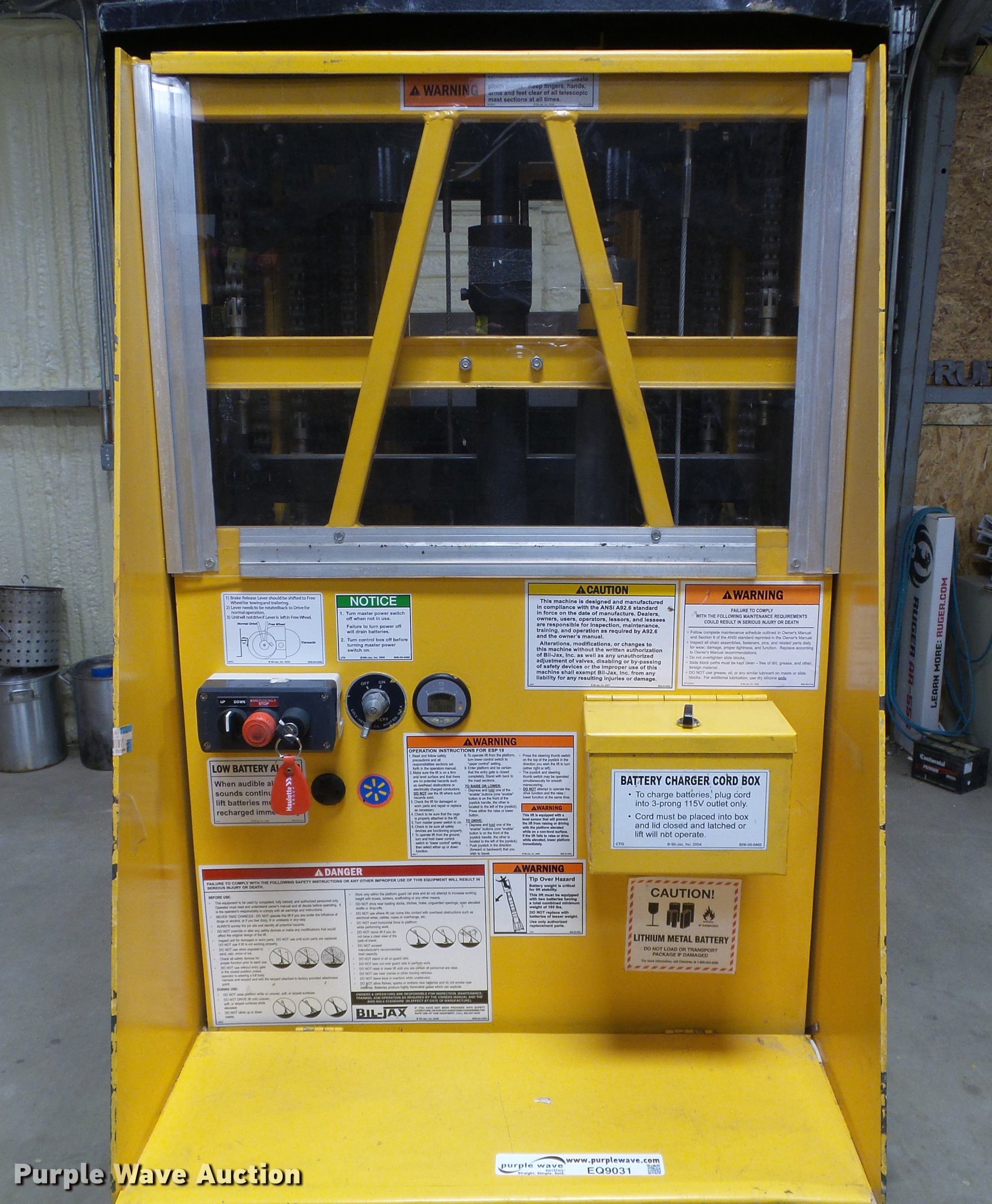 Purple Wave is selling a used Scissor or Vertical Lift in Kansas. This item is a Biljax ESP19 vertical lift with the following: 10,149 hours on meter, 24V operation, 450 lbs maximum lift capacity, 19' maximum lift height, 30" x 31" platform, Platform and ground controls, 27" x 21" tool tray, Solid tires, Battery charger, Serial ESP19-0664