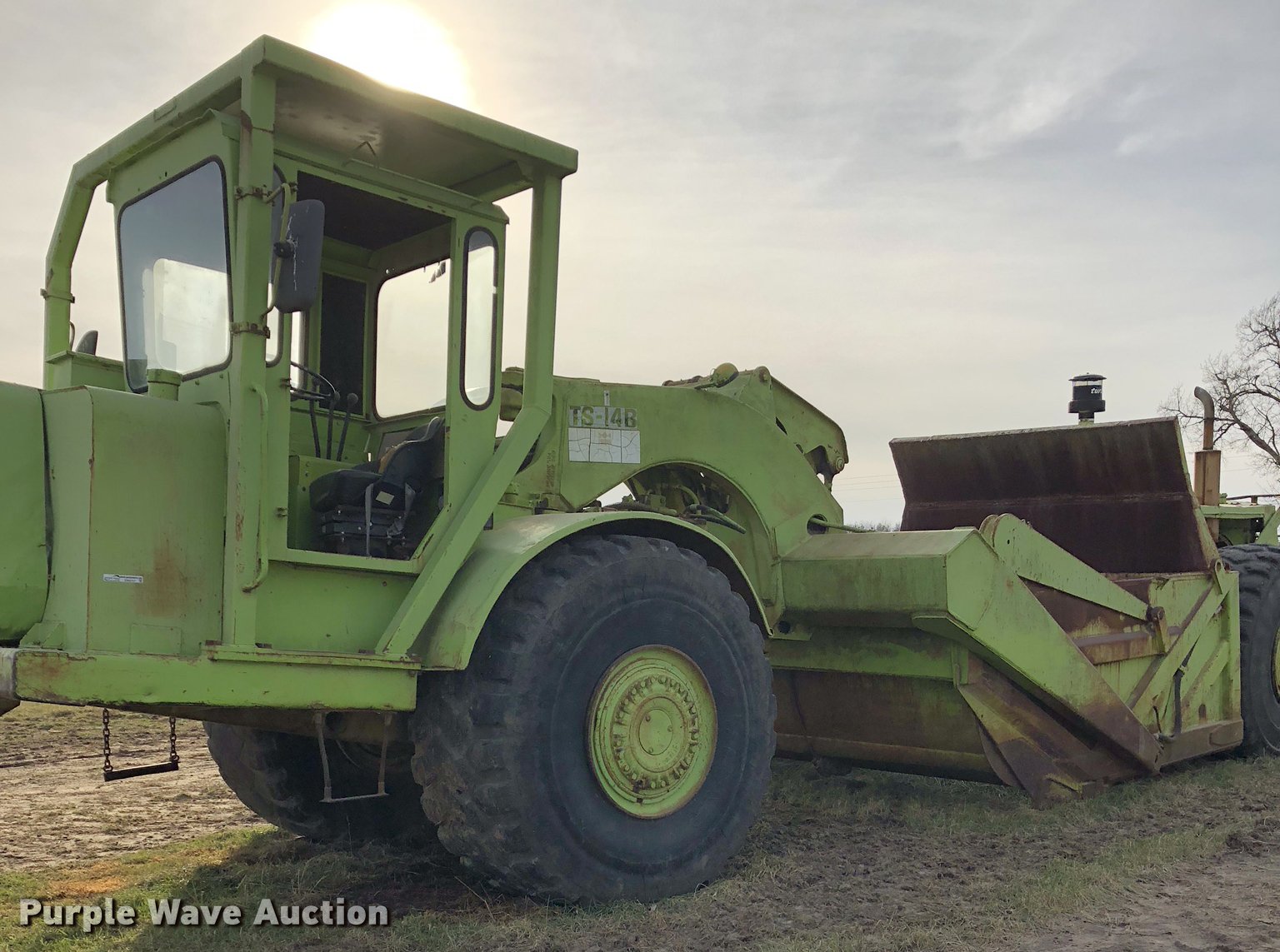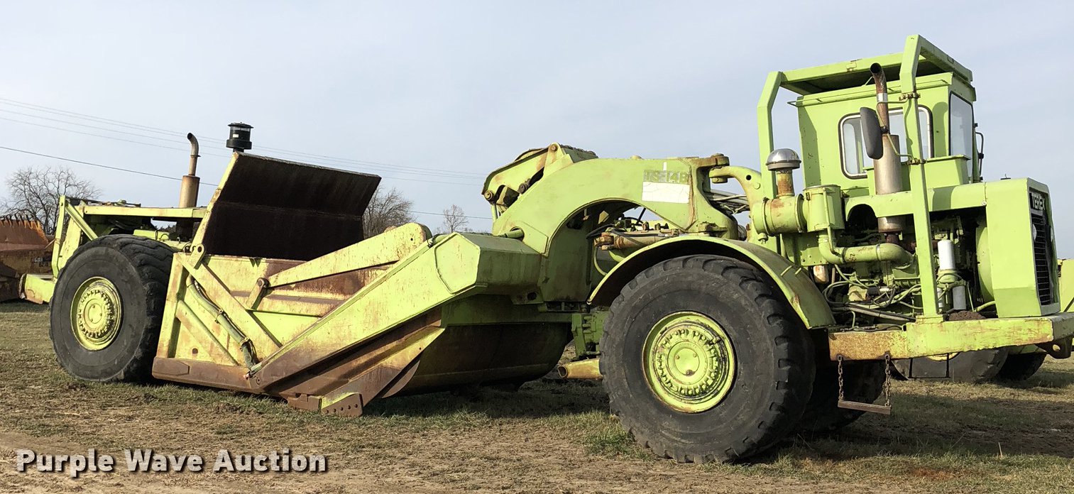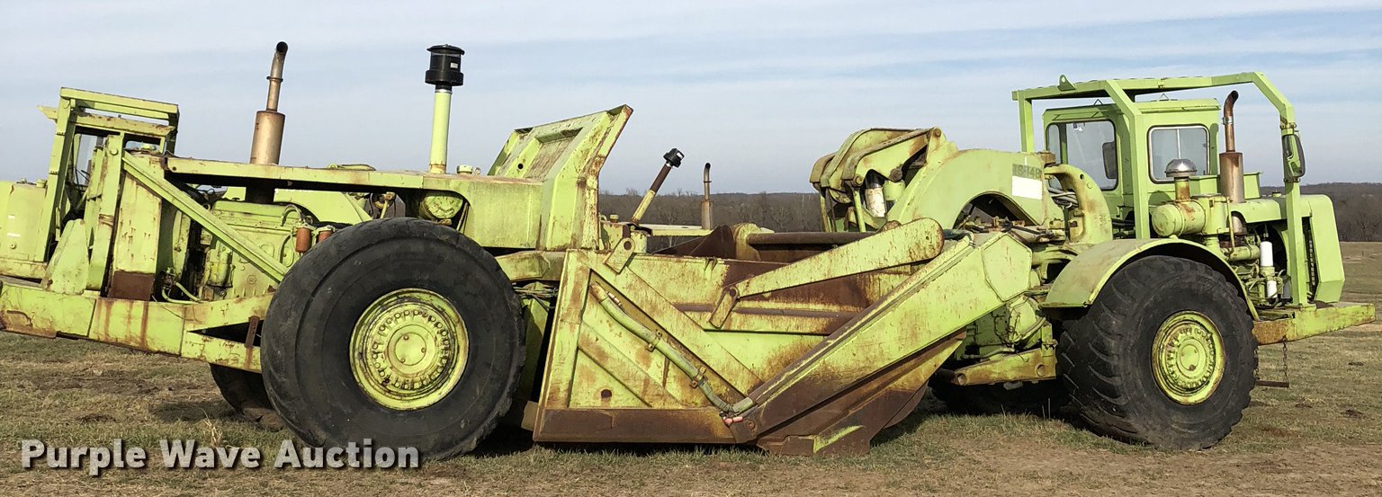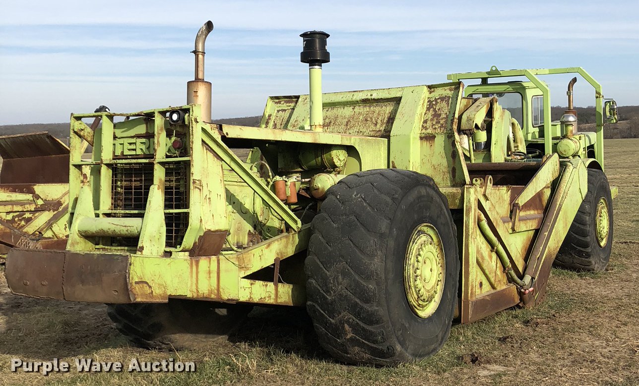 Purple Wave is selling a used Conventional Scraper in Missouri. This item is a Terex TS14B conventional scraper with the following: 4,992 hours on meter, Deteroit Diesel 4-71N front and rear engines, 160 HP, Powershift transmission, 4F-4R gears, OROPS, Air suspension seat, Three lever controls, 14 cu.yd. bowl capacity, Reversible cutting edge, Hydraulic lift, Rear push block, Air brakes, 29.5-25 tires