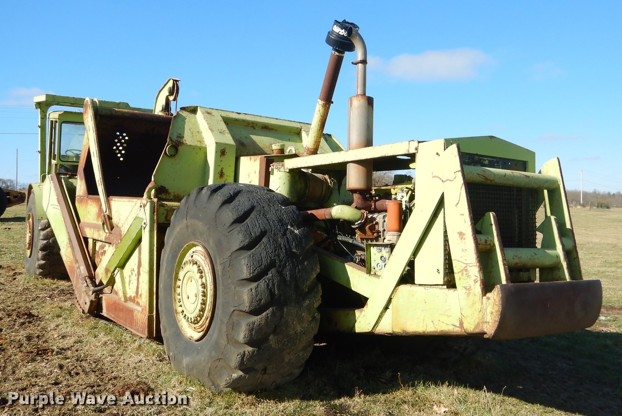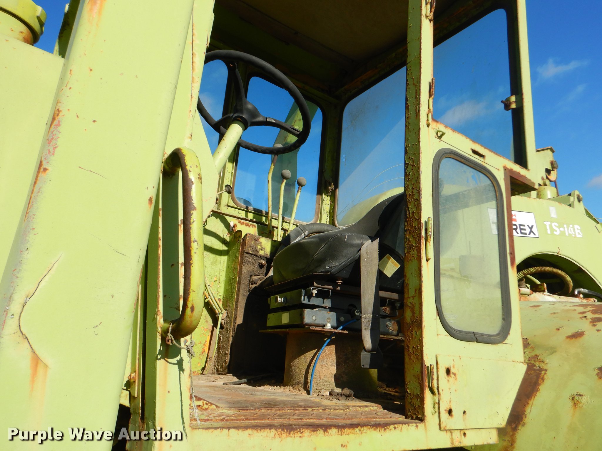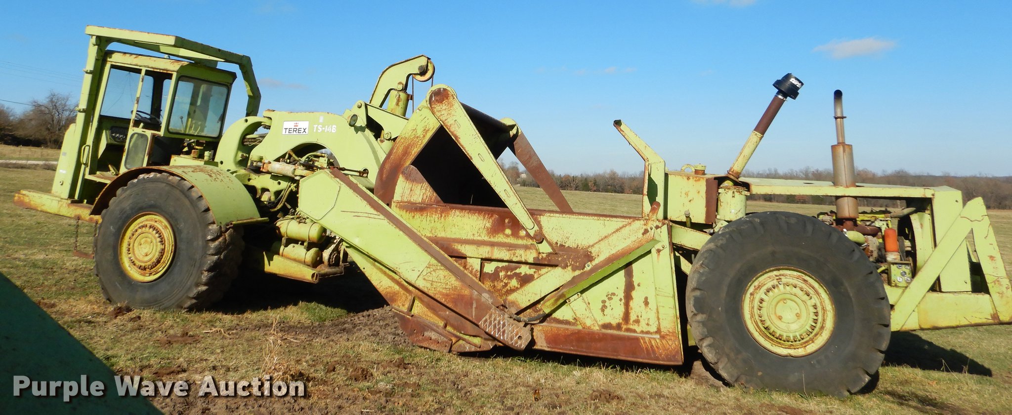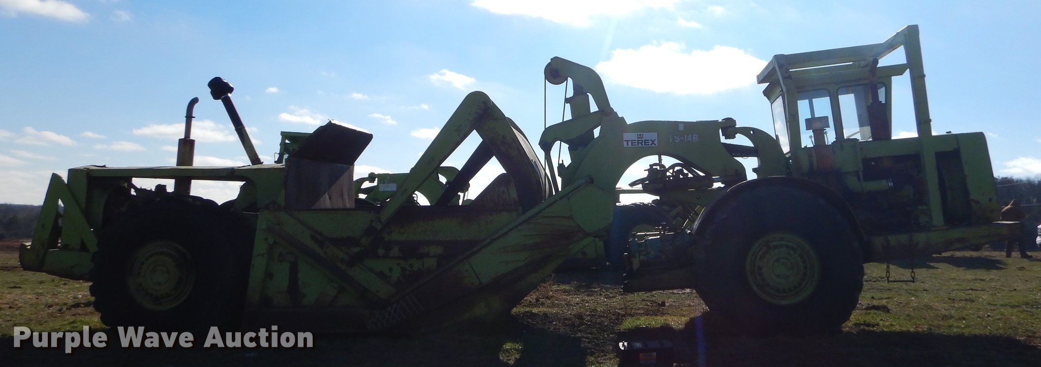 Purple Wave is selling a used Conventional Scraper in Missouri. This item is a Terex TS14B conventional scraper with the following: 3,343 hours on meter, Detroit Diesel 4-71N front and rear engines, 160 HP, Powershift transmission, 4F-4R gears, OROPS, Air suspension seat, Three lever controls, 14 cu.yd. bowl capacity, Reversible cutting edge, Hydraulic lift, Rear push block, Air brakes, 29.5R25 tires, Windshield broken, Air leak, Serial 61070