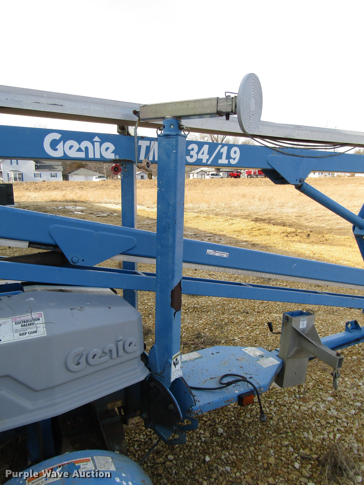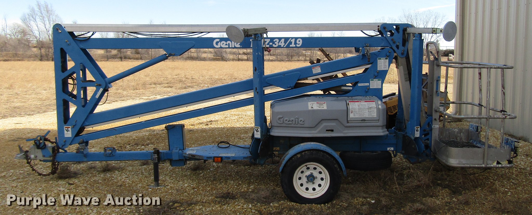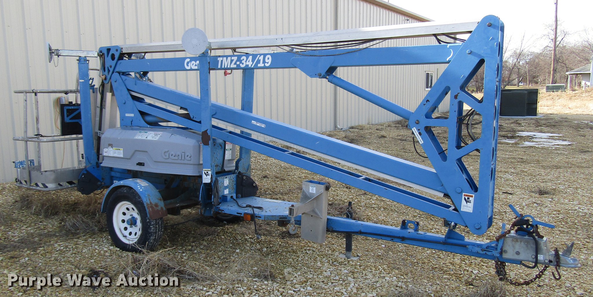 Purple Wave is selling a used Boom Lift in Nebraska. This item is a 1999 Genie TMZ34 boom lift with the following: 5,973 hours on meter, 24V electric operation, 500 lbs max. lift capacity, 19' max. reach length, 34' max. lift height, 47.5"L x 27.5"W platform, Platform and ground controls, AC power outlet, Manual outriggers, 195/75R14 tires, Non-operational platform controls, Safety limit switch issues, Serial T3499470