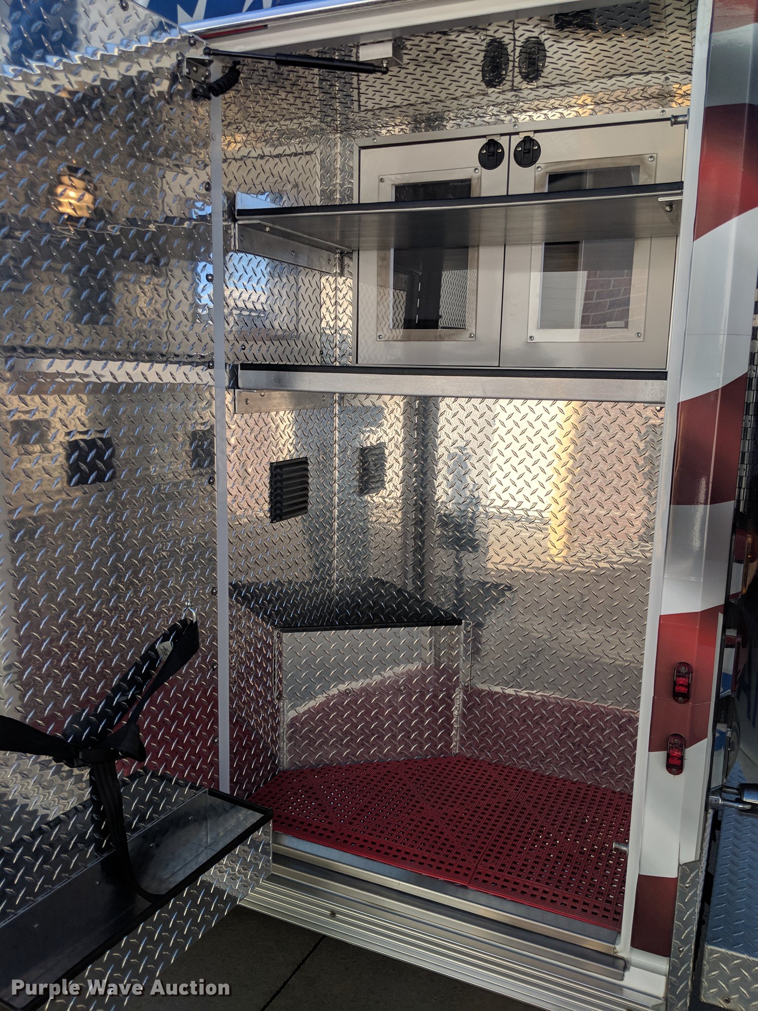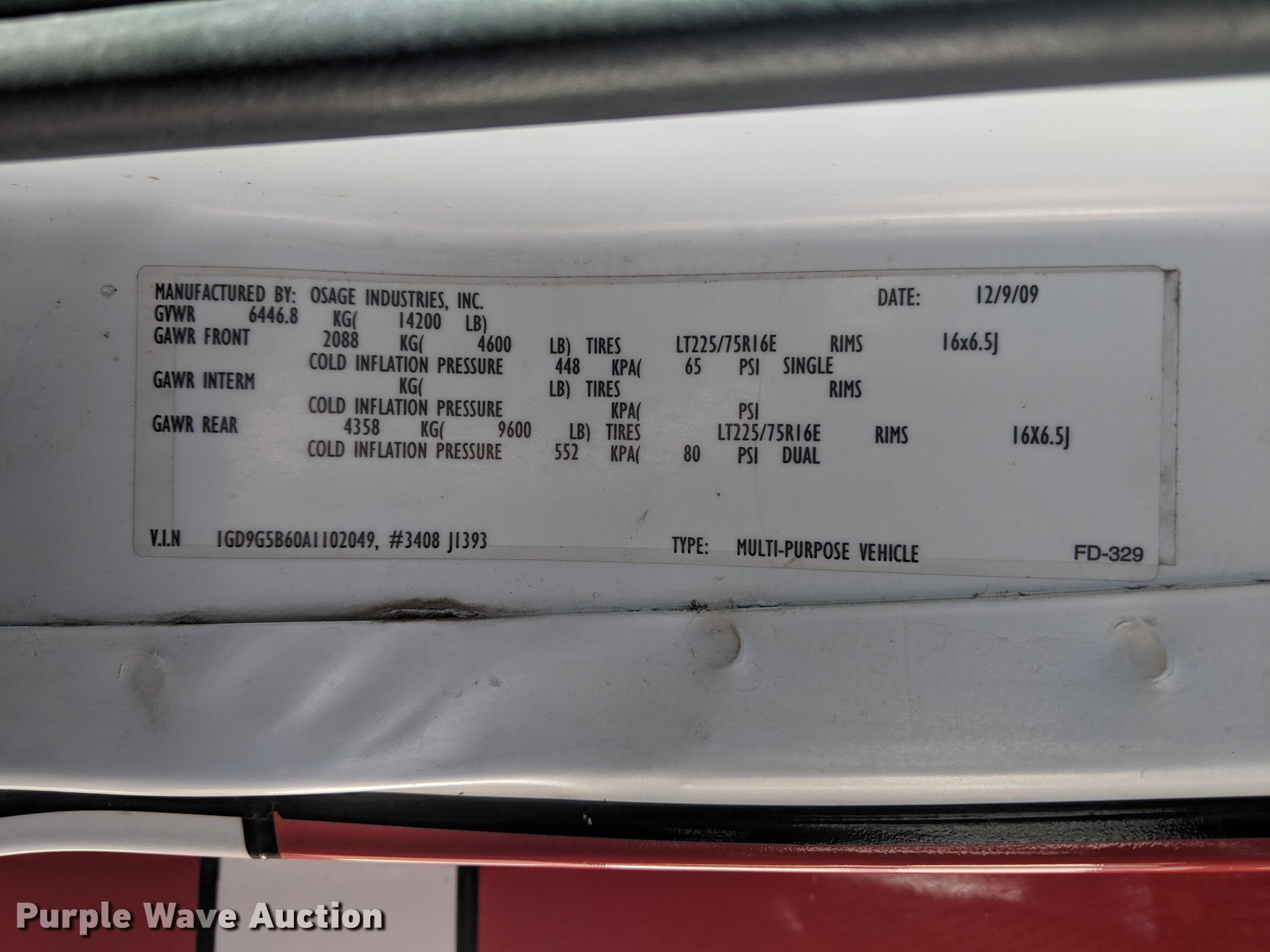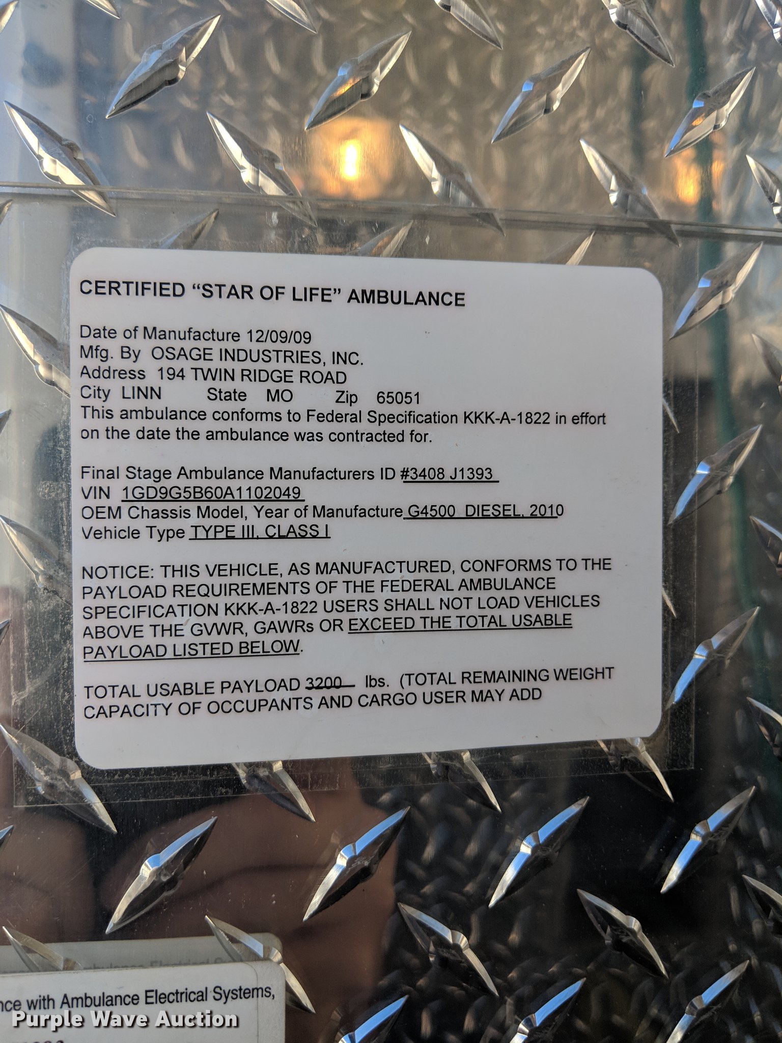 Purple Wave is selling a used Fire Truck or Emergency Vehicle in Missouri. This item is a 2010 GMC Savana G4500 ambulance with the following: 216,990 miles on odometer, 7,443 hours on meter, 6.6L V8 OHV 32V turbo diesel engine, Automatic transmission, Single axle, AC and heat, AM/FM, Power windows and locks, Air horn, Suspension seat, Block heater, Osage Type III Super Warrior ambulance body, Emergency lights and sirens, Power inverter, Backup camera, LT225/75R16 tires, GVWR 14,200 lbs