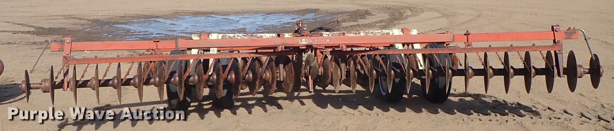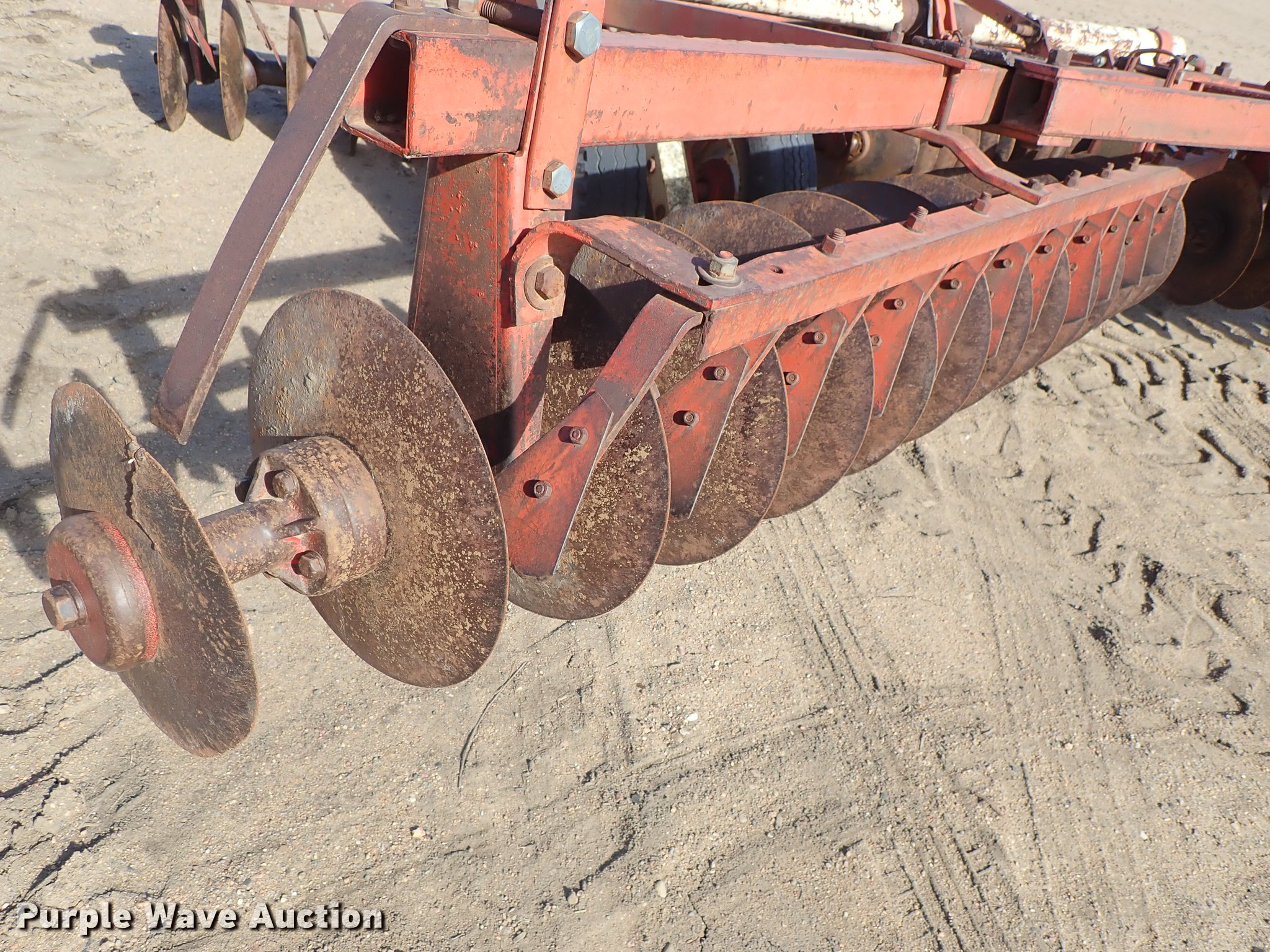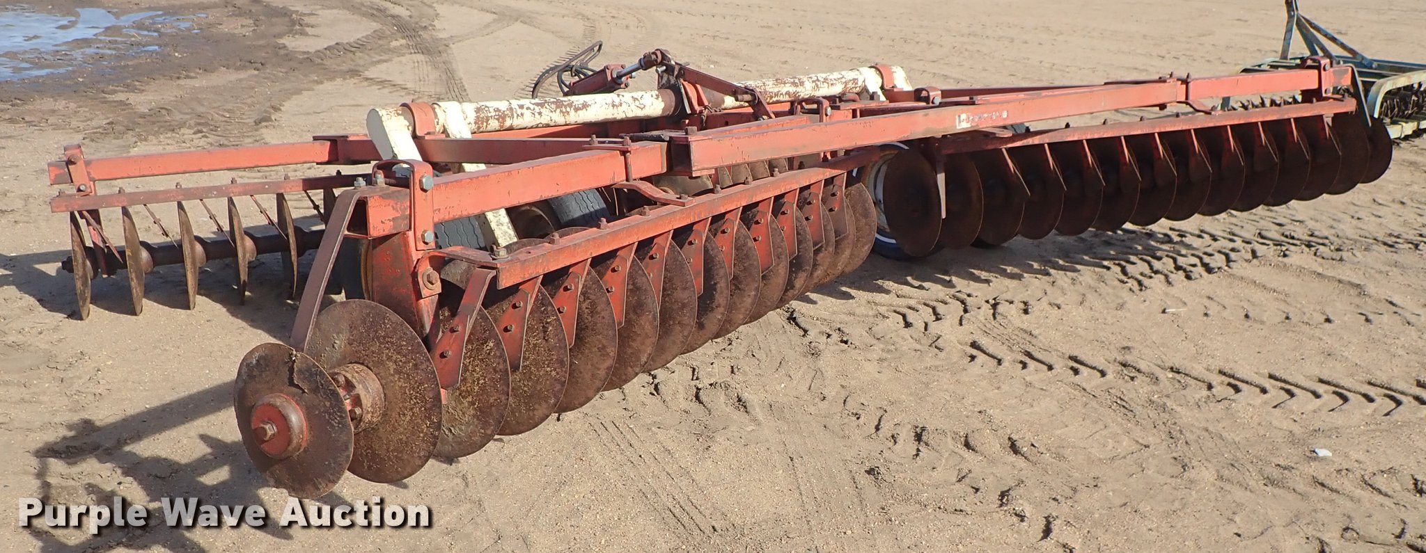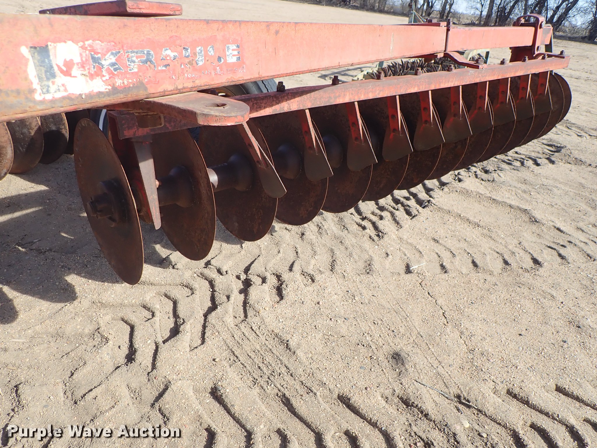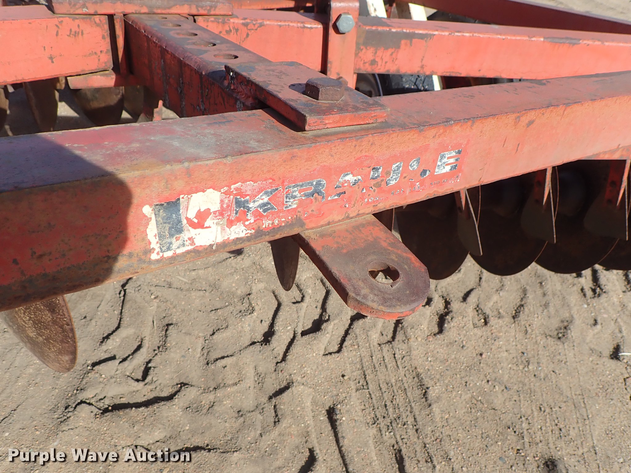 Purple Wave is selling a used Disk in Kansas. This item is a Krause 613 disk with the following: Approx. 16'W, 16" diameter disks, Disk scrapers, Hydraulic lift, Pin hitch, 7.00-15 transport tires, Serial 5477