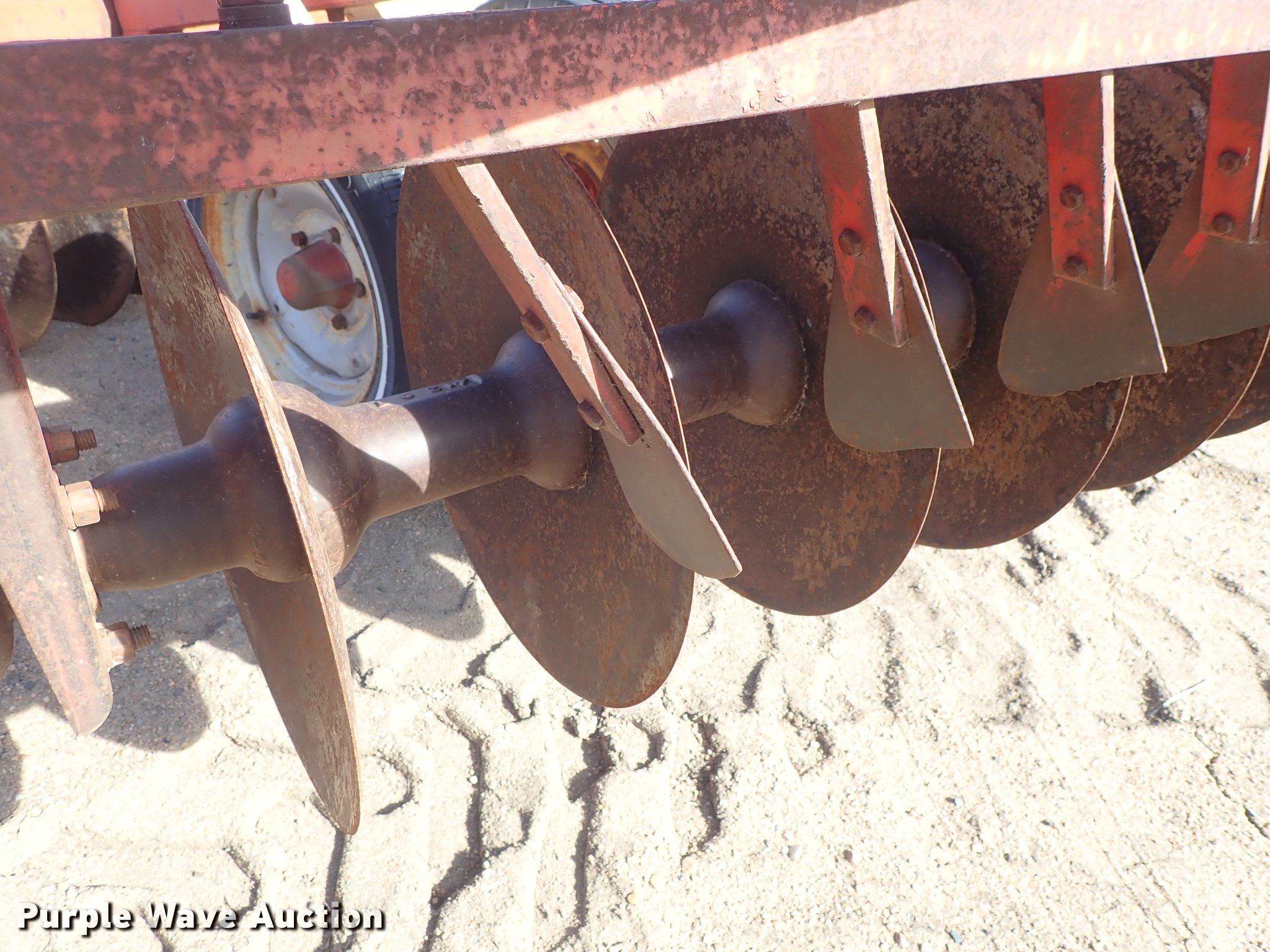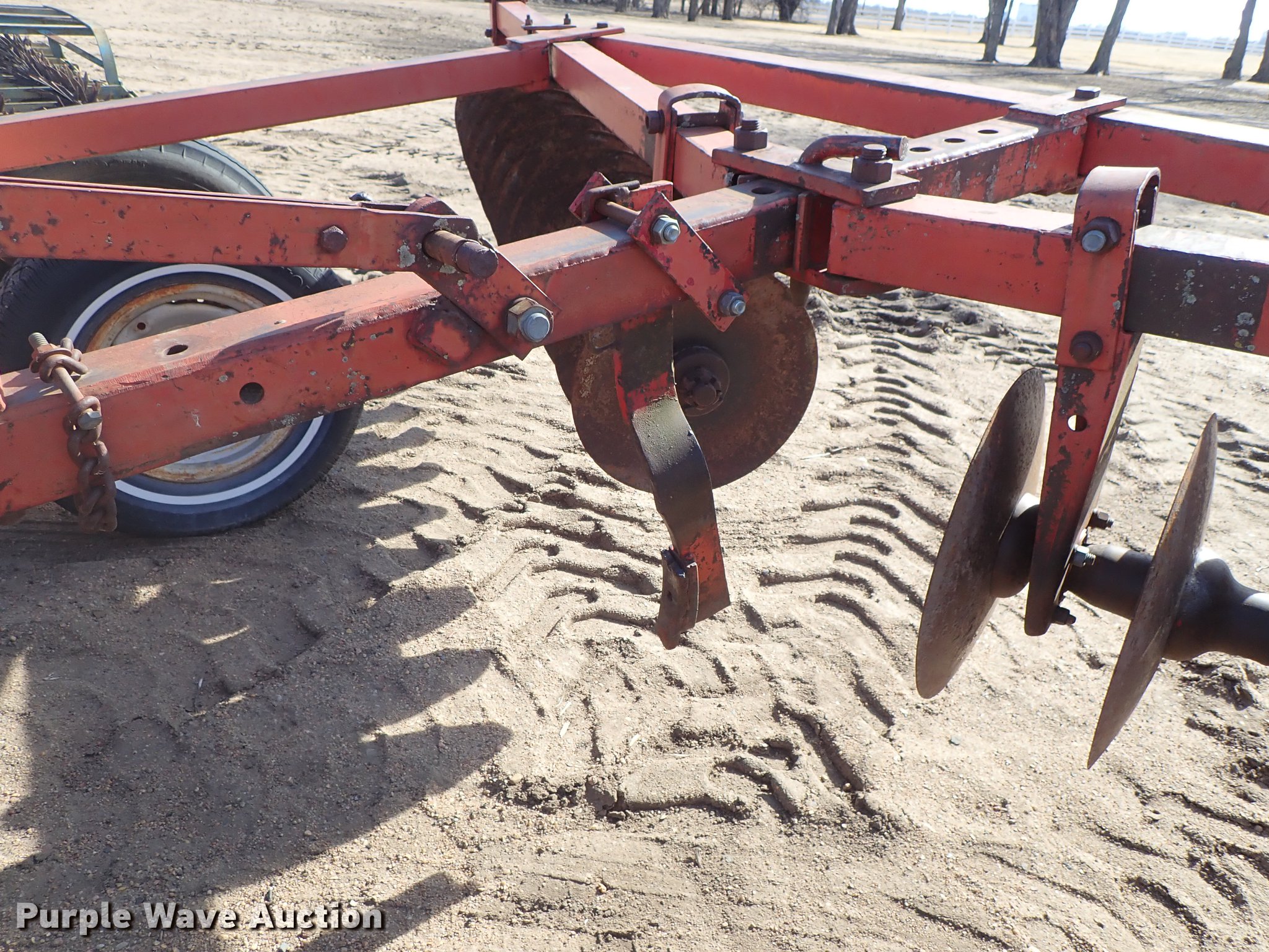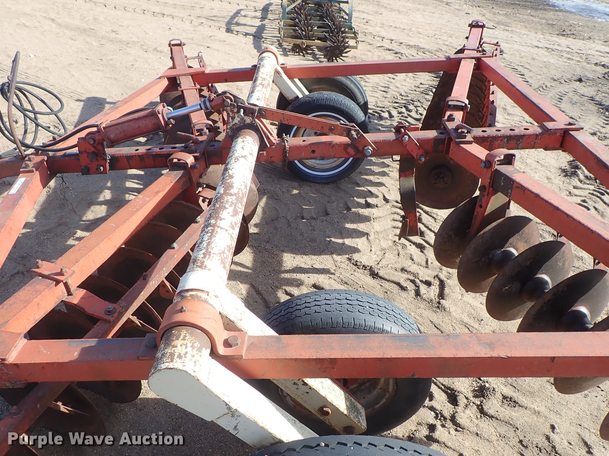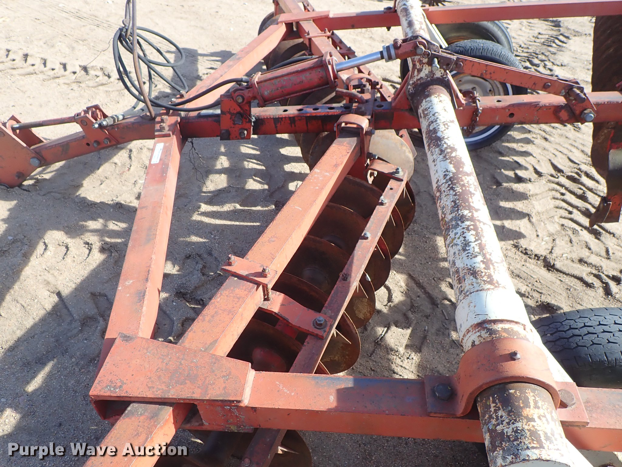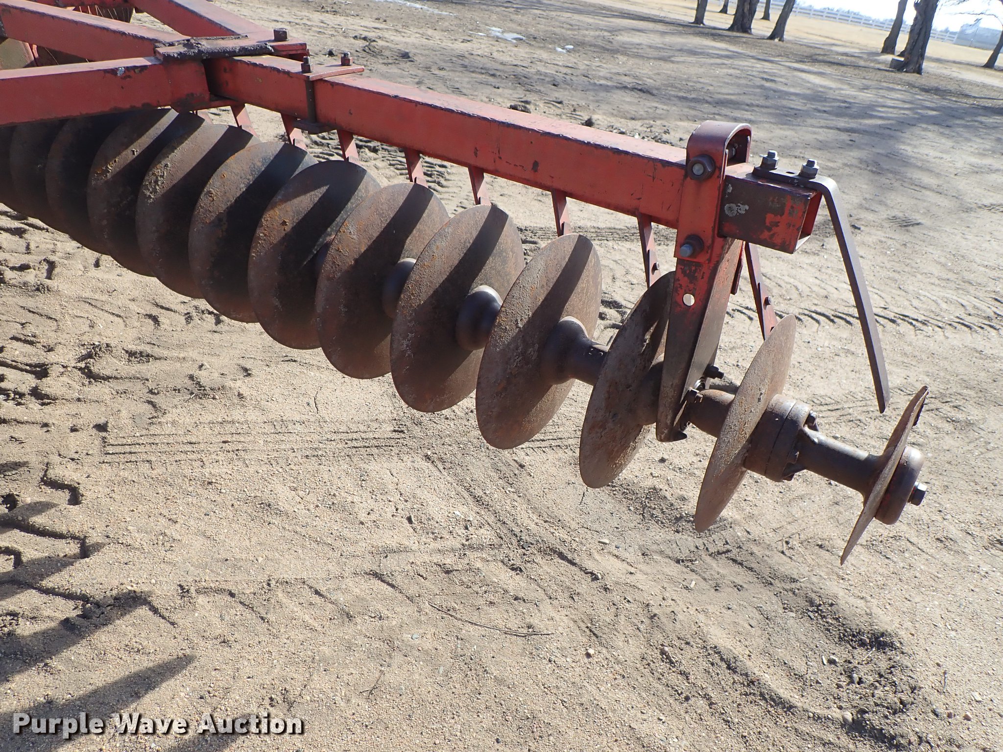 Purple Wave is selling a used Disk in Kansas. This item is a Krause 613 disk with the following: Approx. 16'W, 16" diameter disks, Disk scrapers, Hydraulic lift, Pin hitch, 7.00-15 transport tires, Serial 5477