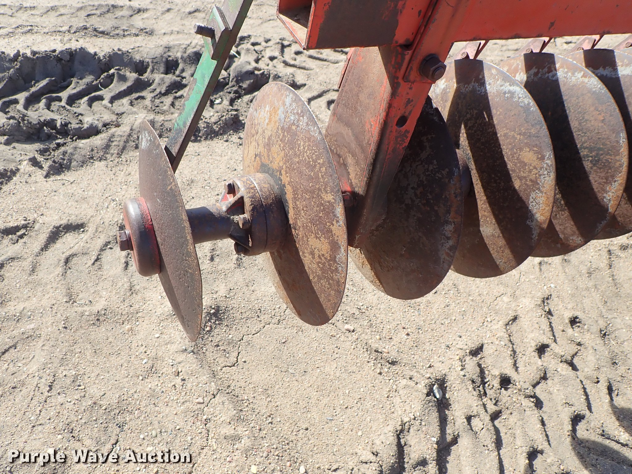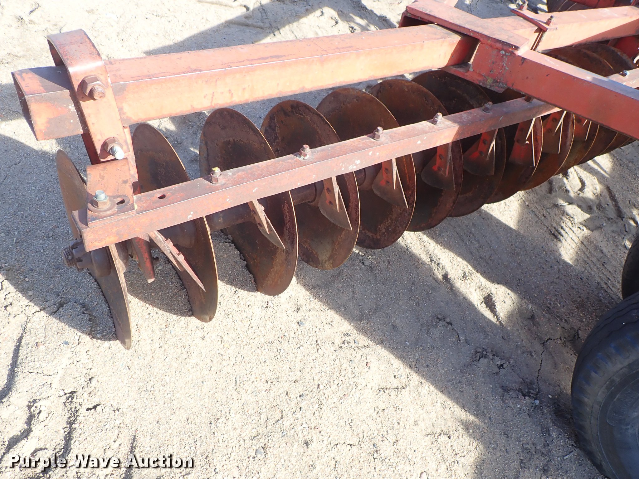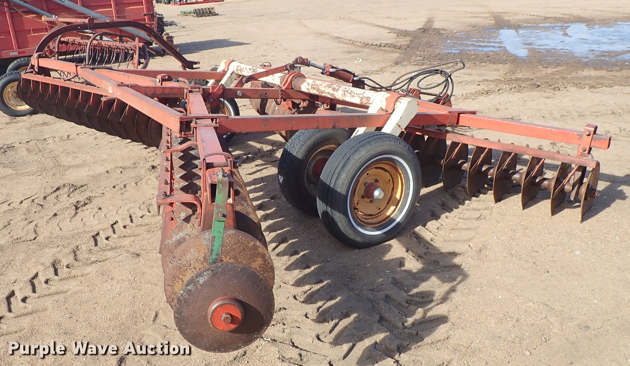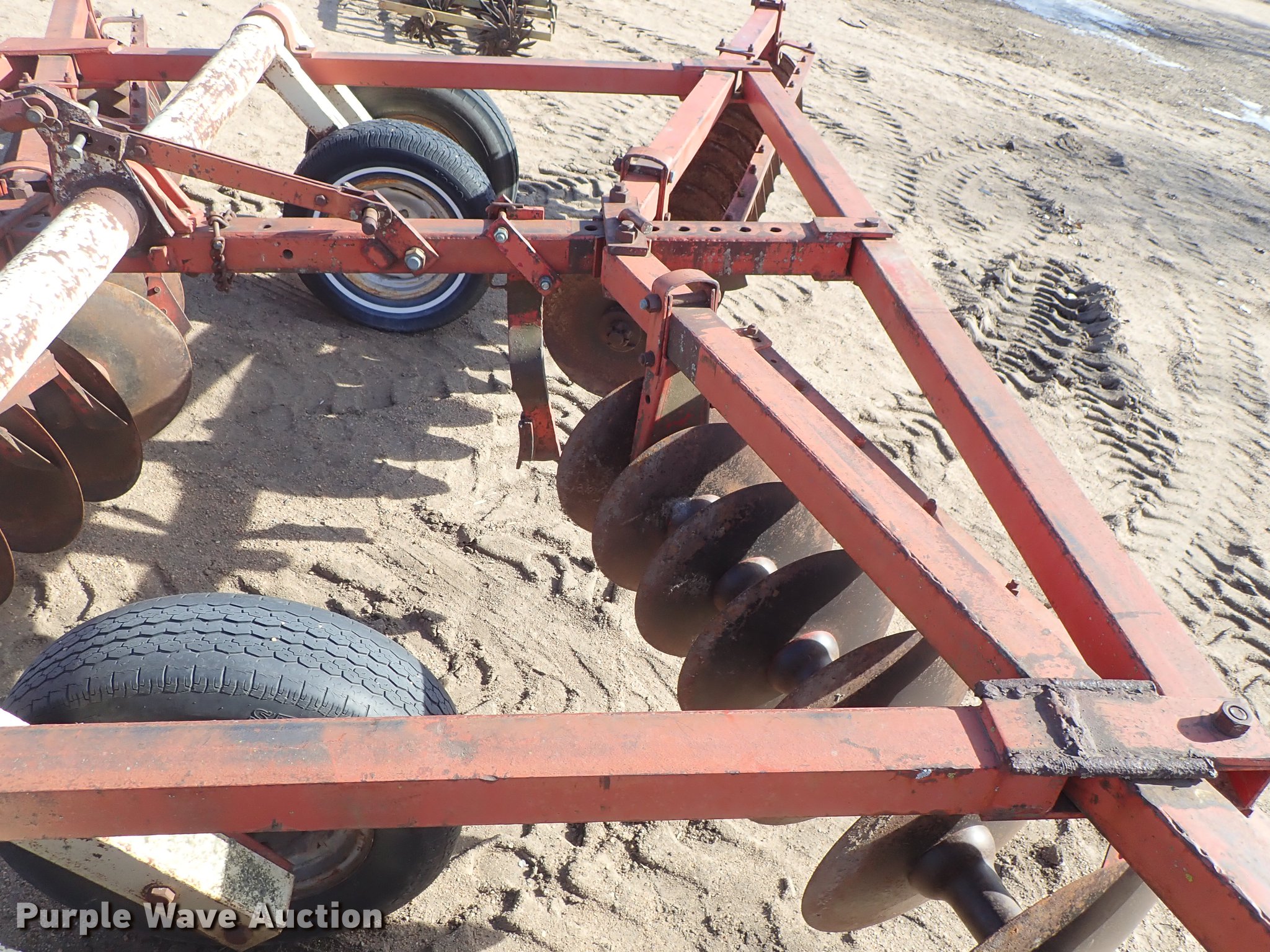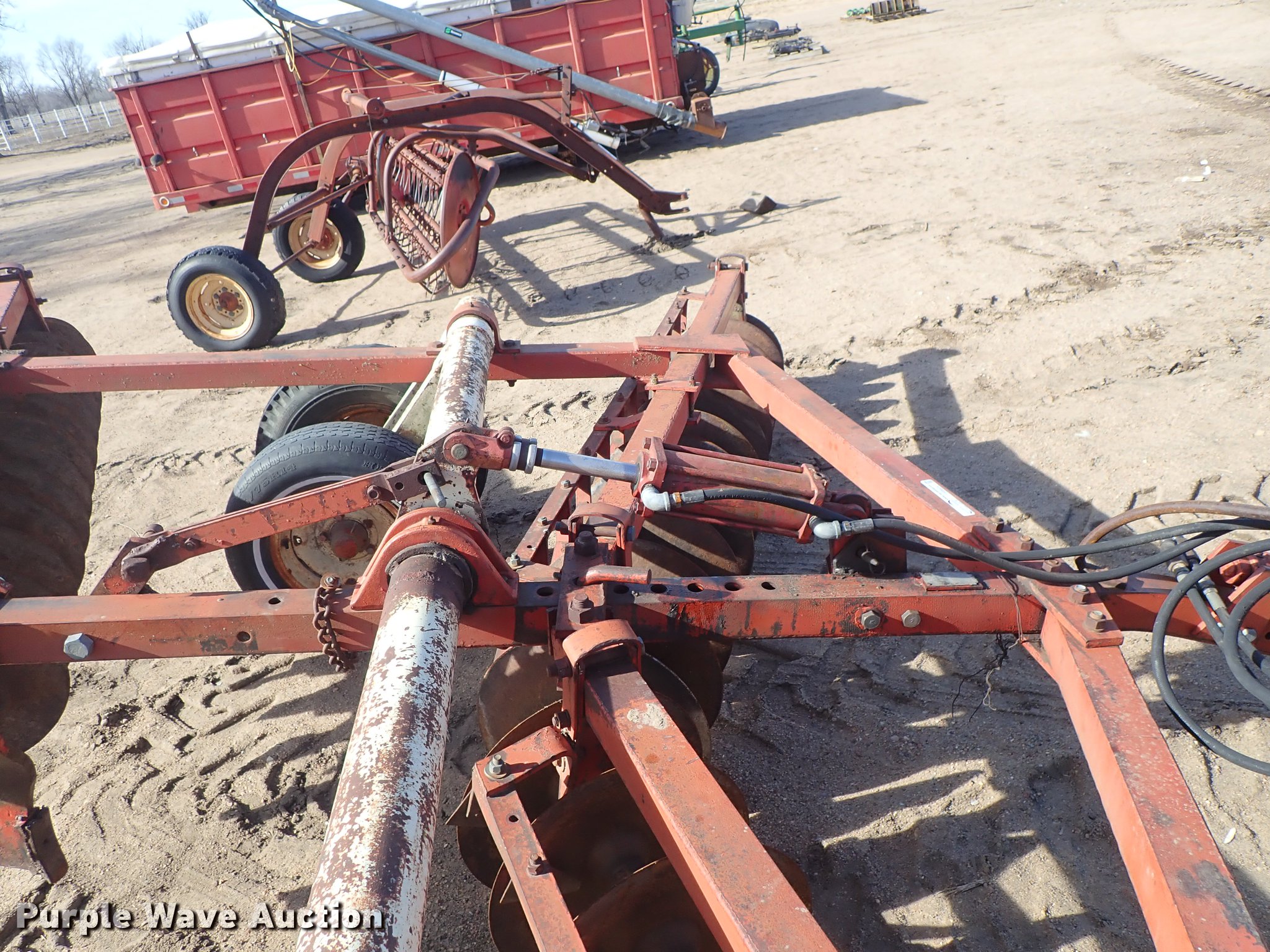 Purple Wave is selling a used Disk in Kansas. This item is a Krause 613 disk with the following: Approx. 16'W, 16" diameter disks, Disk scrapers, Hydraulic lift, Pin hitch, 7.00-15 transport tires, Serial 5477