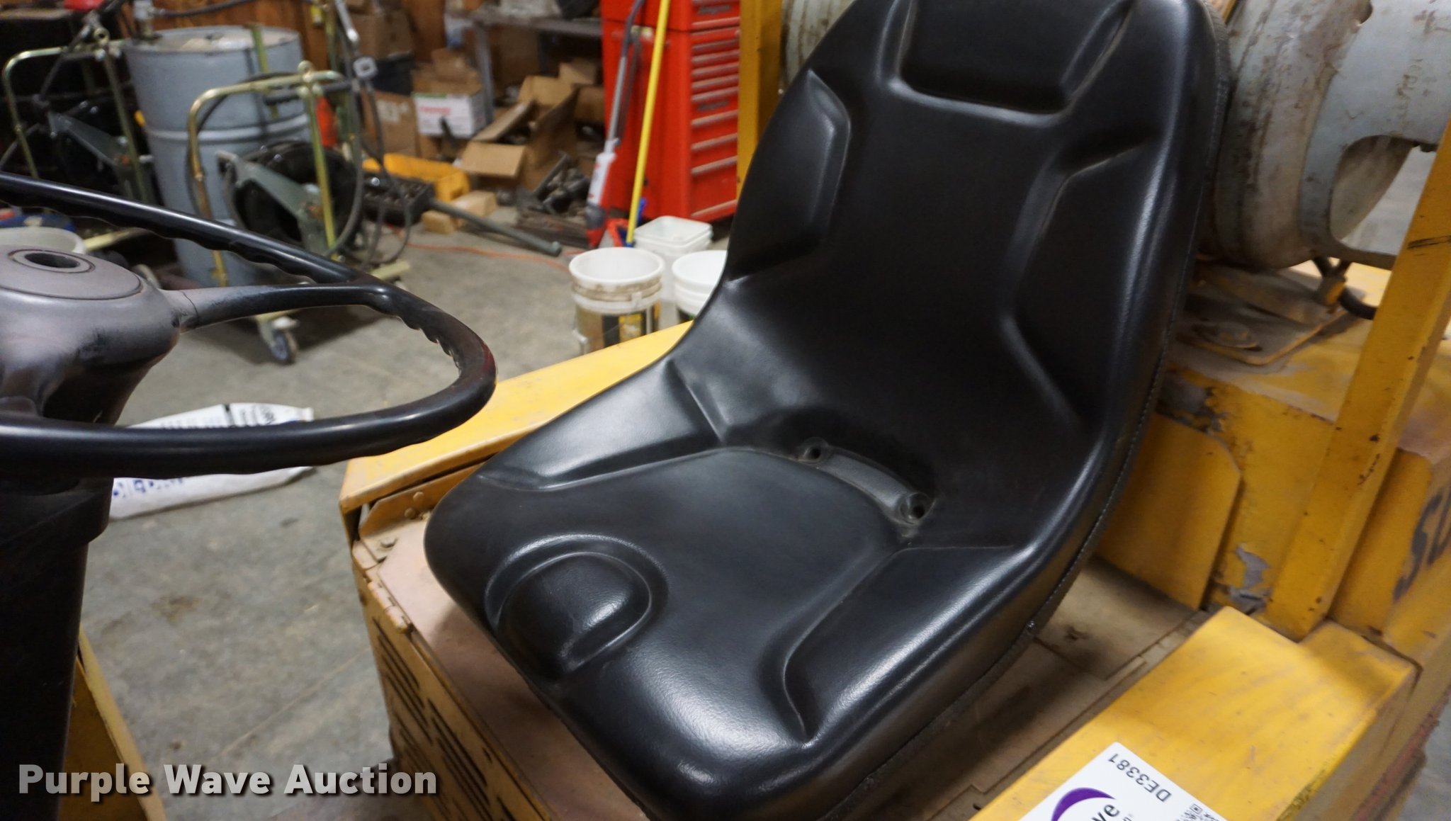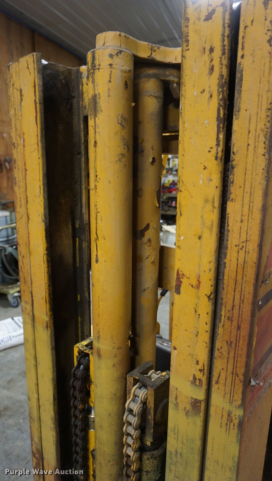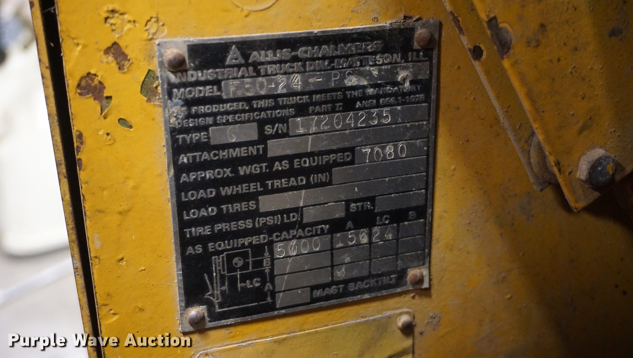 Purple Wave is selling a used Cushion Tire or Pneumatic Forklift in Kansas. This item is a Allis Chalmers F50-24-PS forklift with the following: Allis Chalmers four cylinder propane engine, Hydrostatic transmission, 1F-1R gears, OROPS, 5,000 lbs max lift capacity, 156" max lift height, Three stage mast, Mast tilt, 48" fork length, 18x7x12 1/8 solid front tires, 16 1/4x5x11 1/4 solid rear tires, Operators manual, Propane bottle included, Serial 17204235
