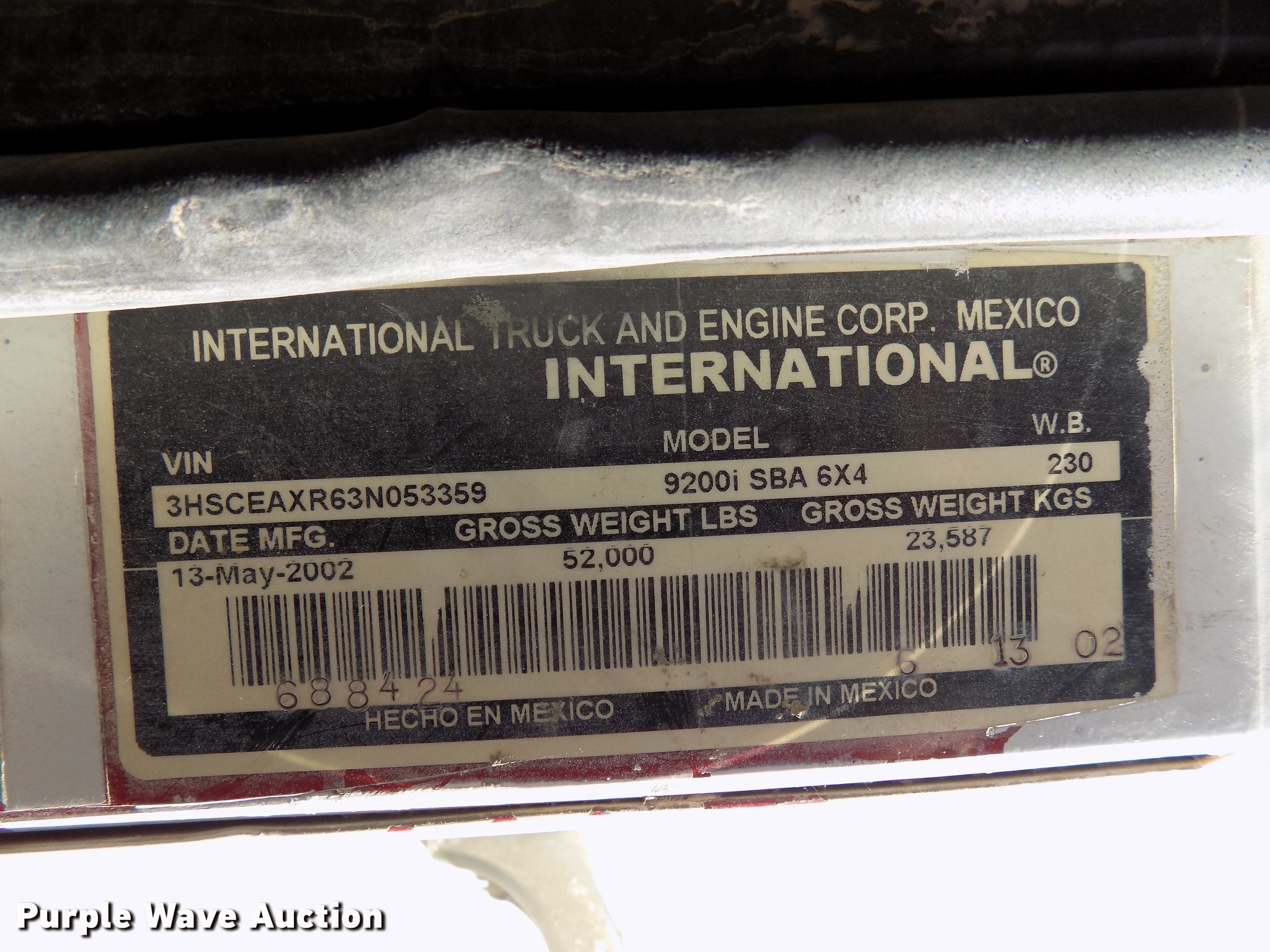 Purple Wave is selling a used Truck Tractor in Kansas. This item is a 2003 International 9200i semi truck with the following: 860,340 miles on odometer, Caterpillar C12 12.0L L6 turbo diesel engine, Serial 2KSB2215, 10 speed manual transmission, Tandem axle, Inter-axle differential lock, AC and heat, Cruise, AM/FM/CD, Power windows and locks, Power and heated mirrors, Air suspension seat, Sleeper, Single bed, Refrigerator, PTO, Single exhaust stack, Sliding fifth wheel plate, Dual fuel tanks, Air suspension, Air brakes, 285/75R24.5 tires, GVWR 52,000 lbs, FAWR 12,000 lbs, IAWR 20,000 lbs, RAWR 20,000 lbs, Trailer not included
