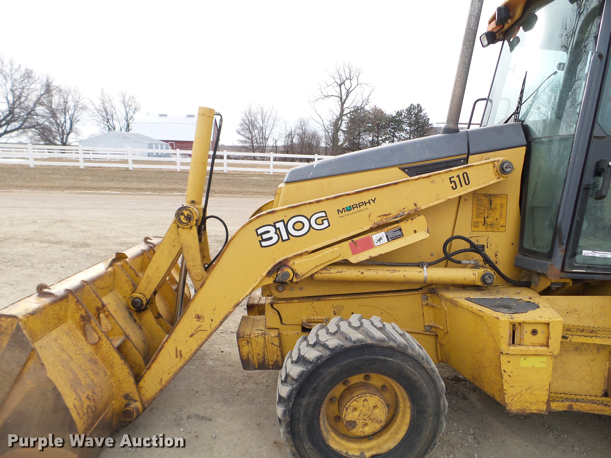 Purple Wave is selling a used Tractor Loader Backhoe in Iowa. This item is a 2005 John Deere 310G backhoe with the following: 8,958 hours on meter, John Deere four cylinder turbo diesel engine, Shuttle shift transmission, 4F-4R gears, Four wheel drive, EROPS, Heat, AM/FM, Suspension seat, Wobble stick backhoe controls, Wipers, Front and rear work lights, John Deere 85"W loader bucket, Bolt-on cutting edge, Extendable stick, 23"W backhoe bucket, (5) teeth, Auxiliary hydraulics, Front counter weights, 12-16.5 front tires, 19.5-24 rear foam filledtires, Serial T0310GX947231
