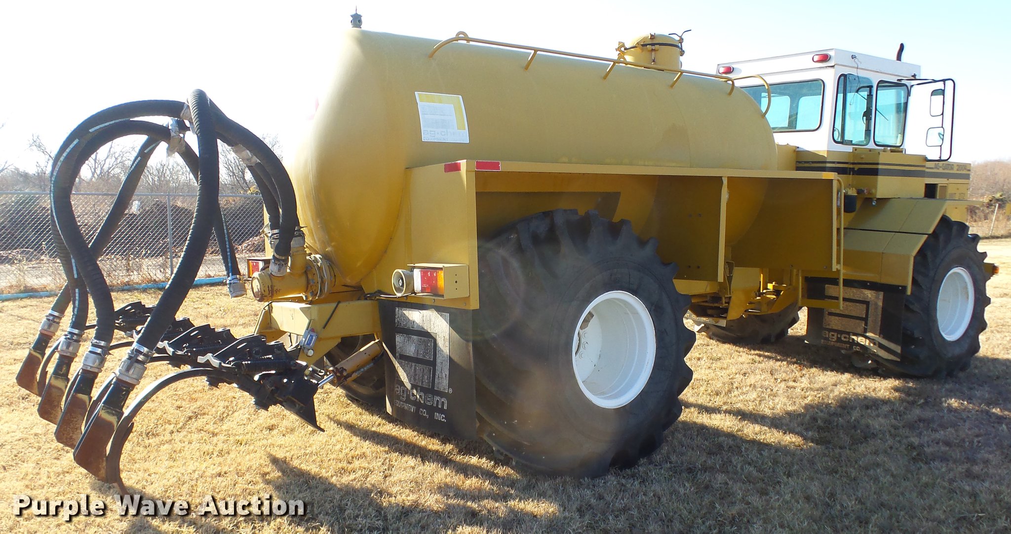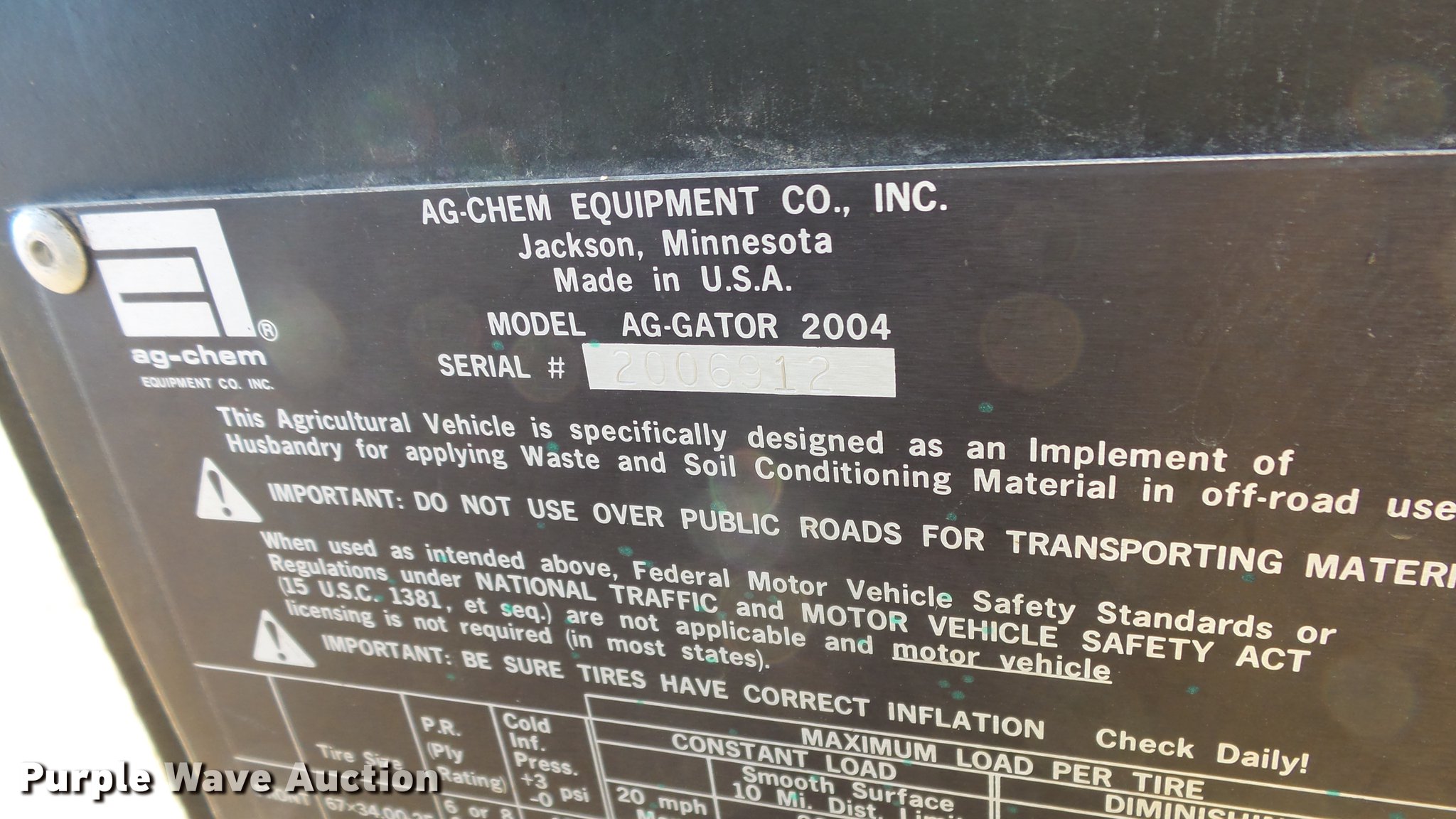 Purple Wave is selling a used Applicator Self Propelled in Kansas. This item is a 2004 Ag Gator waste applicator with the following: 6,651 miles on odometer, 1,832 hours on meter, Cummins six cylinder turbo diesel engine, Eaton Fuller Road Ranger 10 speed manual transmission, Four wheel drive, Enclosed cab, AC and heat, AM/FM, Work lights, Chelsea PTO, Ag Chem organic waste application system, Injector system, Sludge system, Vacuum pump, Steel tank, (5) row applicators, Hydraulic lift, Approximately 8' working width, 67 x 34.00-25 tires, Serial 2006912