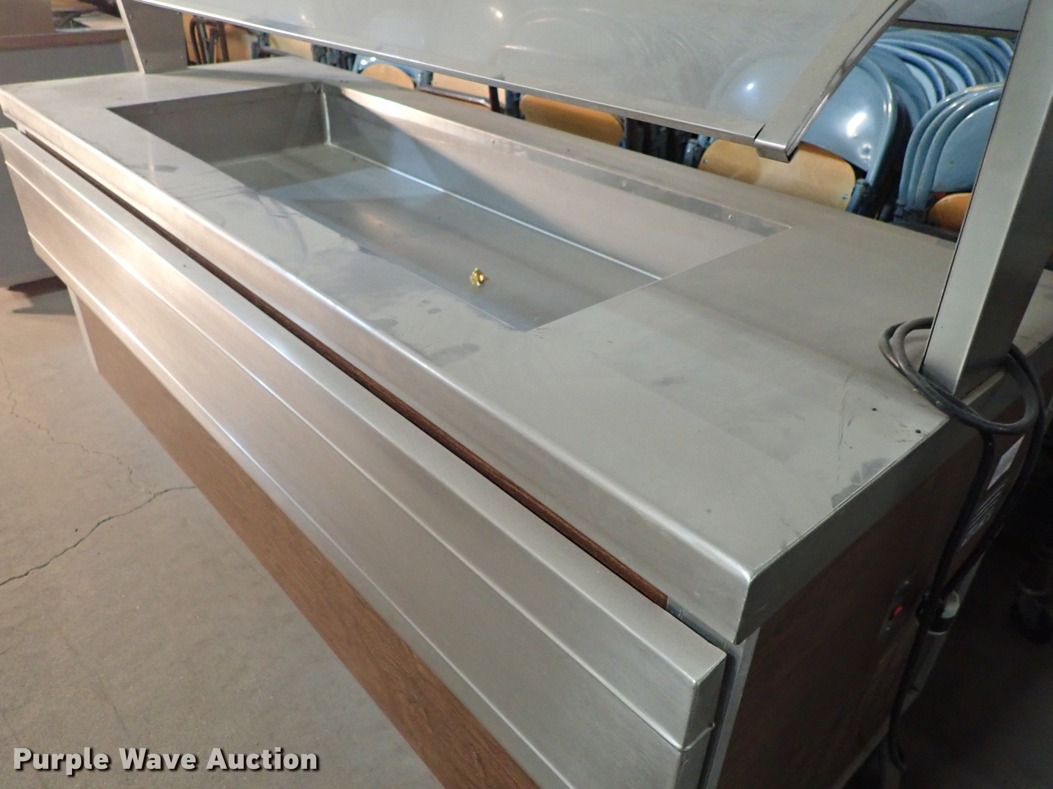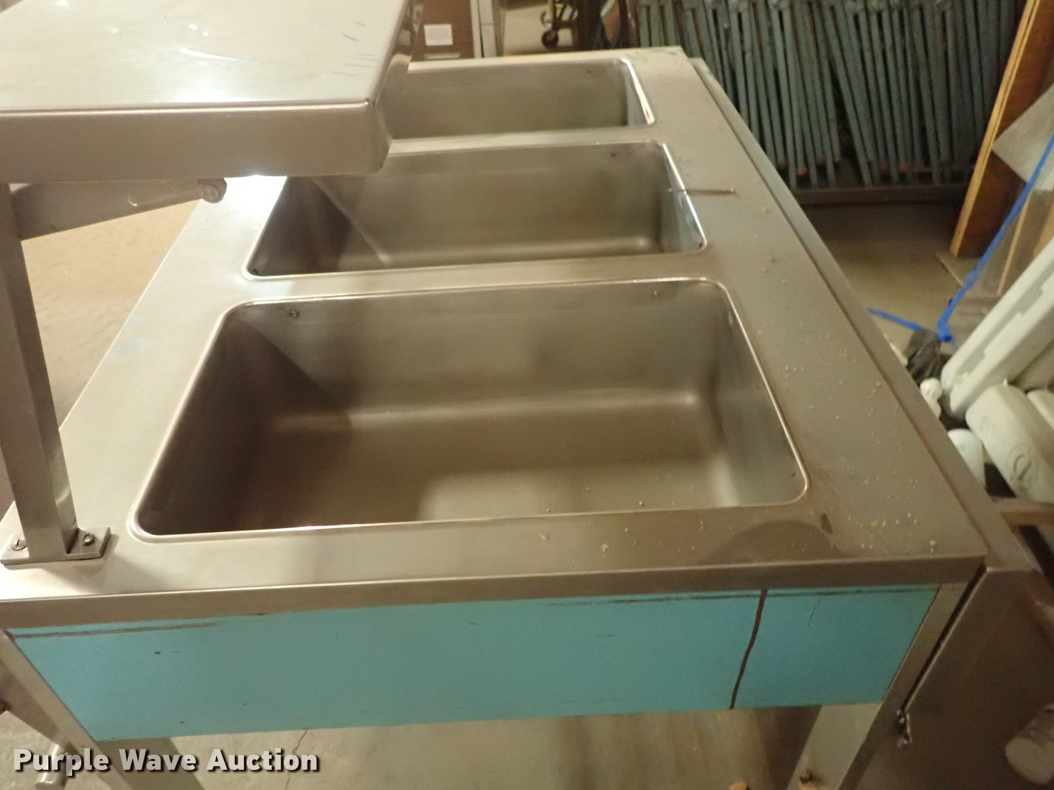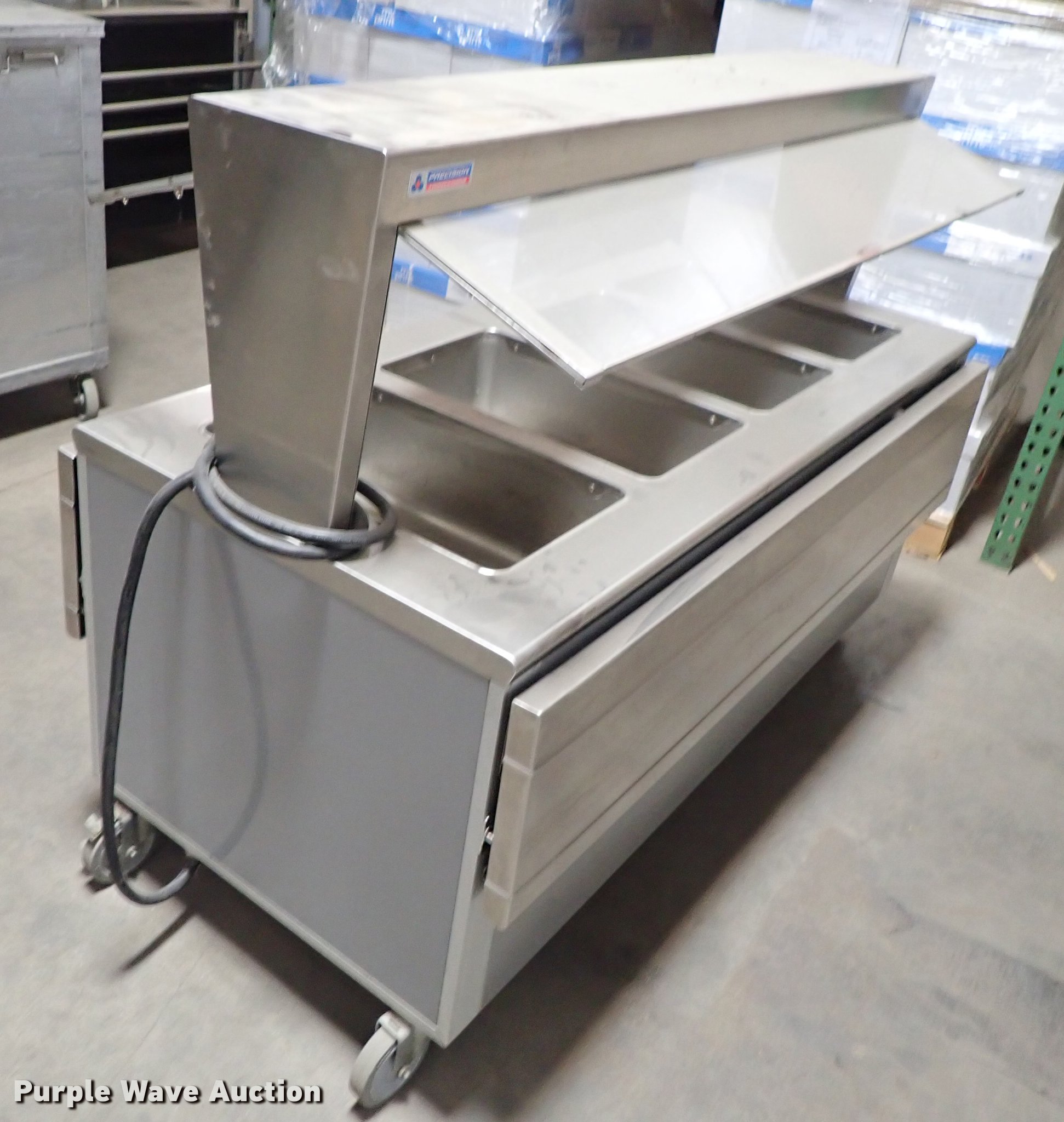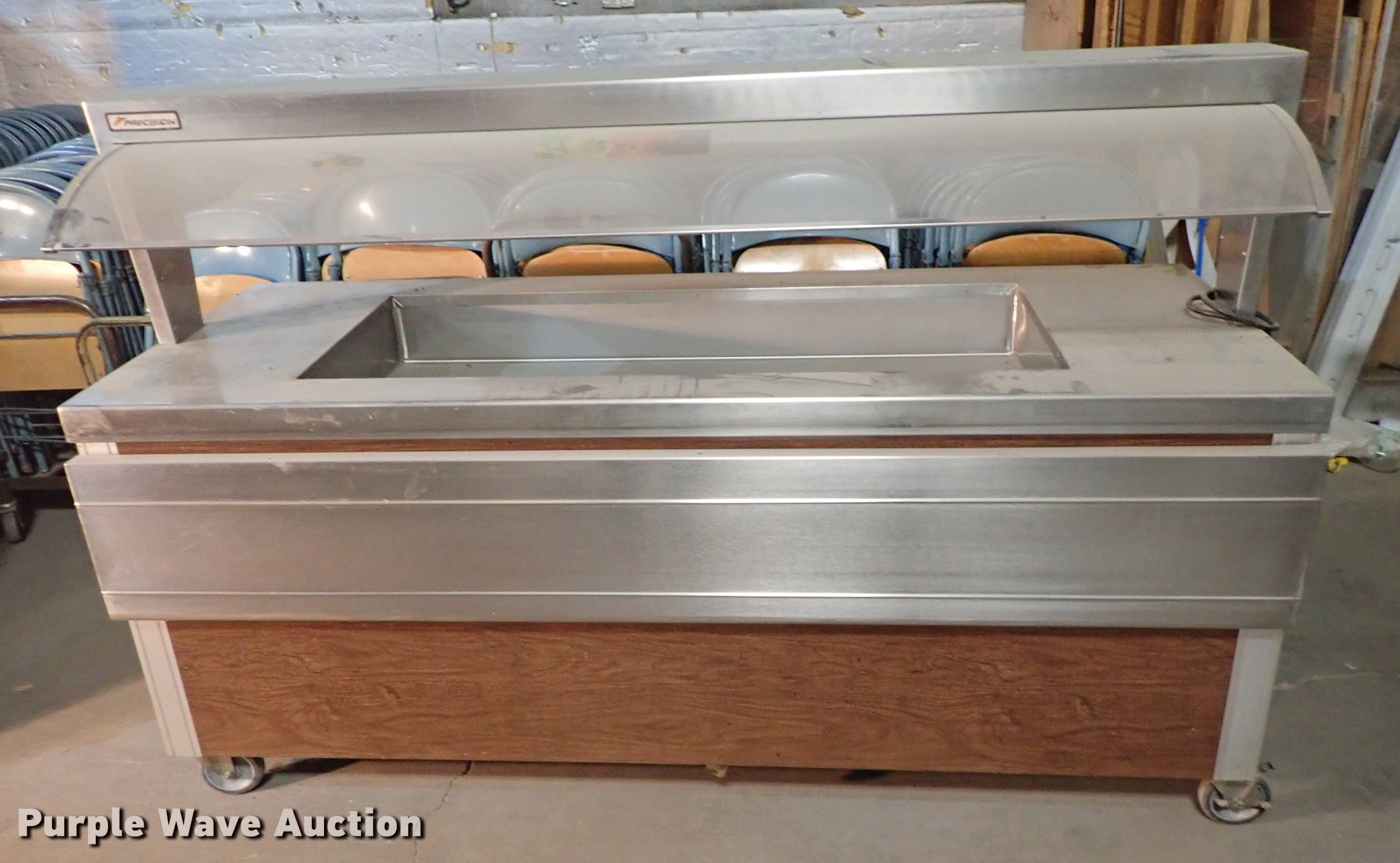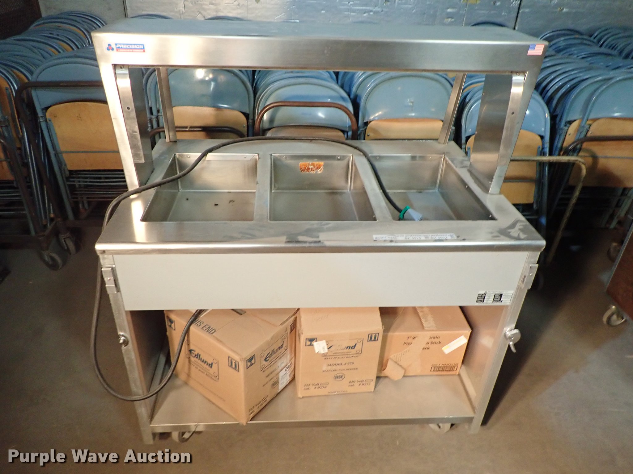Purple Wave is selling a used Restaurant Equip. in Kansas. This item is a Restaurant equipment with the following: Beverage Air milk cooler, Precision three well hot table, Three well hot table, Atlas serving table, Precision serving table, Precision PSB-79-R serving table, Metal warming cart, Precision four well hot table, Atlas three well hot table, Beverage Air cooler, Precision RSU-401 warmer, Unknown operating conditions
