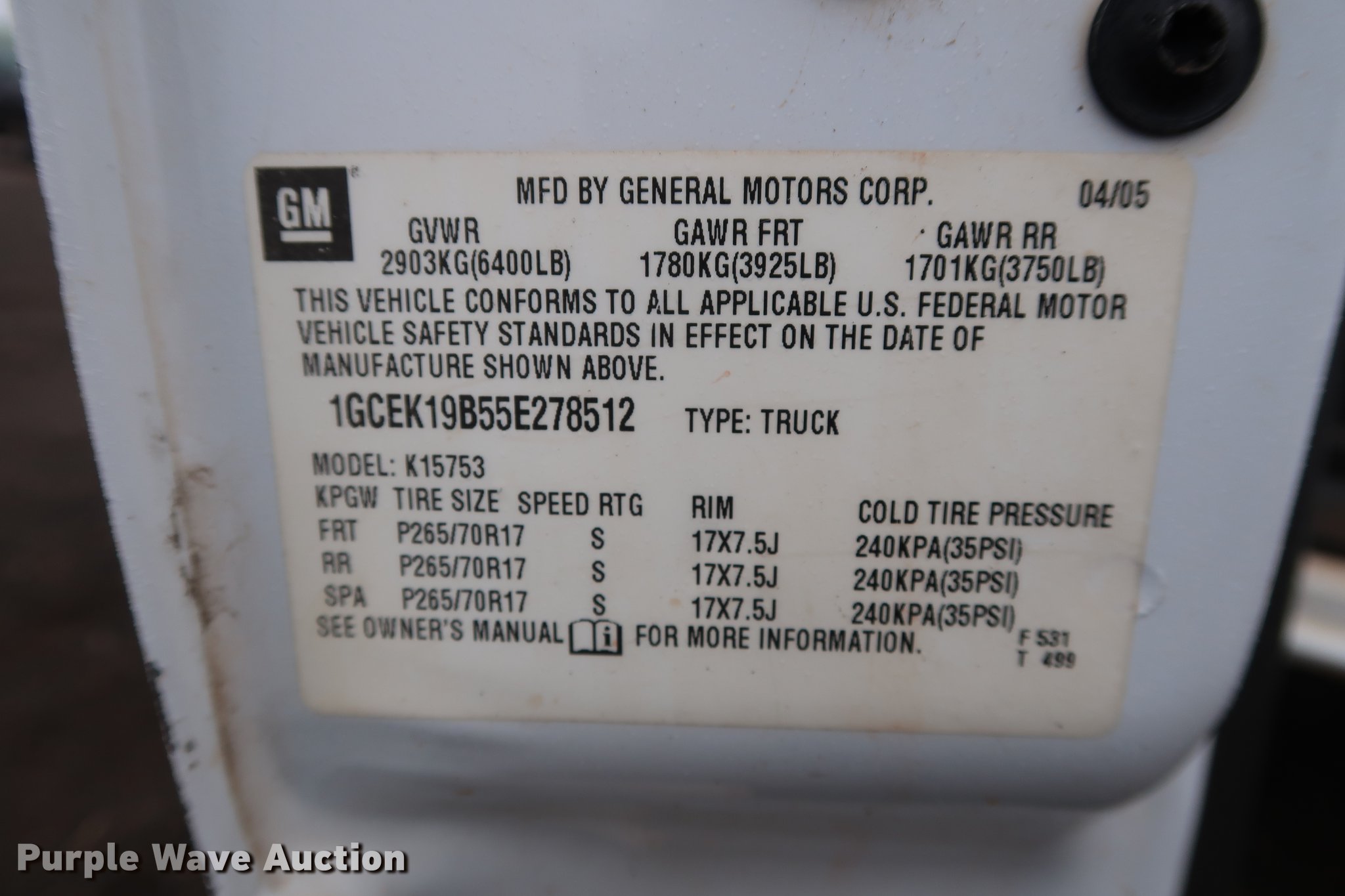 Purple Wave is selling a used 1/2 Ton Pickup or Van in Oklahoma. This item is a 2005 Chevrolet Silverado 1500 Ext. Cab pickup truck with the following: 131,782 miles on odometer, 5.3L V8 OHV 16V gas engine, Automatic transmission, Four wheel drive, AC and heat, Tilt, Cruise, AM/FM/CD, Power windows, locks, and mirrors, Cloth interior, Receiver hitch, Trailer wiring, Firestone LT265/70R17 tires, Unit# D301-159