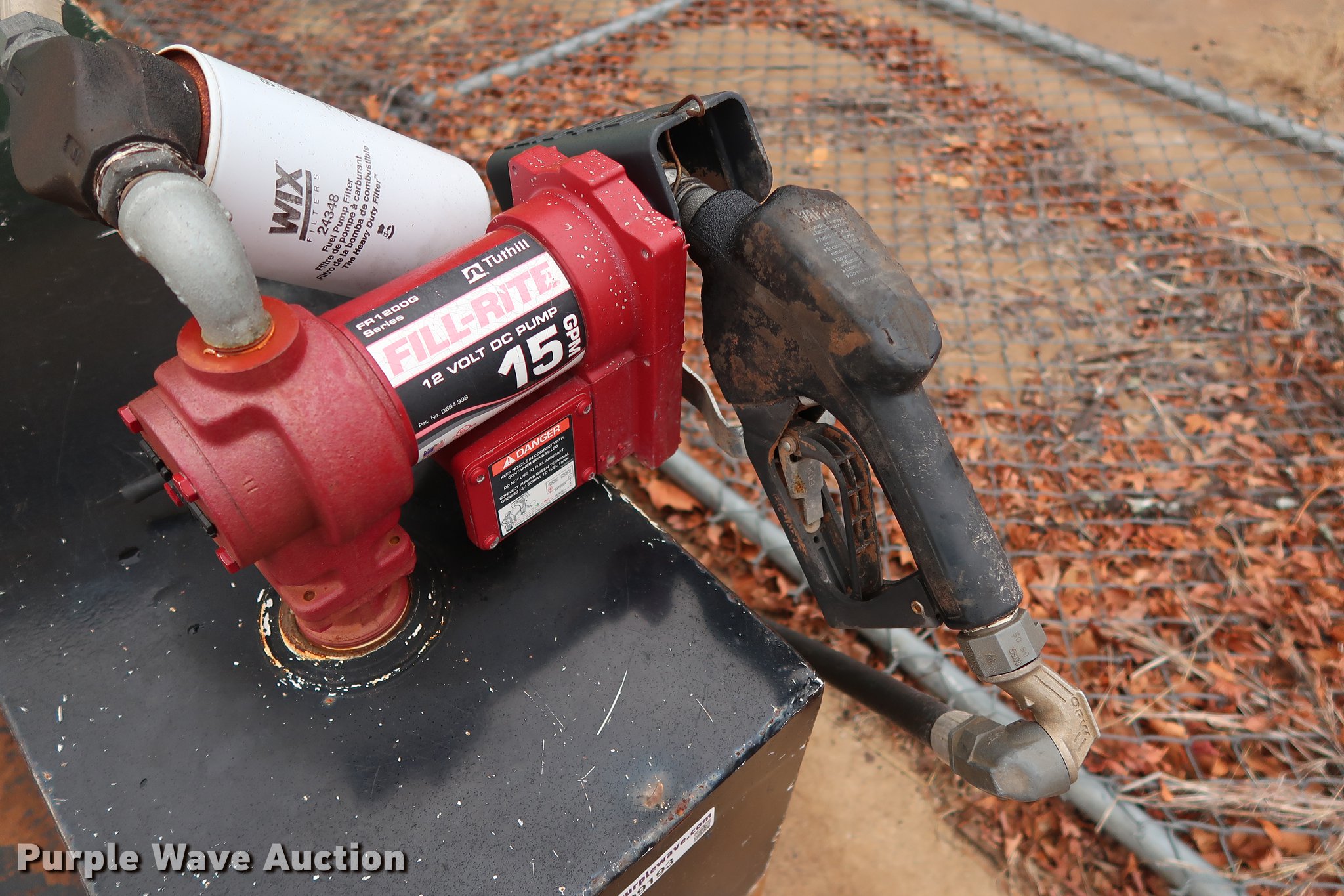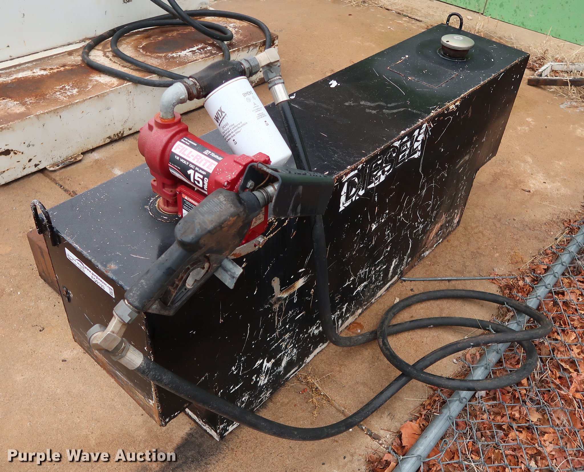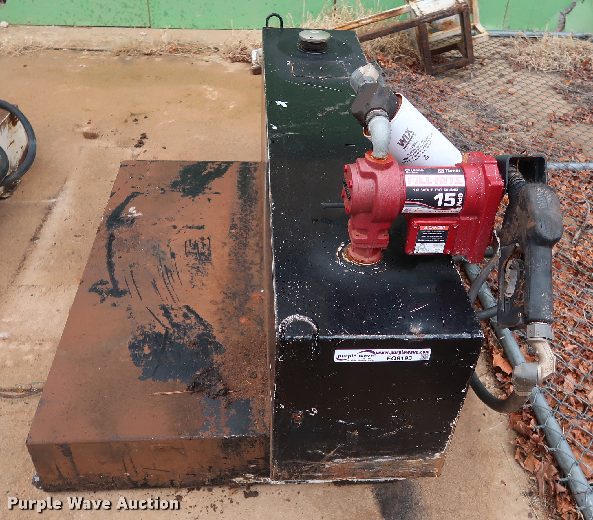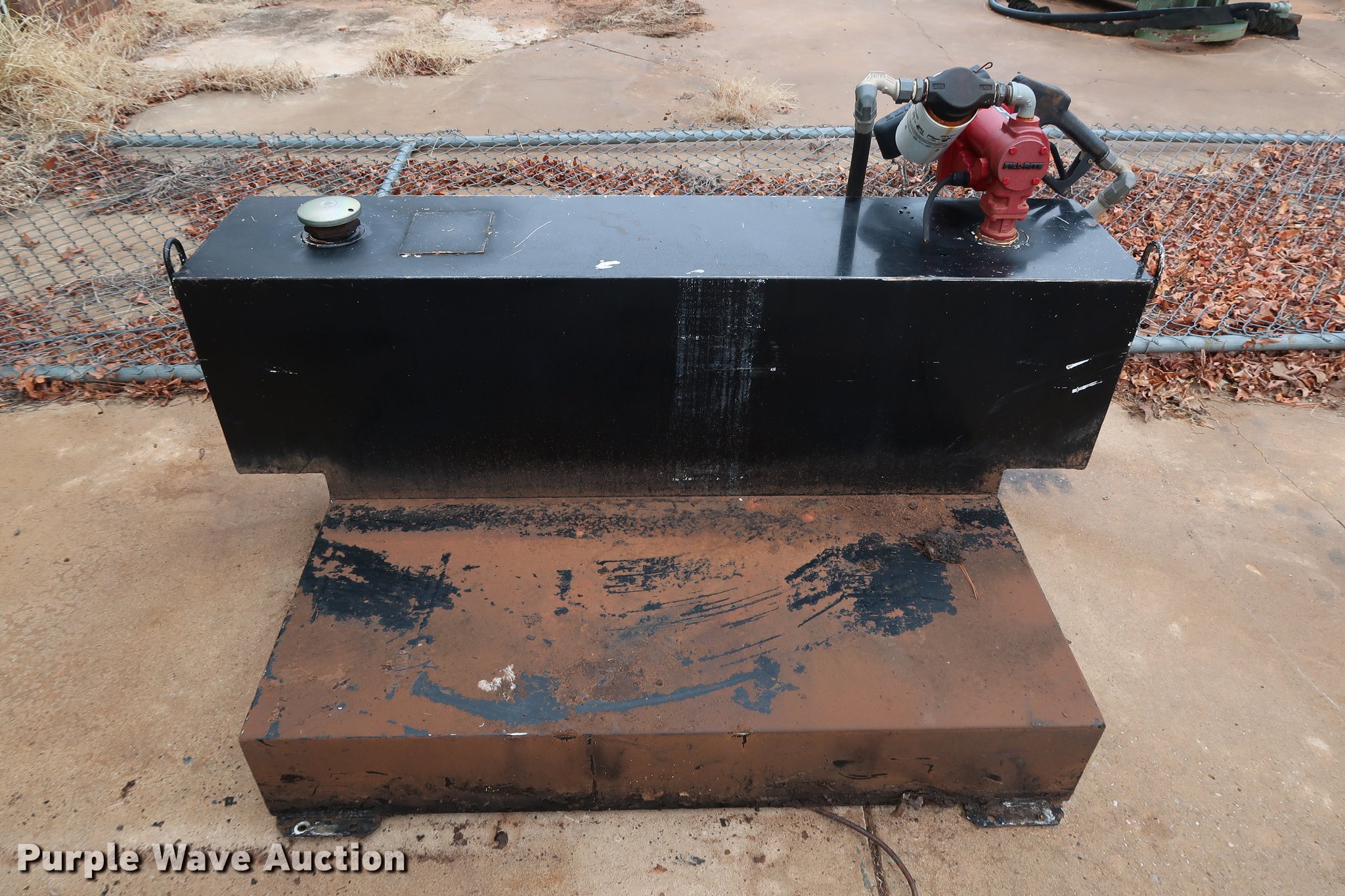 Purple Wave is selling a used Fuel and Lube in Oklahoma. This item is a Delta Consolidated Industries L-shaped fuel tank with the following: 60"W x 33"D x 25.5"H, 100 gallon capacity, Fill-Rite pump hose nozzle assembly