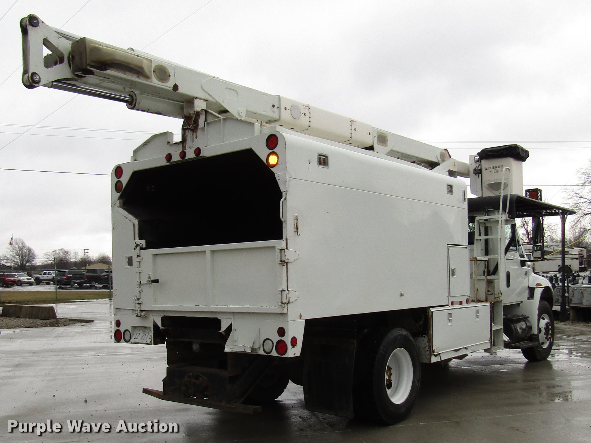 Purple Wave is selling a used Bucket Truck in Illinois. This item is a 2006 International 4400 bucket truck with the following: 171,704 miles on odometer, 15,183 hours on meter, International DT466 7.6L L6 turbo diesel engine, Serial 466HM2U2070673, Six speed manual transmission, Single axle, AC and heat, AM/FM, Air suspension seat, Brake controller, Backup alarm, Beacon light, Block heater, PTO, Arbortech chip bed, 17.5'L, Catwalk, Work lights, Hydraulic dump, 2005 Hi-Ranger XT60 boom, 60' boom length, 350 lbs max lift capacity, Man basket, 65' max lift height, Ground and platform controls, Boom rotation, Insulated boom, (2) outriggers, Serial 20507227162, DP 20UA9B3R2G winch system, 20,000 lbs capacity, Serial 38476605R07, Single fuel tank, Quick-connect power outlet, Pintle hitch, Trailer wiring, Spring suspension, Air brakes, 207" wheelbase, 315/80R22.5 front tires, 11R22.5 rear tires, Engine overhauled at 141,222 miles, View dielectric test report