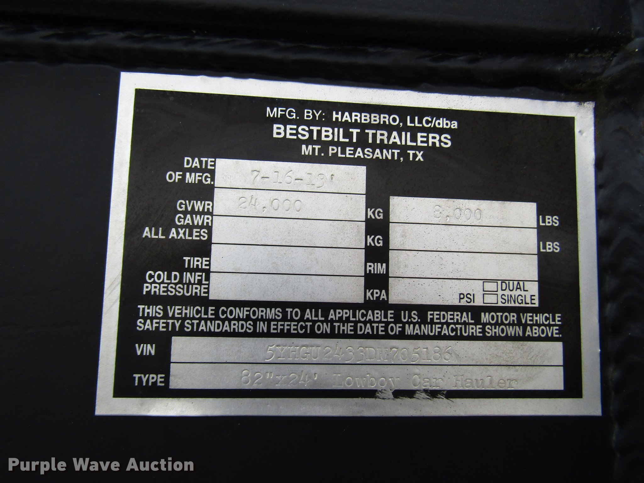 Purple Wave is selling a used Car or Utility Trailer in Pennsylvania. This item is a 2013 Bestbilt utility trailer with the following: 32.5' overall length, 24'L x 82"W wood deck, Tolley model CCBTP, Two ton maximum capacity, Toolbox, Gooseneck hitch, Dual leg landing landing gear, Spring suspension, Electric brakes, Triple axle, Steel wheels, 235/80R16 tires, GVWR 24,000 lbs, GAWR 8,000 lbs, Unit# T180