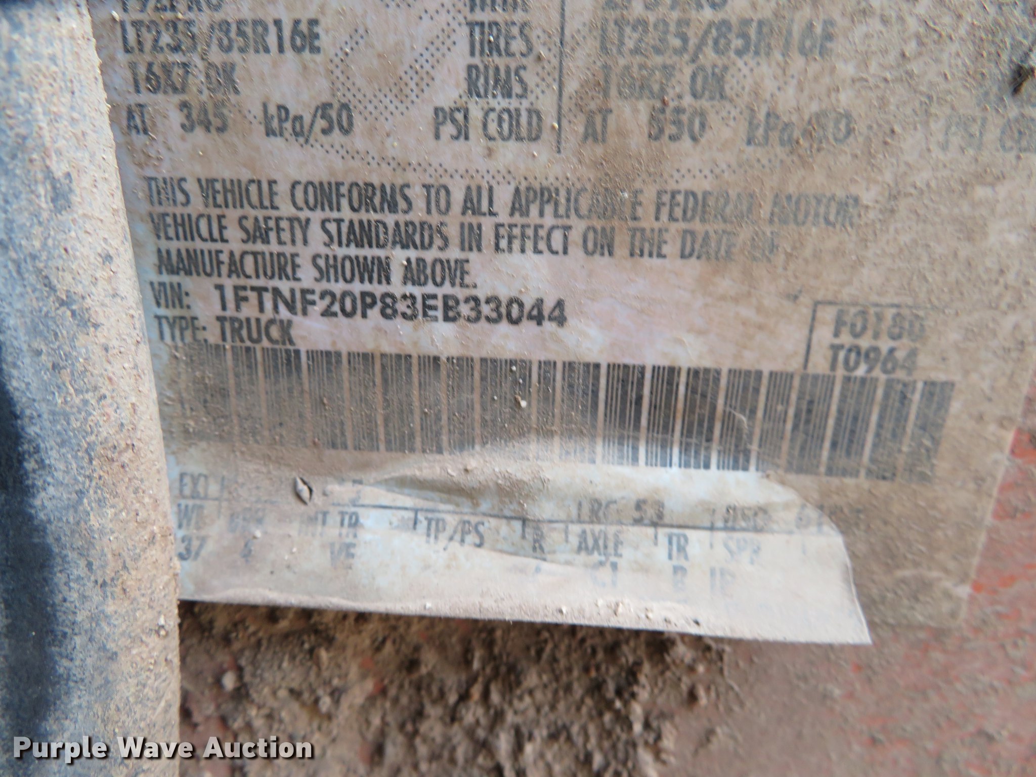 Purple Wave is selling a used 3/4 or 1 Ton Pickup or Van in Oklahoma. This item is a 2003 Ford F250 Super Duty pickup truck with the following: 184,860 miles on odometer, 6.0L V8 OHV 32V turbo diesel engine, Automatic transmission, AC and heat, AM/FM, Cloth interior, Long bed, 235/85R16 tires, EGR delete, ARP cylinder head studs installed