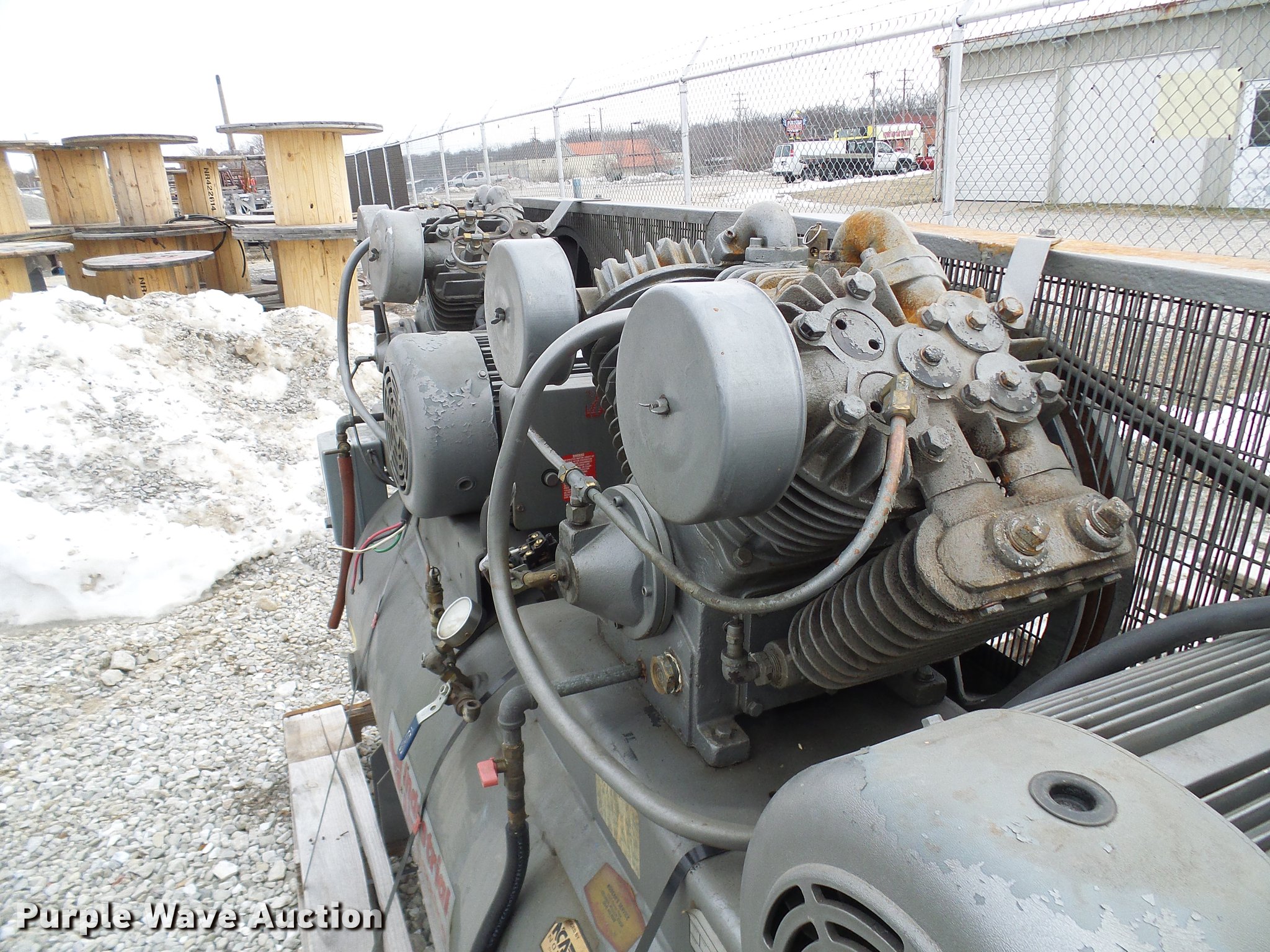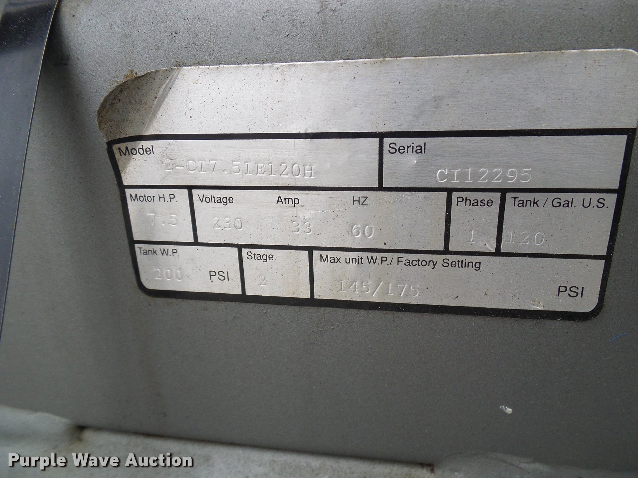 Purple Wave is selling a used Air Compressor in Missouri. This item is a Air compressor with the following: Model 2-C17-51E120H, Marathon single phase electric motor, 7.5 HP, 230V, 120 gallon tank, 200 psi capacity, Serial CI2295