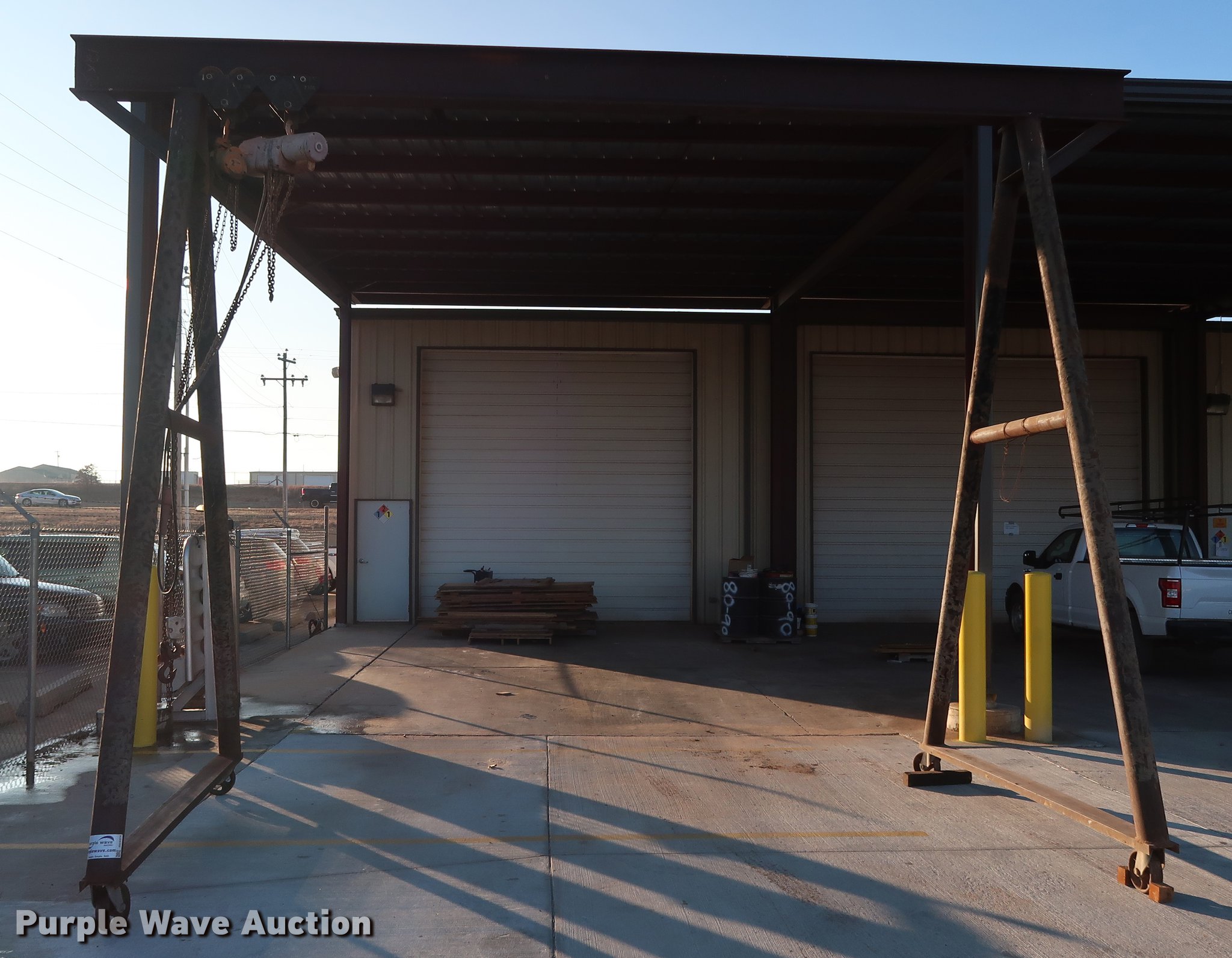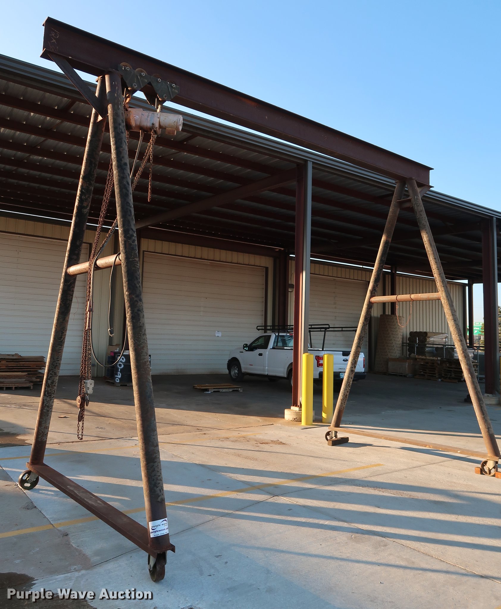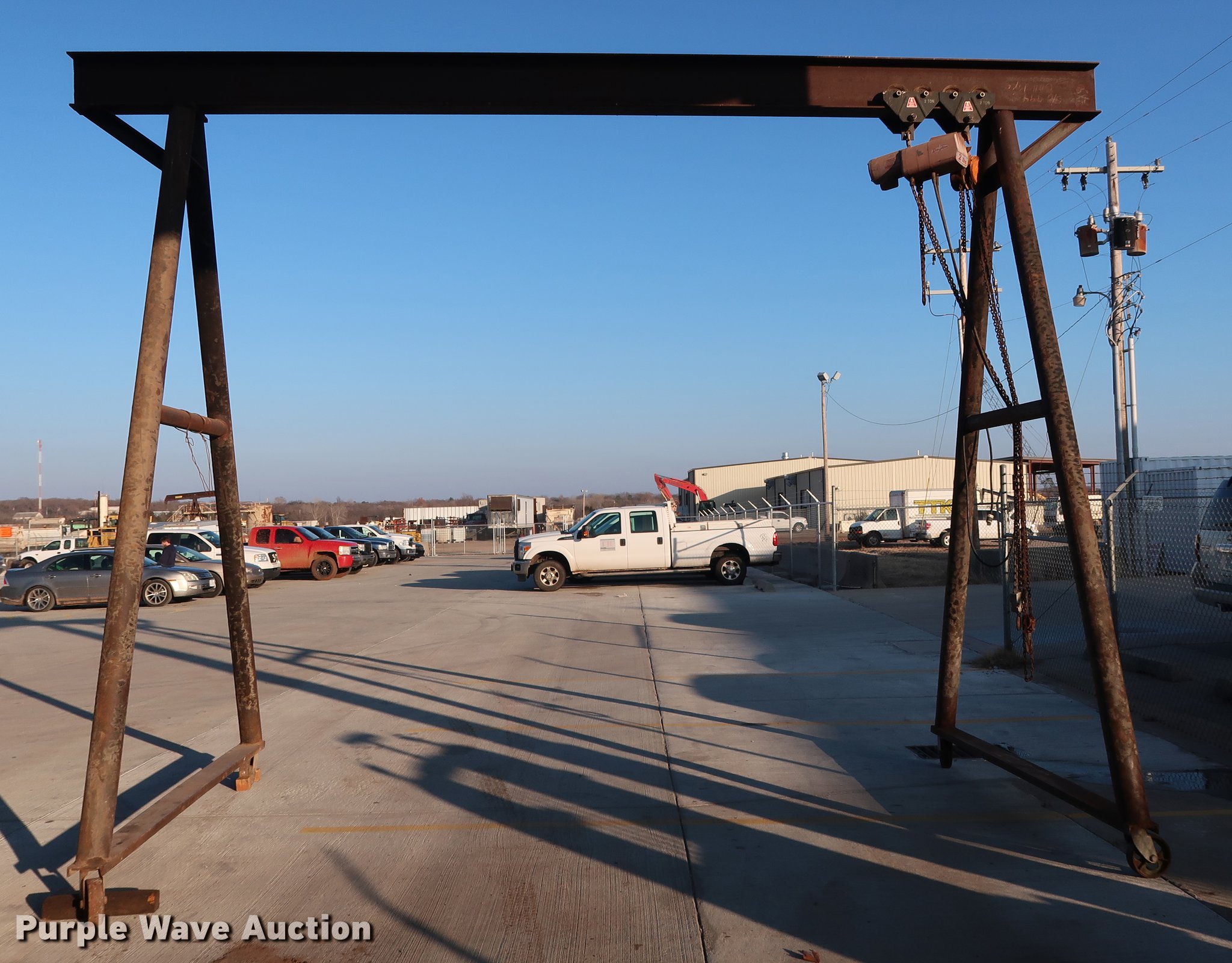 Purple Wave is selling a used Overhead or Straddle Crane in Oklahoma. This item is a A-frame overhead crane hoist with the following: 20'W x 9.5'D x 14.5'H, (2) Dayton 2Z617A hoist trolleys, Two ton capacities, 8,000 lbs capacity, Electric and manual operation