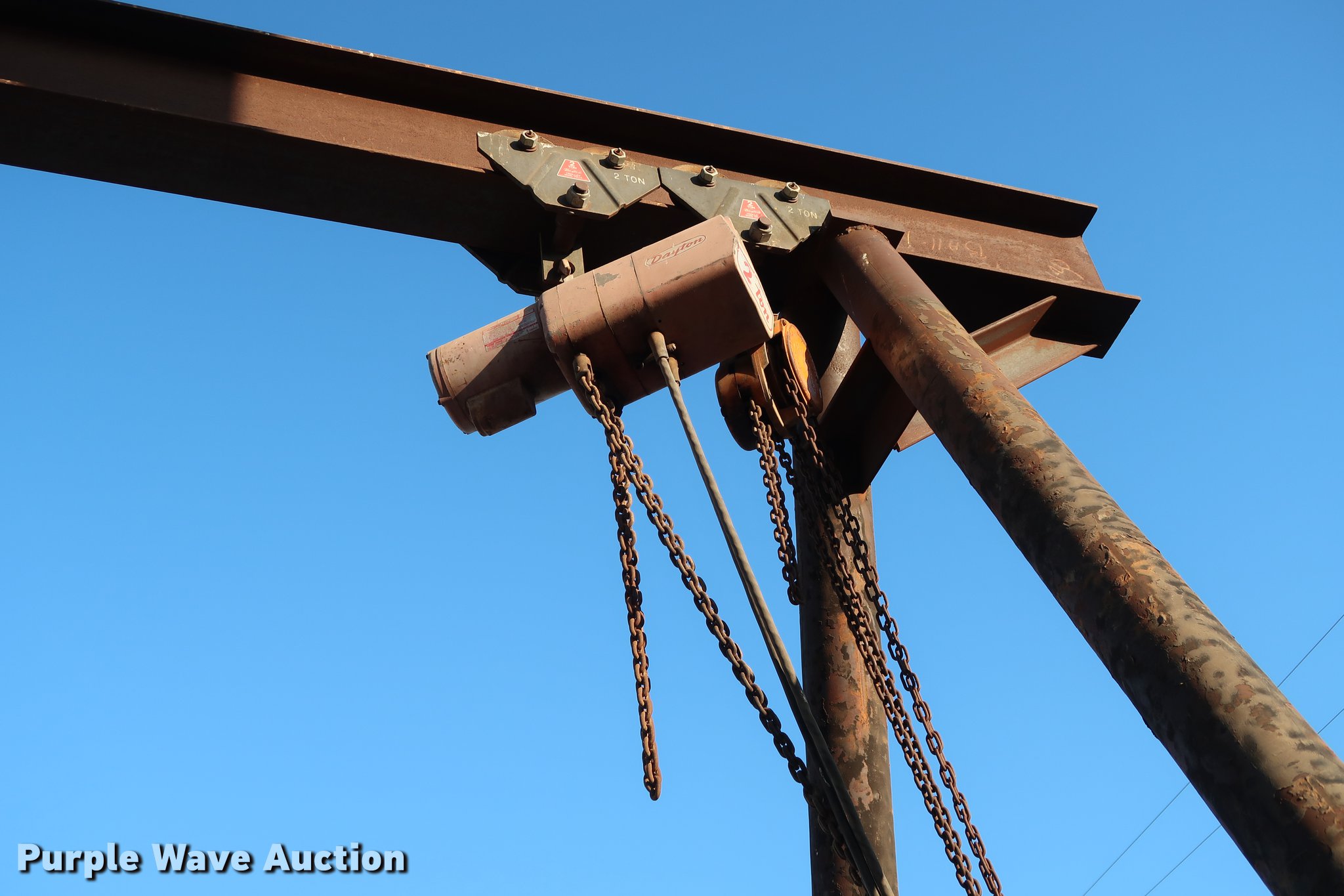 A-frame overhead crane hoist. 20'W x 9.5'D x 14.5'H, (2) Dayton 2Z617A hoist trolleys Two ton capacities, 8,000 lbs capacity, Electric and manual operation. Duit Holdings Inc. - Open inspection Feb. 26. 7183 E Waterloo Industrial Rd. Edmond, OK 73034