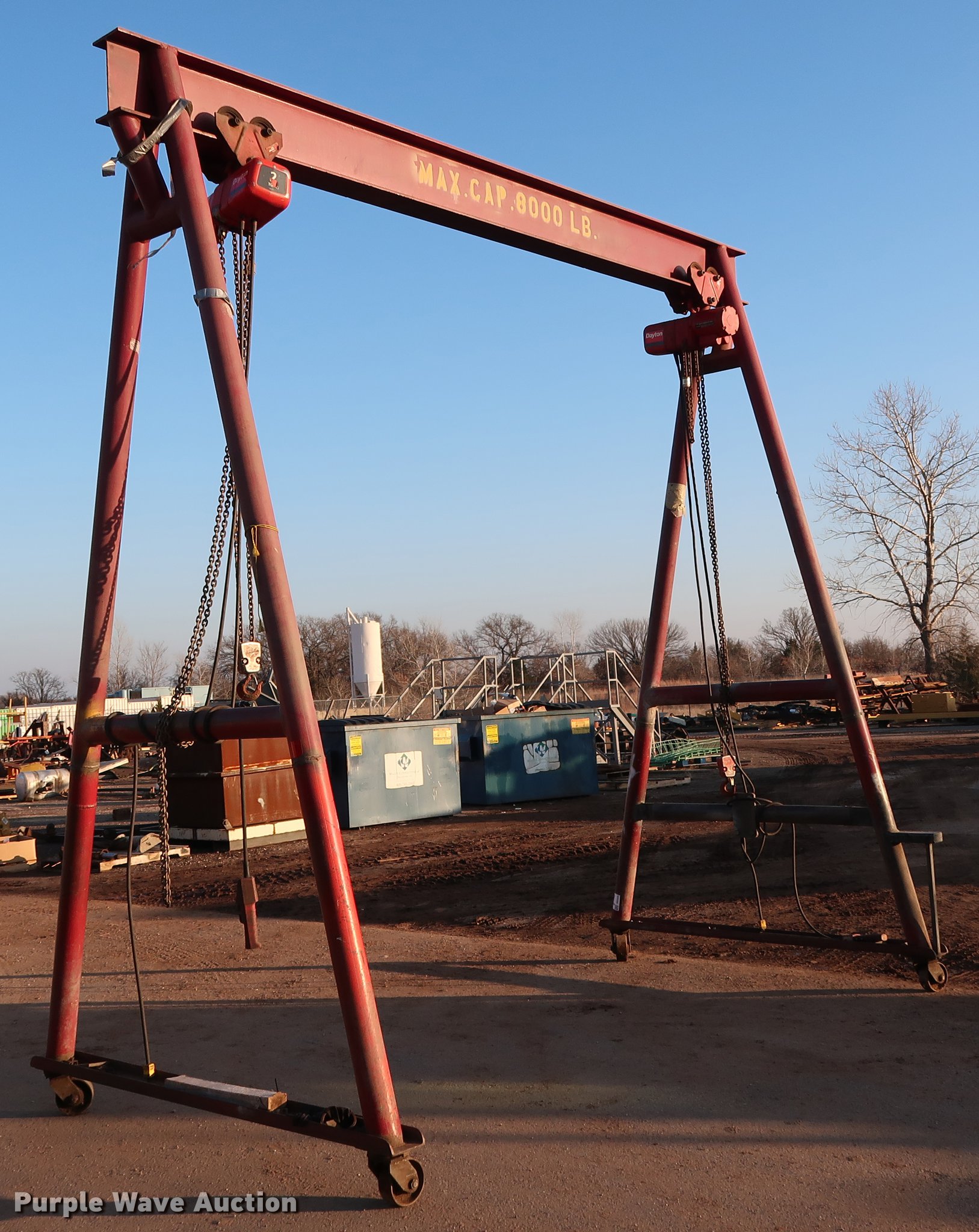 A-frame overhead crane hoist. 13.5'W x 7'D x 13.5'H, (2) Dayton hoist trolleys Two ton capacities, 8,000 lbs capacity, Electric operation. Duit Holdings Inc. - Open inspection Feb. 26. 7183 E Waterloo Industrial Rd. Edmond, OK 73034