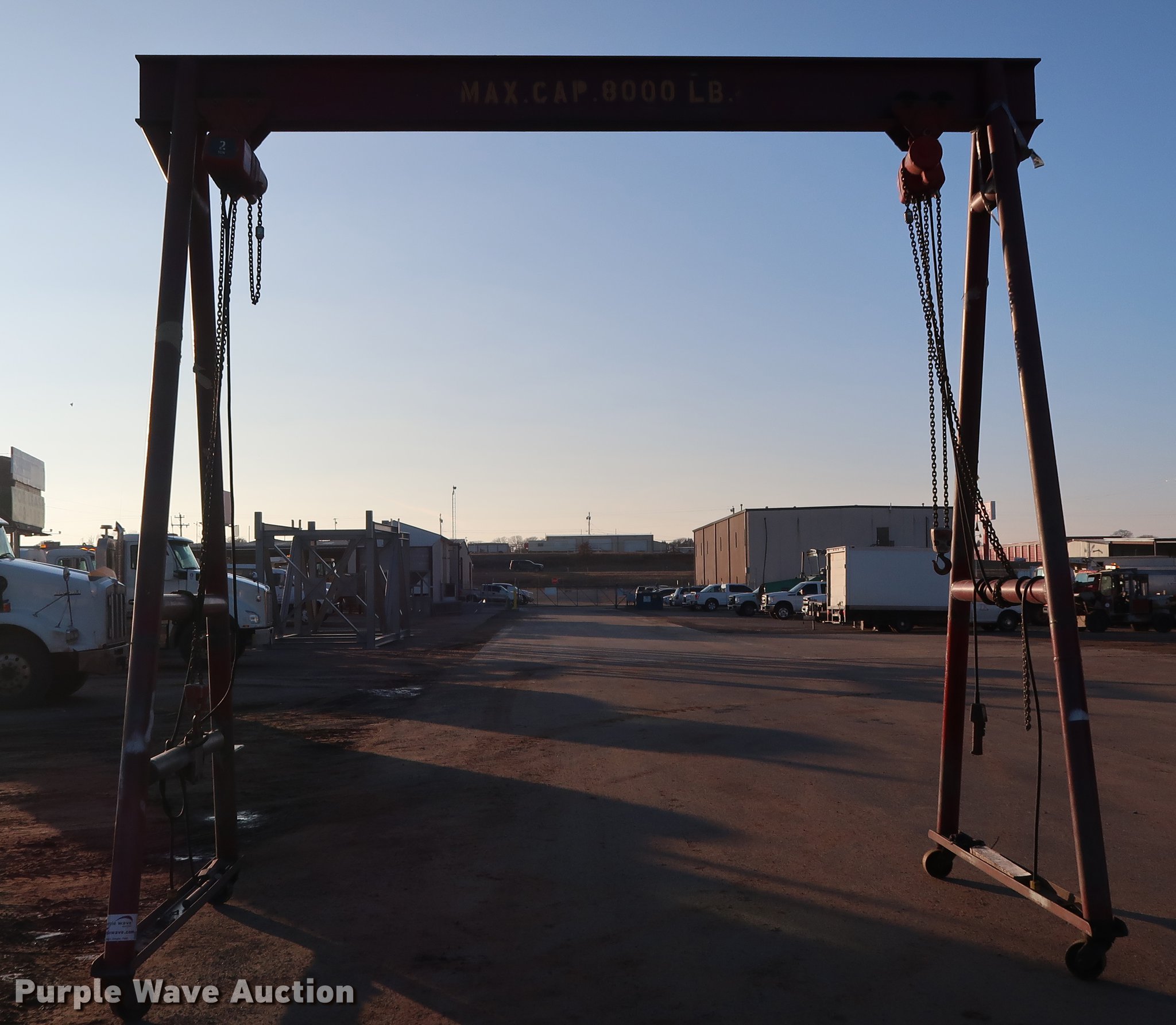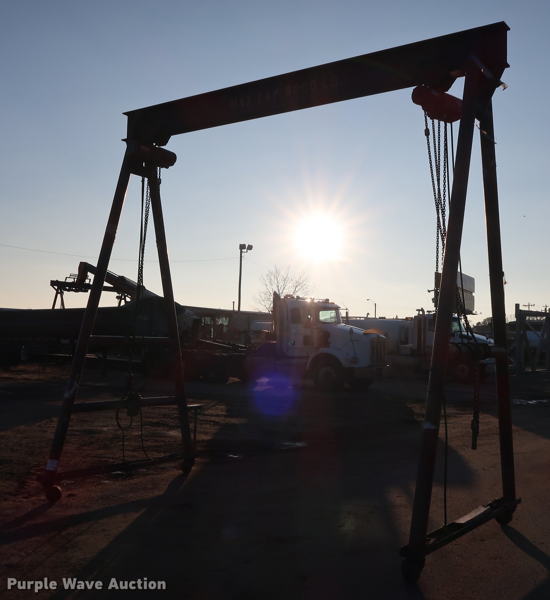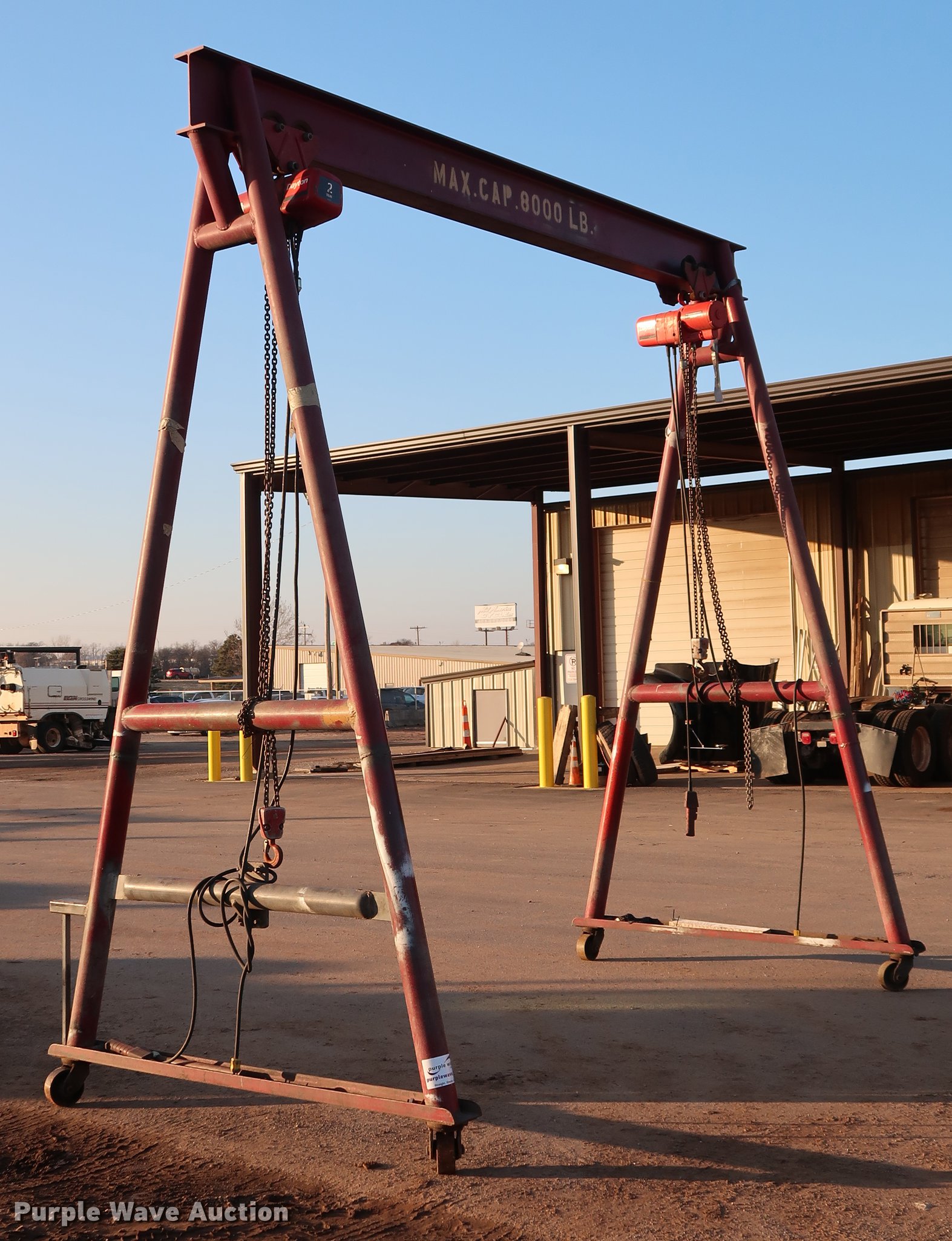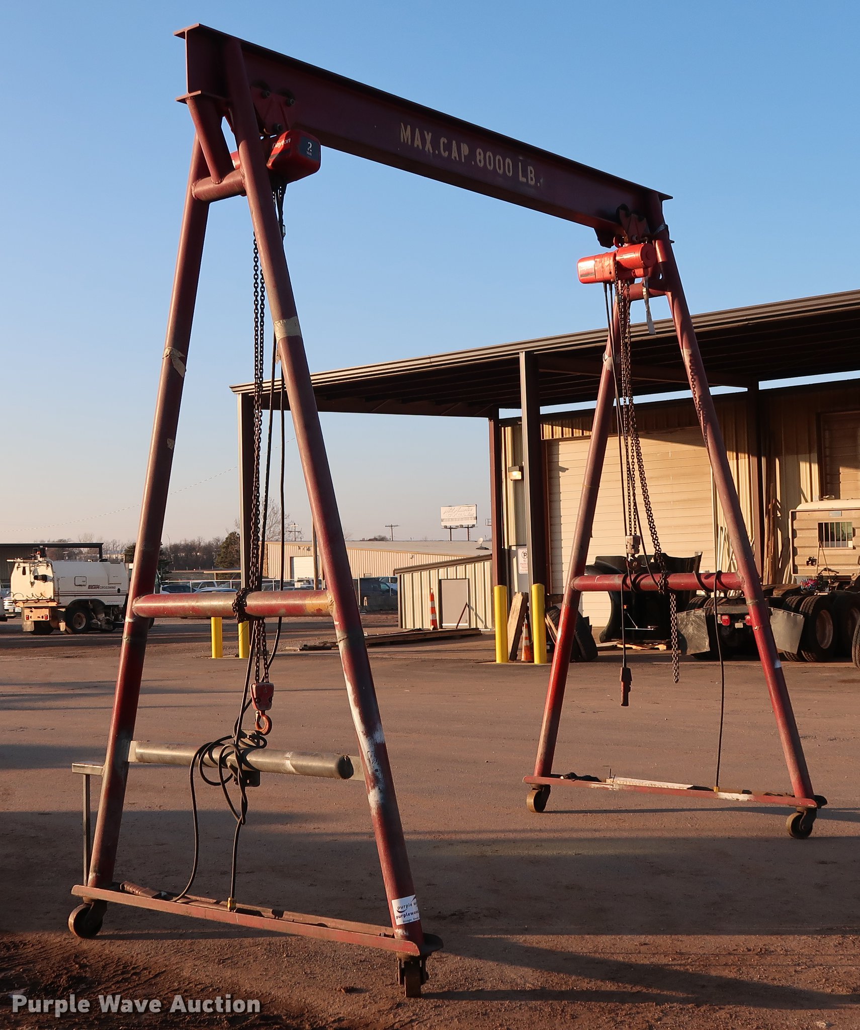 Purple Wave is selling a used Overhead or Straddle Crane in Oklahoma. This item is a A-frame overhead crane hoist with the following: 13.5'W x 7'D x 13.5'H, (2) Dayton hoist trolleys, Two ton capacities, 8,000 lbs capacity, Electric operation