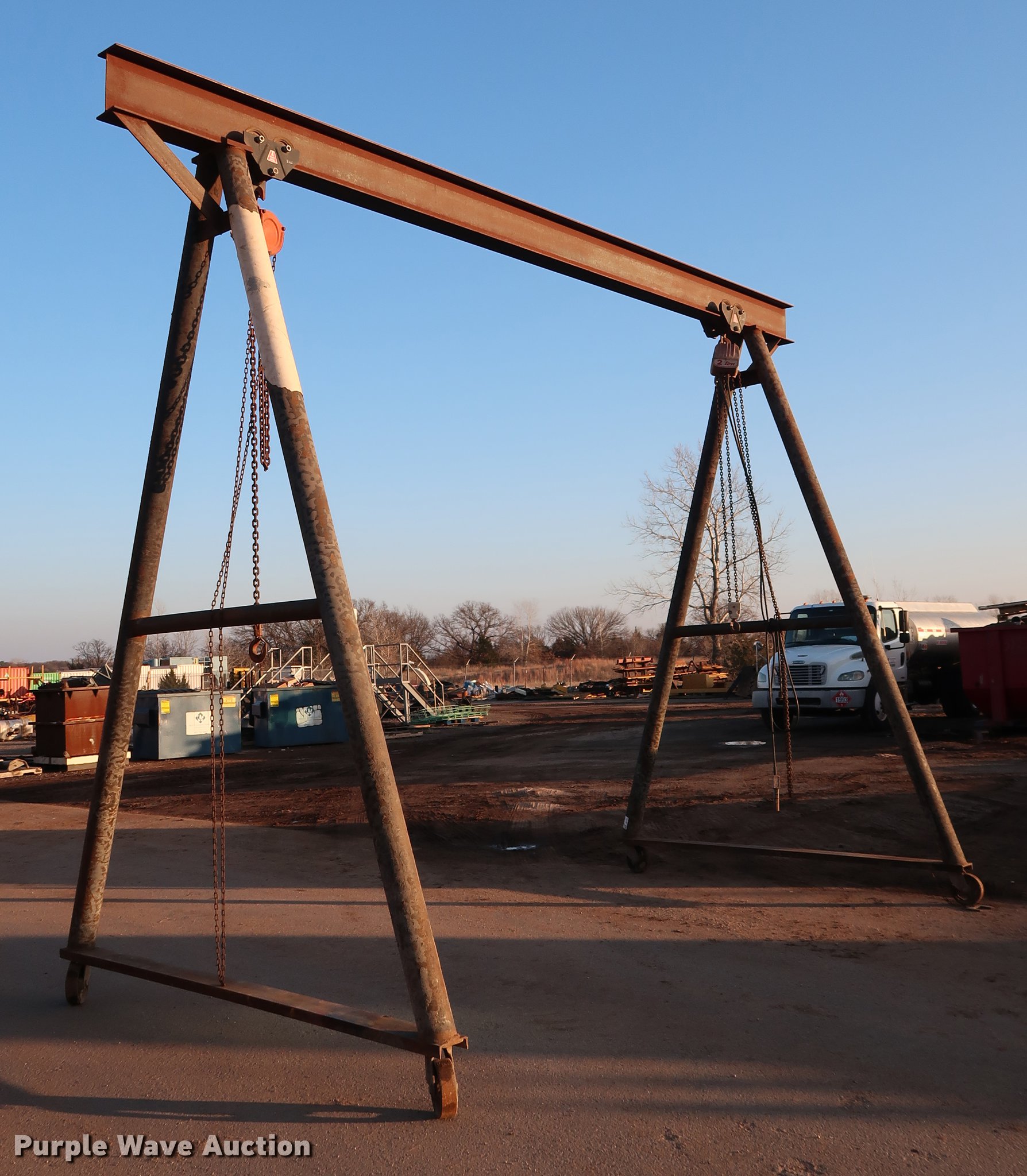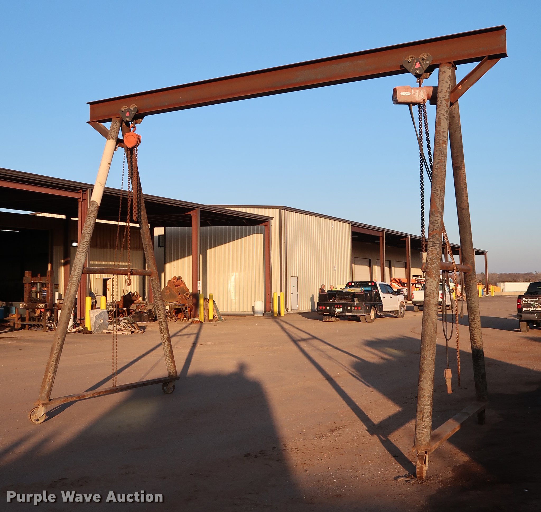 Purple Wave is selling a used Overhead or Straddle Crane in Oklahoma. This item is a A-frame overhead crane hoist with the following: 16.5'W x 9.5'D x 14.5'H, (2) Dayton hoist trolleys, Two ton capacities, 8,000 lbs capacity, Electric and manual operation