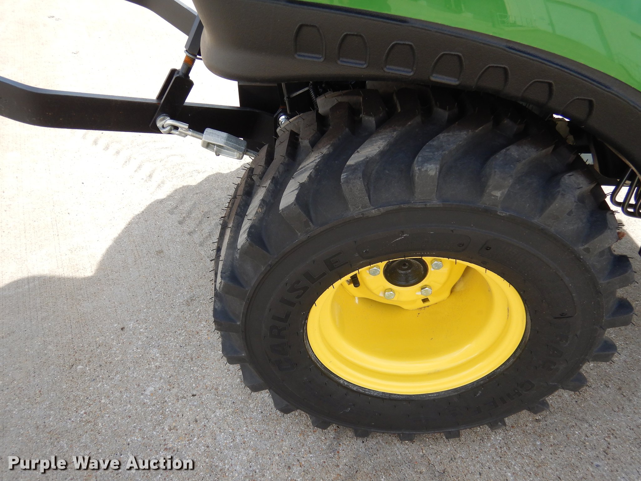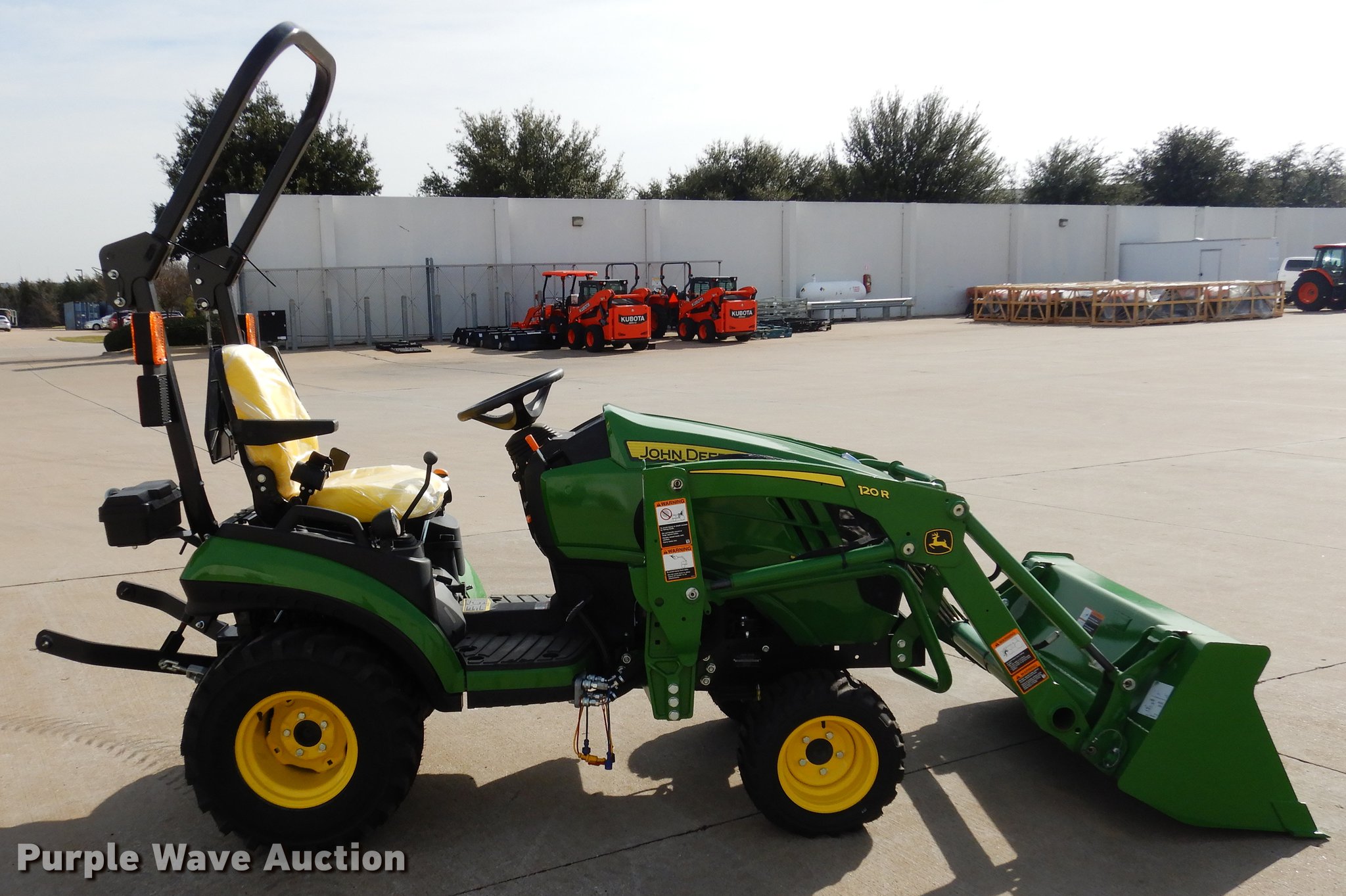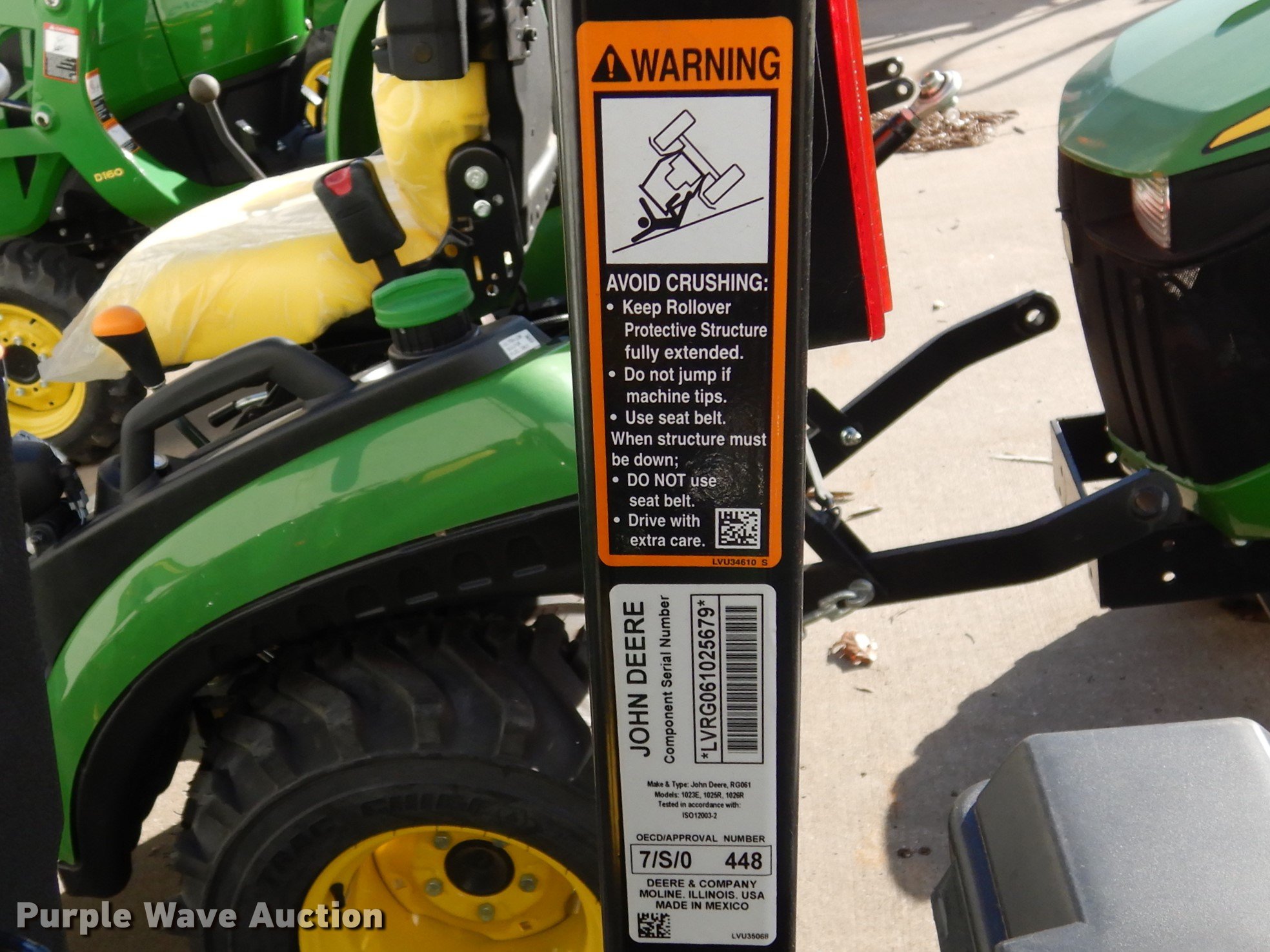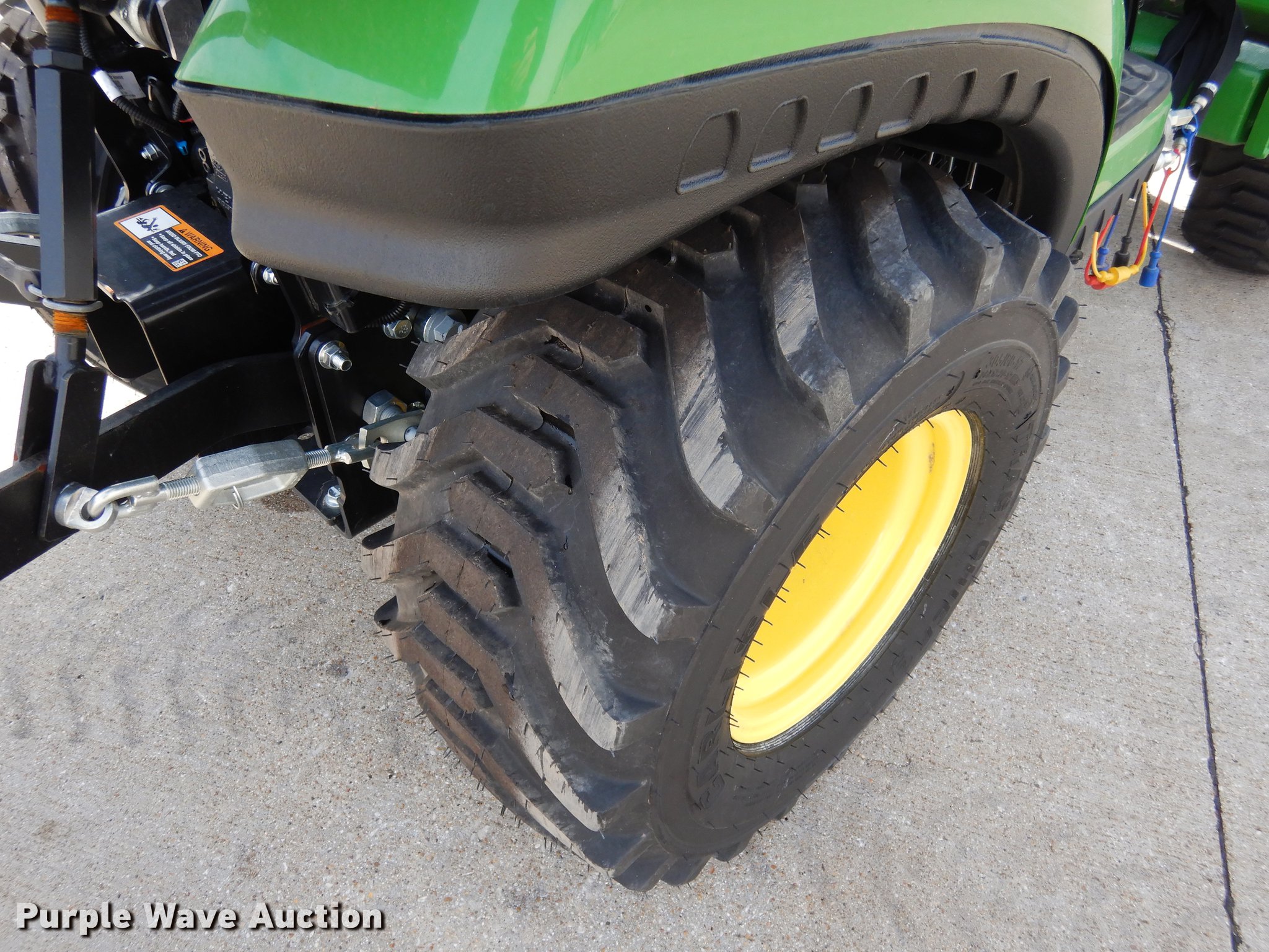 Purple Wave is selling a used Tractor in Texas. This item is a John Deere 1025R MFWD tractor with the following: 1 hours on meter, Yanmar 3TNV80F-NCJT 1.26L three cylinder diesel engine, 23.8 HP, Serial CH3U13D109402, Hydrostatic transmission, Differential lock, Folding ROPS, Tilt steering wheel, Suspension seat, Toolbox, John Deere 120R loader, 53"W bucket, Joystick controls, Three point, 540 PTO, 57" wheelbase, 18x8.50-10 front tires, 26x12-12 rear tires, Serial 1LV1025RREJJ154634