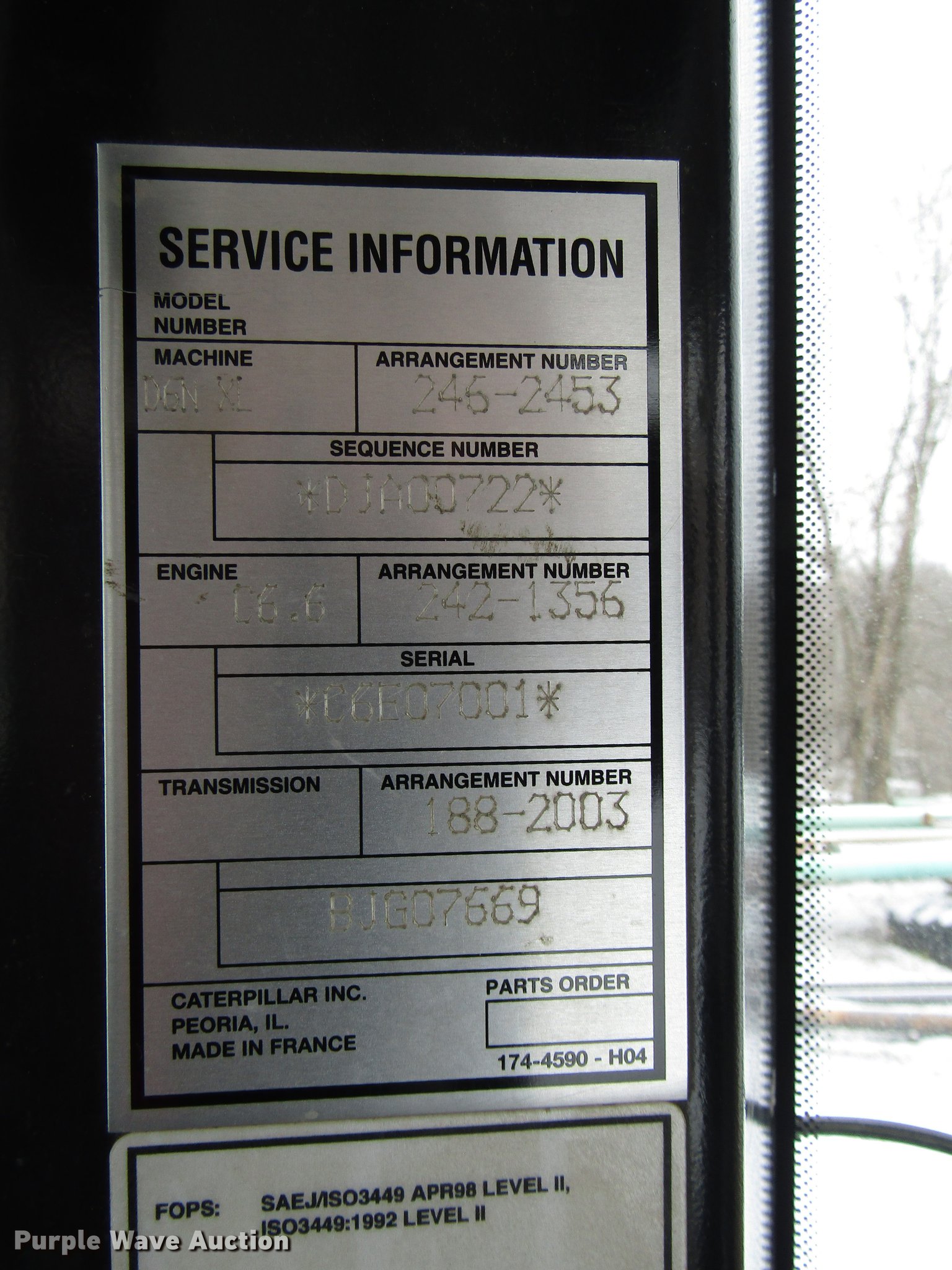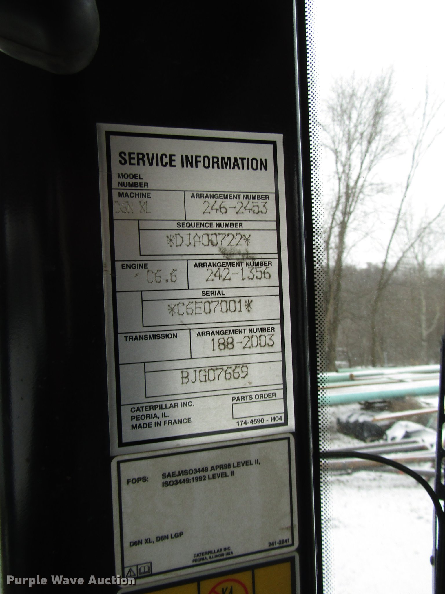 Purple Wave is selling a used Crawler Dozer in Pennsylvania. This item is a 2008 Caterpillar D6N XL dozer with the following: 10,134 hours on meter, Caterpillar C6.6 Acert six cylinder turbo diesel engine, Serial C6E07001, Powershift transmission, 3F-3R gears, Differential steering, Cab, AC and heat, Suspension seat, Joystick control steering, Front and rear wipers, Screen guards, Front and rear work lights, 119.5" straight dozer blade, Serial B6X02665, Auxiliary hydraulics, Winch, 1" diameter cable, Serial 0801036, Rear drawbar, 24"W single grouser track pads, Undercarriage may need rebuilt, Serial CAT00D6NTDJA00722, Unit# E64