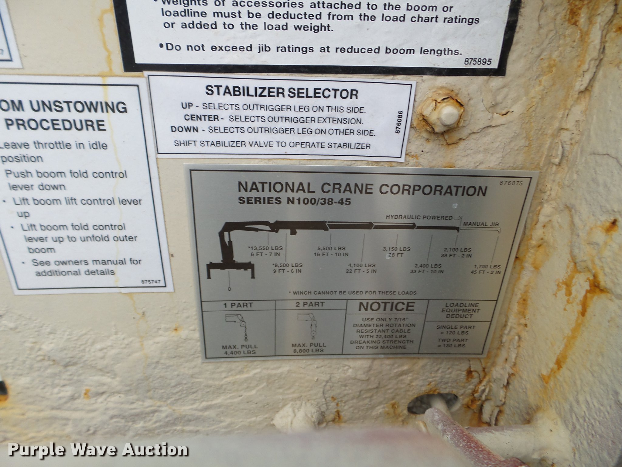 Purple Wave is selling a used Crane Truck in Iowa. This item is a 2006 International 4300 crane truck with the following: 290,950 miles on odometer, International DT466 7.6L L6 turbo diesel engine, Six speed manual transmission, Single axle, AC and heat, AM/FM, Air suspension seat, Stick crane controls, Block heater, Work lights, Backup alarm, 20'L x 96"W wood flatbed, (3) toolboxes, National Crane 100 telescopic crane, 38' boom length, 9,500 lbs maximum lift capacity, Four boom sections, Single winch, Crane ball and hook, Serial 292107, Pintle hitch, Air connections, Spring suspension, Air brakes, 315/80R22.5 front tires, 11R22.5 rear tires