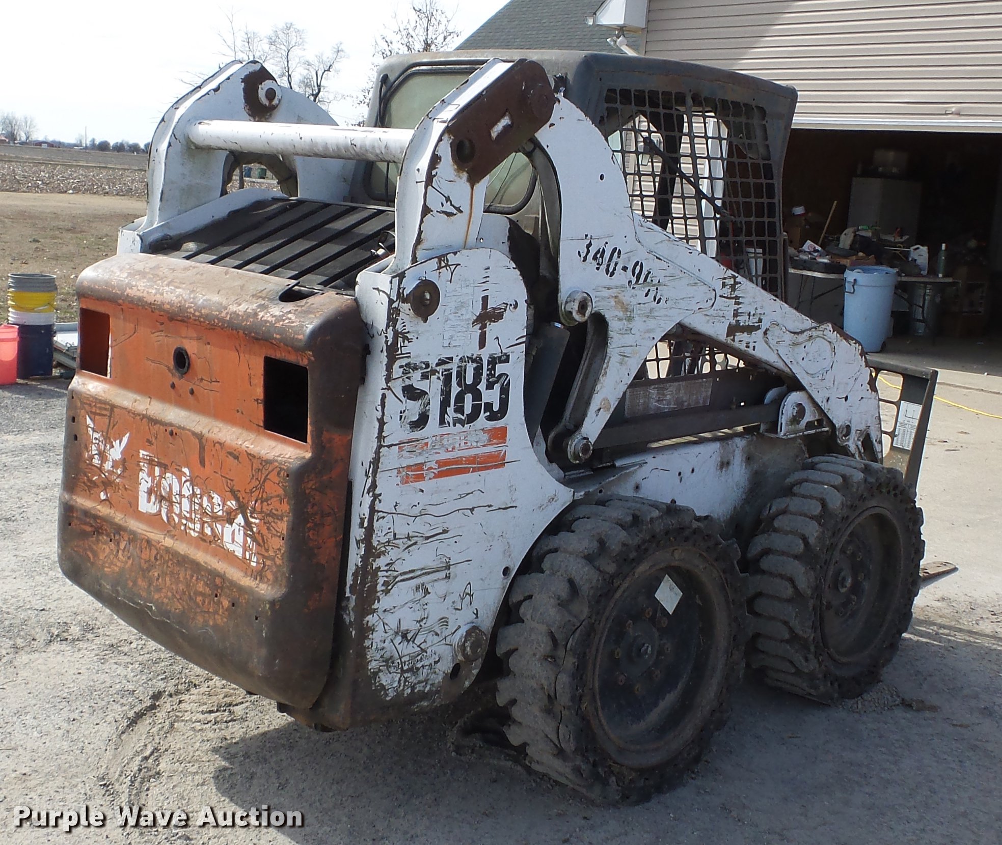 Purple Wave is selling a used Skid Steer Loader in Missouri. This item is a 2005 Bobcat S185 skid steer with the following: 3,287 hours on meter, Kubota V2003-M-D1-T four cylinder diesel engine, 56 HP, Two speed hydrostatic transmission, OROPS, Joystick controls, Suspensions eat, Front work lights, Auxiliary hydraulics, Manual quick coupler, 40"L x 4"W forks, 31x10.5-20 tires, Wheel bearing issues, Serial 525024142