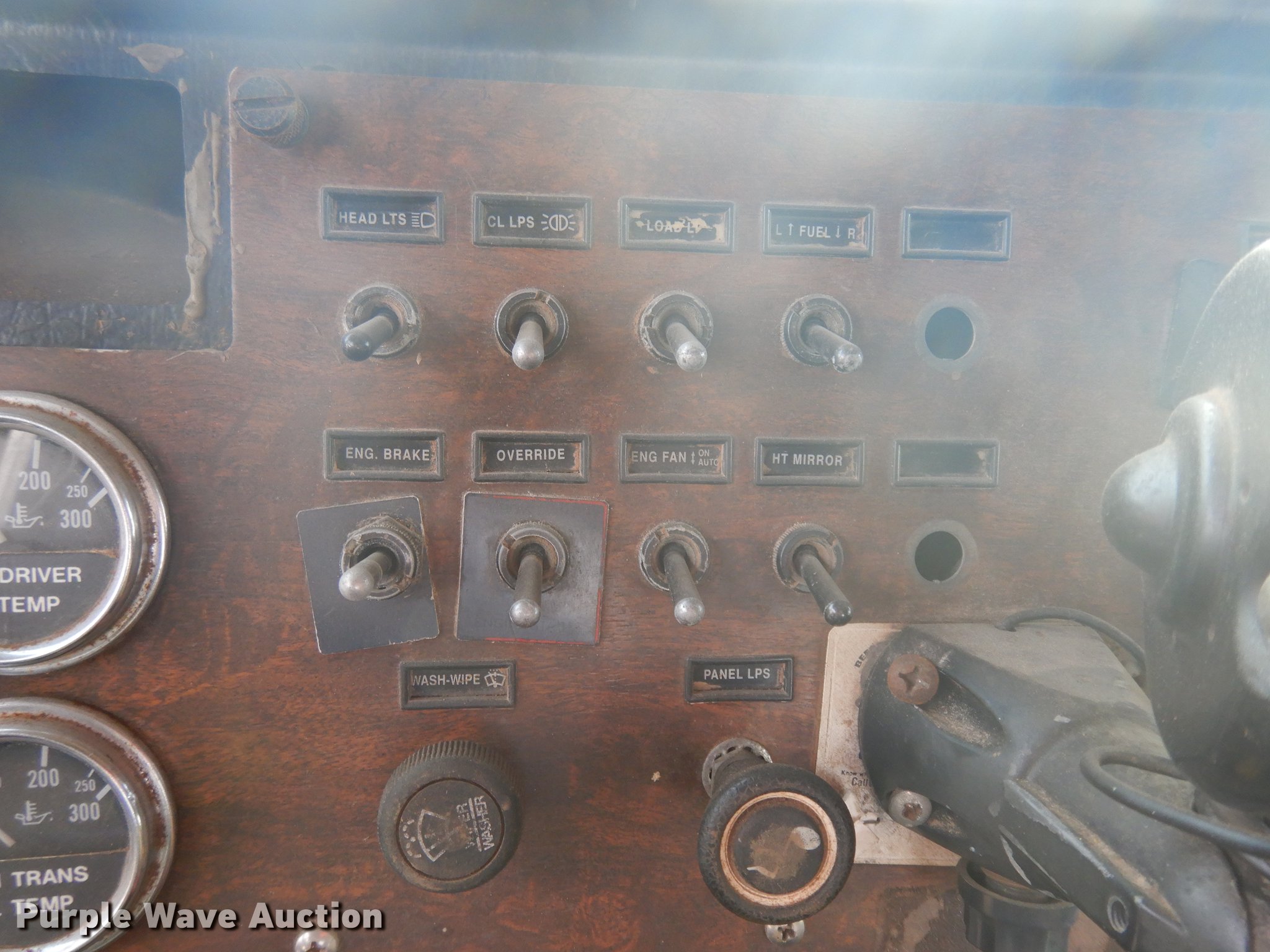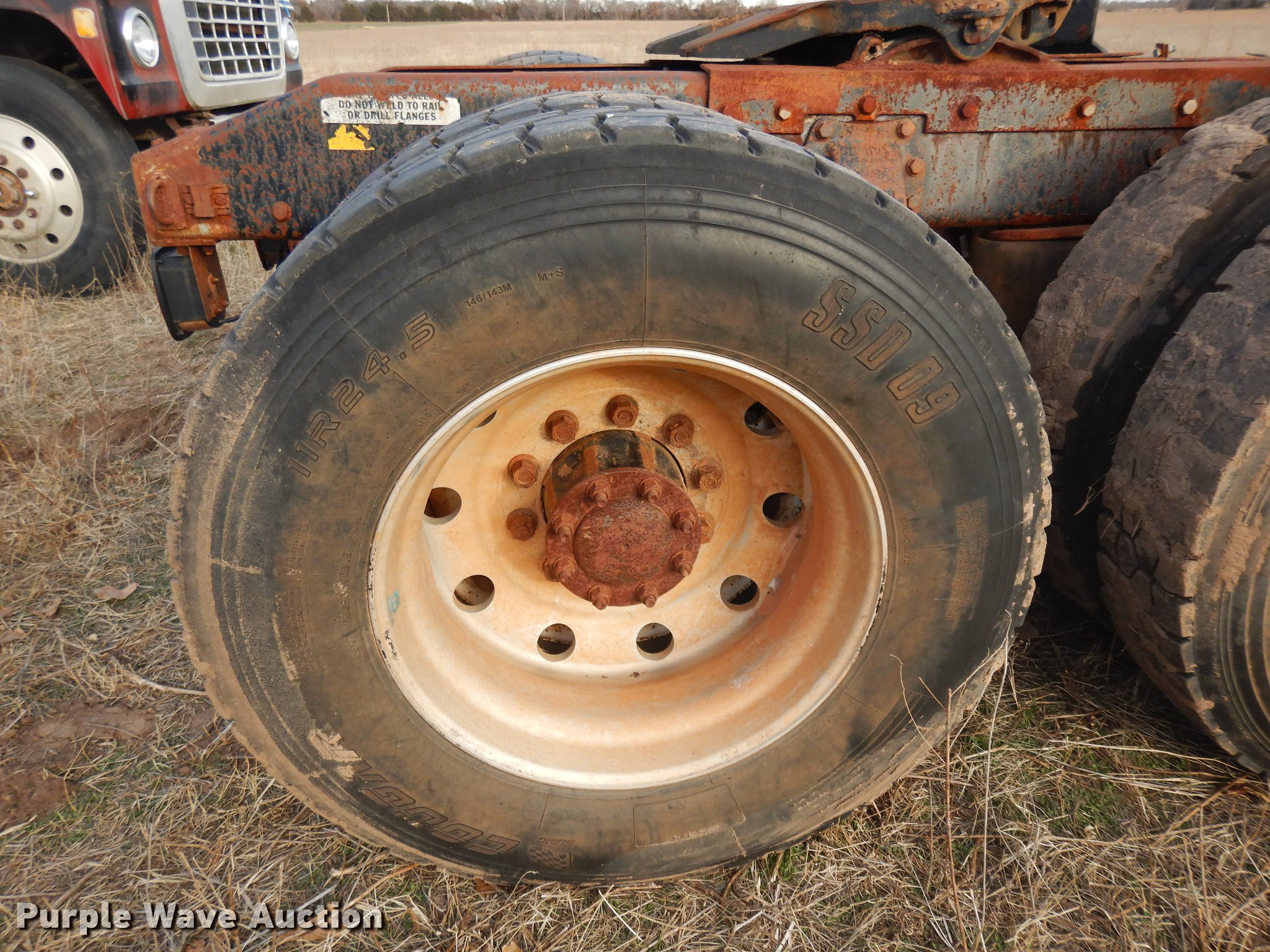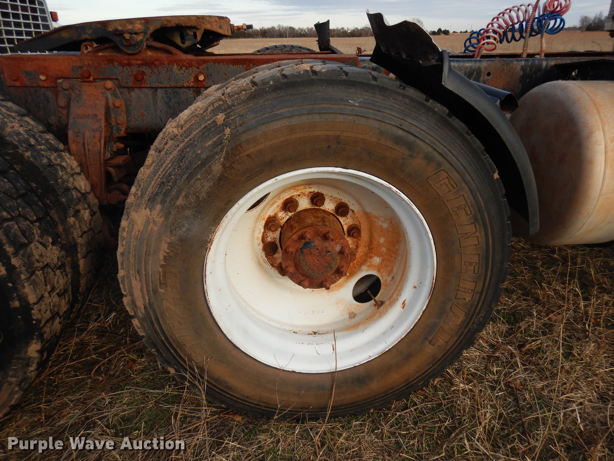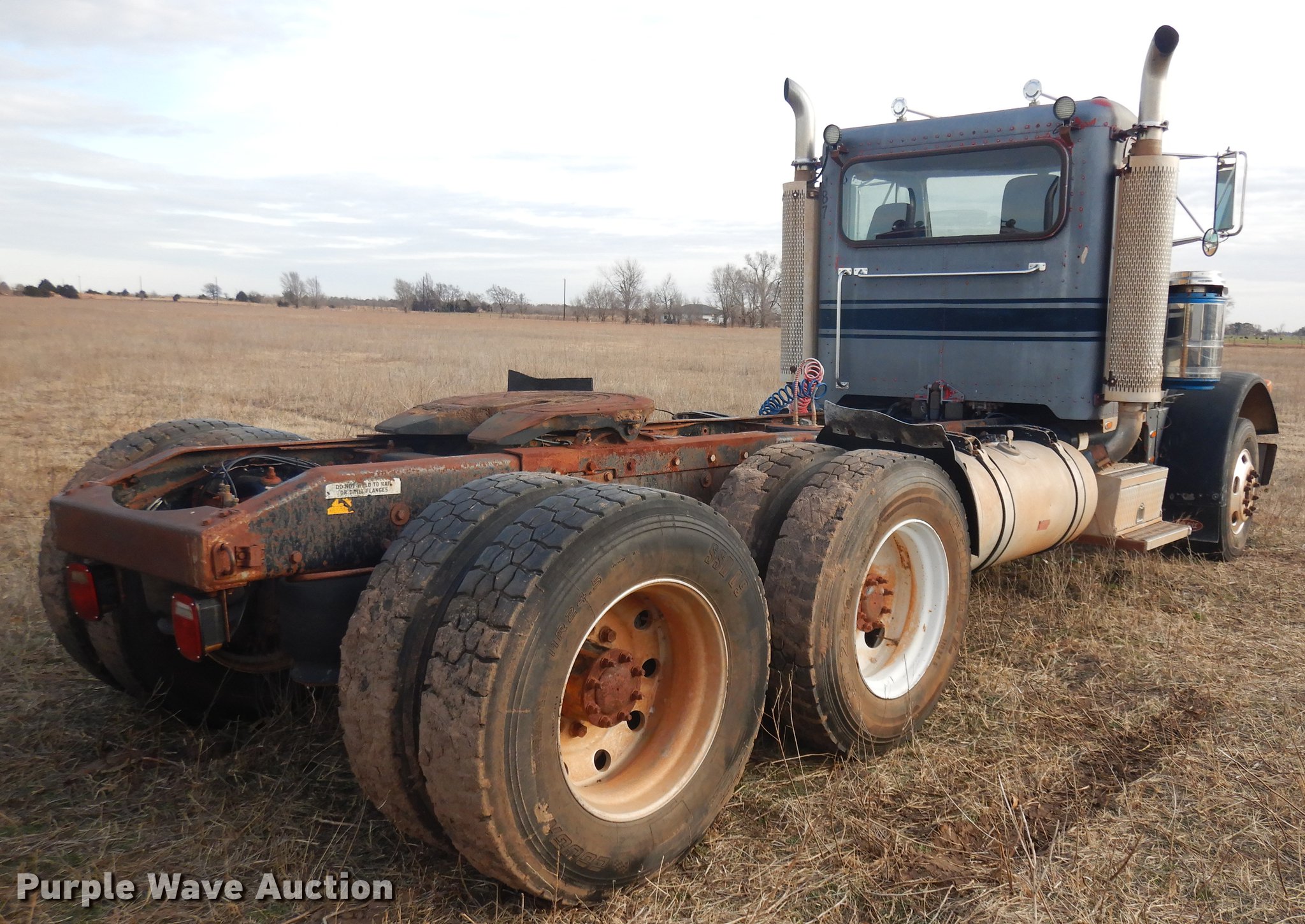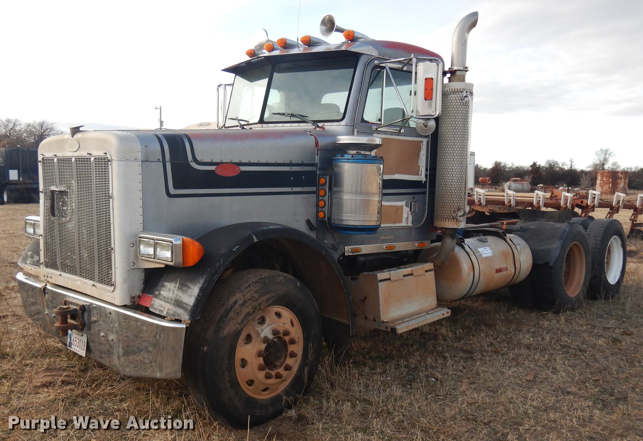 Purple Wave is selling a used Truck Tractor in Oklahoma. This item is a 1996 Peterbilt 379 semi truck with the following: 751,345 miles on odometer, Caterpillar 3406 14.6L L6 turbo diesel engine, 10 speed manual transmission, Tandem axle, AC and heat, Spring suspension seat, PTO, Dual exhaust stacks, Sliding fifth wheel plate, Dual fuel tanks, Air suspension, Air brakes, 236" wheelbase, 11R22.5 front tires, 11R24.5 rear tires, GVWR 56,000 lbs, Unknown operating condition