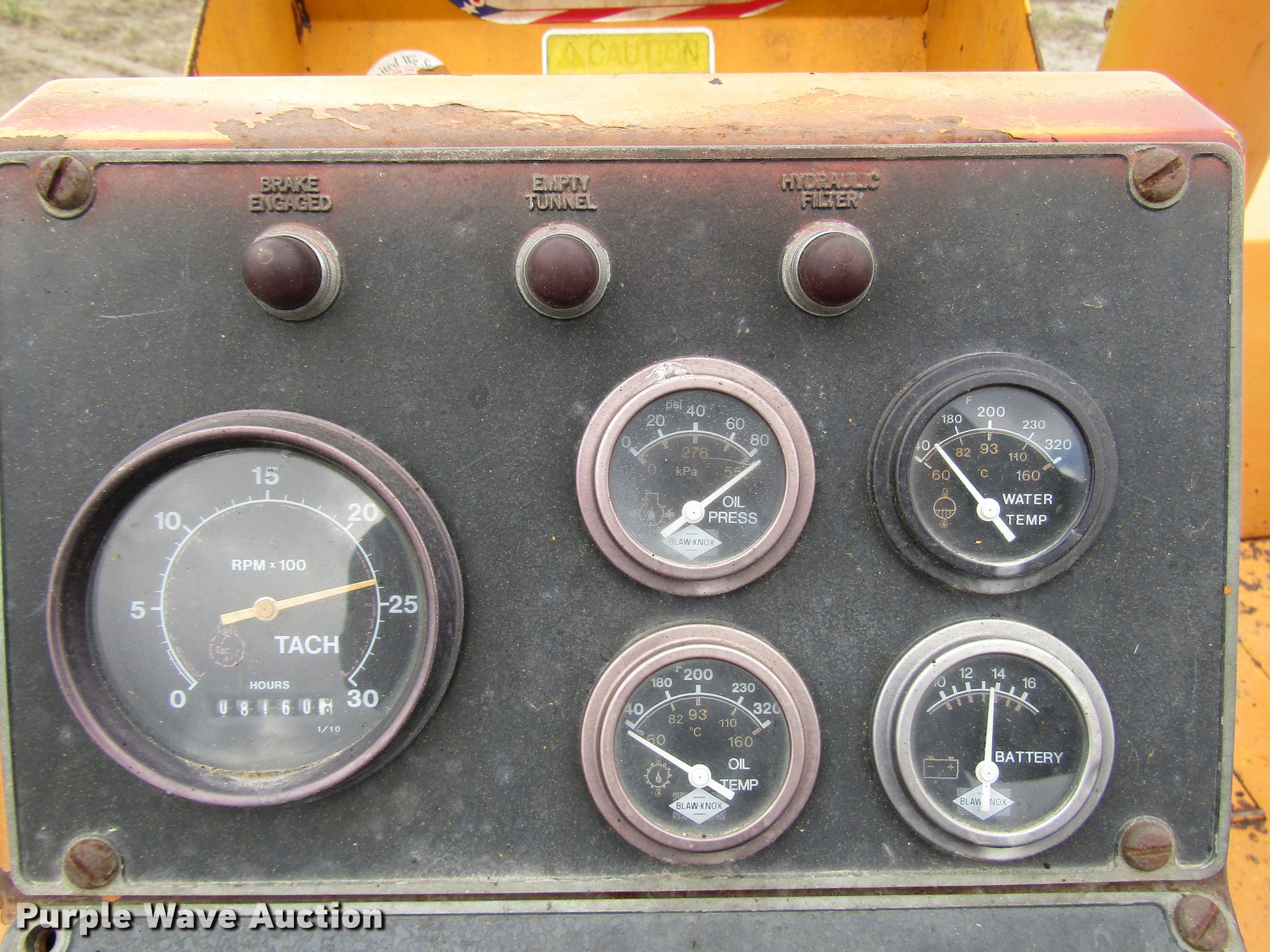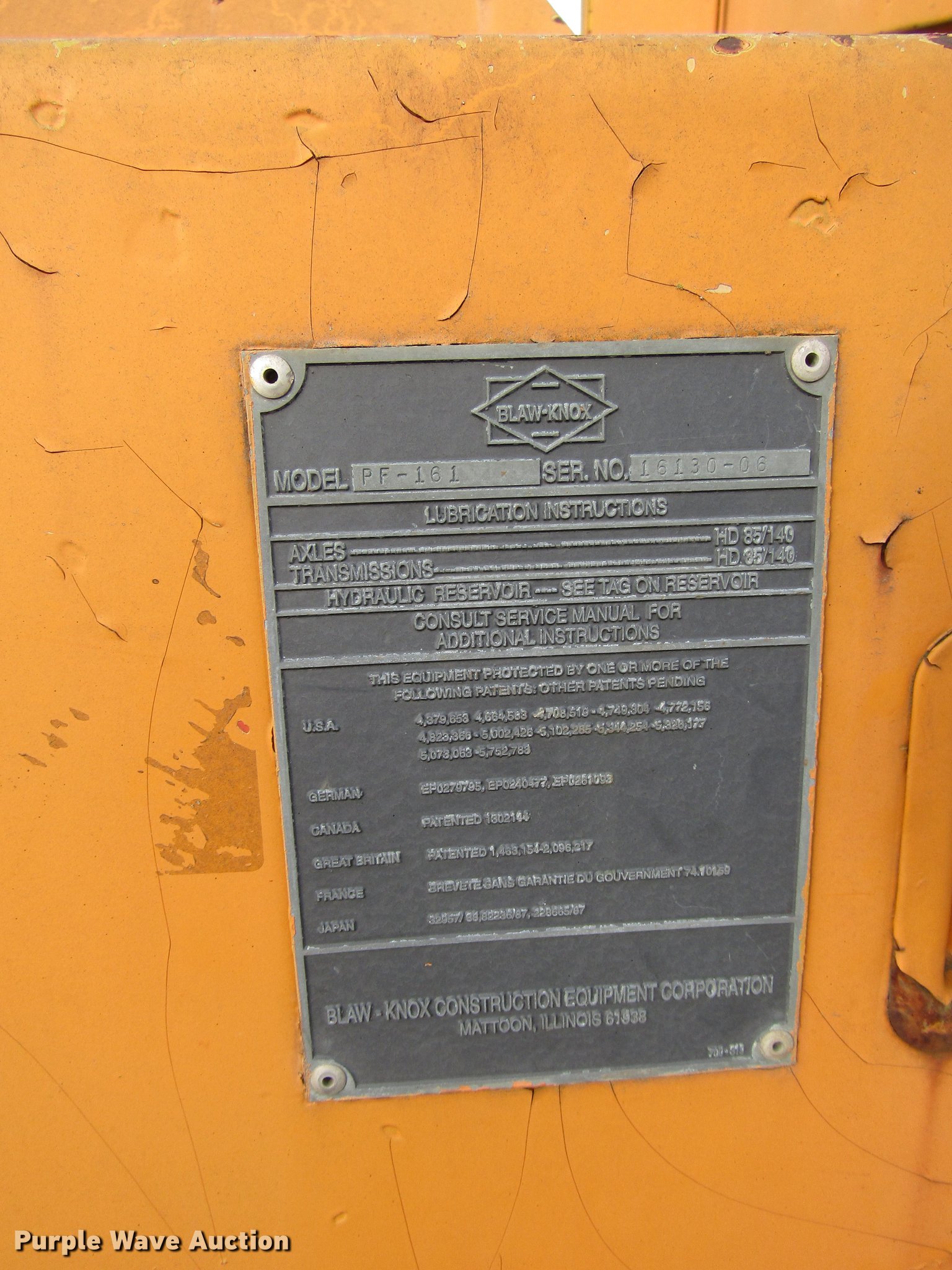 Purple Wave is selling a used Paver or Screed in Kentucky. This item is a 2000 Blaw Knox 161 paver with the following: 8,160 hours on meter, Cummins four cylinder turbo diesel engine, Hydrostatic transmission, Dual operating stations, 8' to 13' paving width, Dual 18"W material conveyor, Dual screed heaters, Wash down system, 4.00-20 tires, Non-operational engine shutoff, Serial 1613006