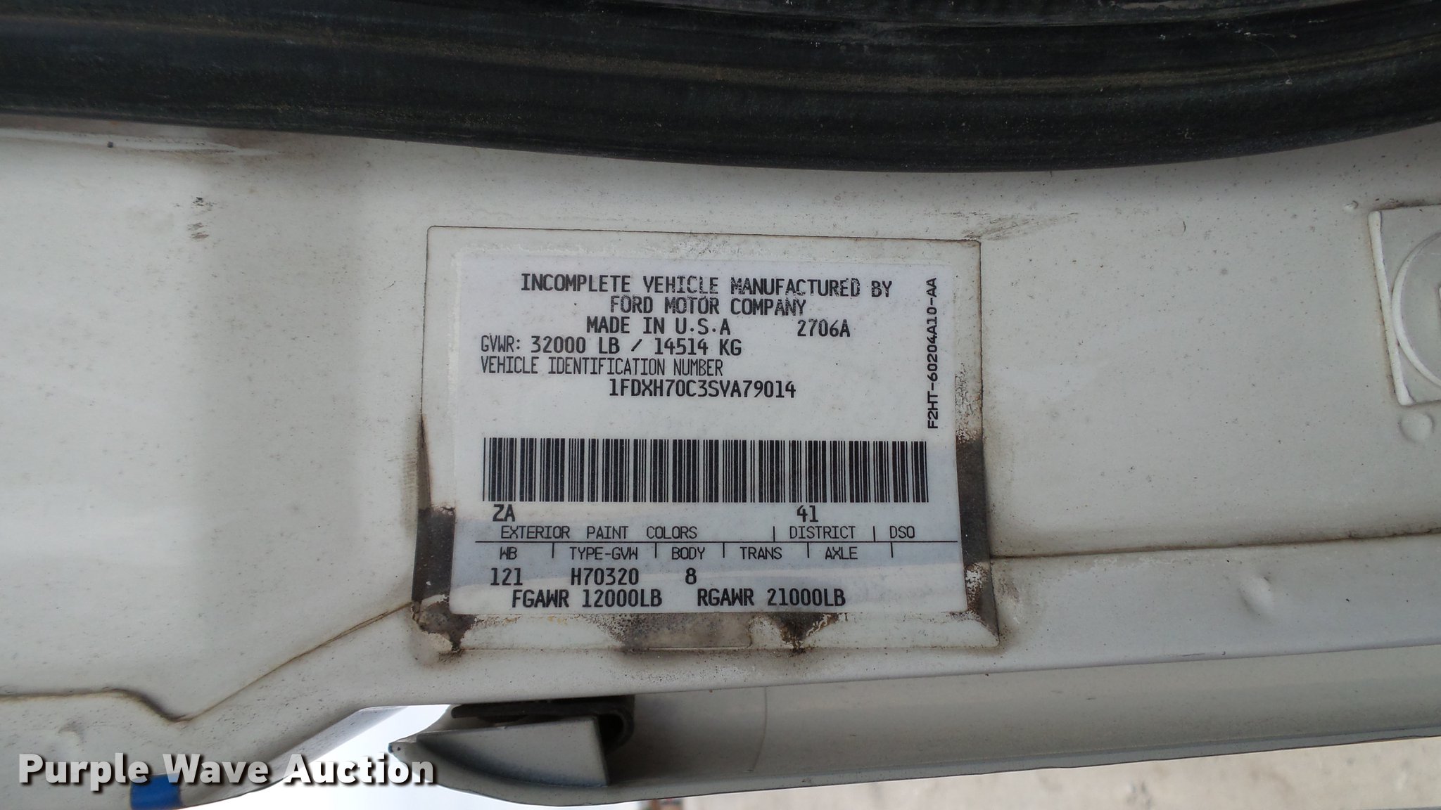 1995 Ford CF7000 street sweeper. 70,573 miles on odometer, Cummins 5.9L L6 turbo diesel engine, Automatic transmission, Enclosed cab, AC and heat, AM/FM, Backup camera, Wipers, Elgin Eagle Series F sweeper unit Isuzu C240 four cylinder diesel engine, 3,267 hours on meter, Dual operating stations, 5' sweeping width Hydraulic lift, tilt, and rotation, 4.5 cu.yd. hopper, 32" diameter gutter brooms, 34"W pickup broom Front water application 360 gallon water system, Hydraulic drive sweeping system, Automatic lubrication system, Front work lights, Air brakes, 11R22.5 tires, Non-operational AC, Non-operational backup camera, Windshield chipped, Auto greaser canister broken. Illinois title. 1FDXH70C3SVA79014. Metro Sweeping. 301 Transpoint Dr. Dupo, IL 62239