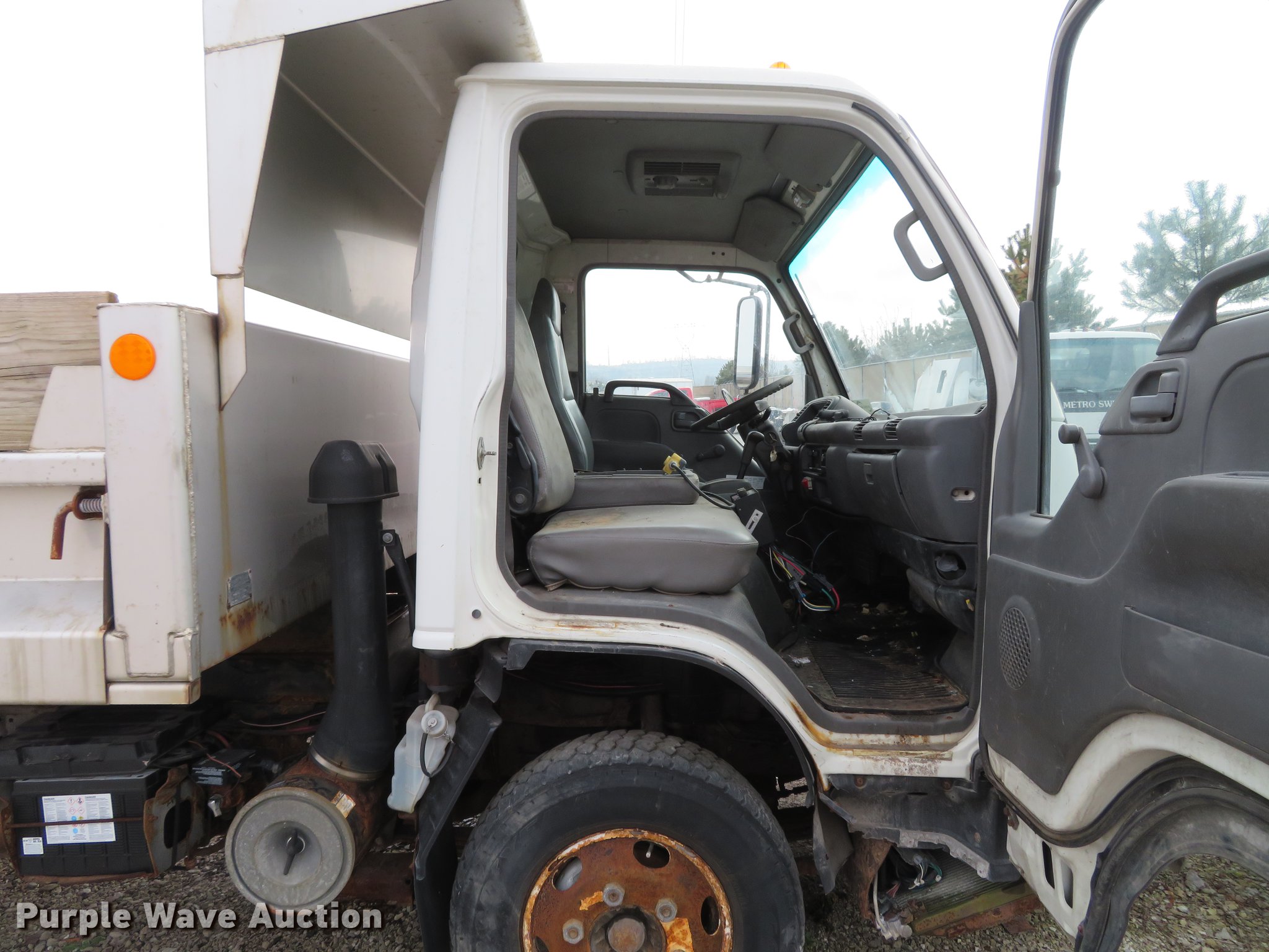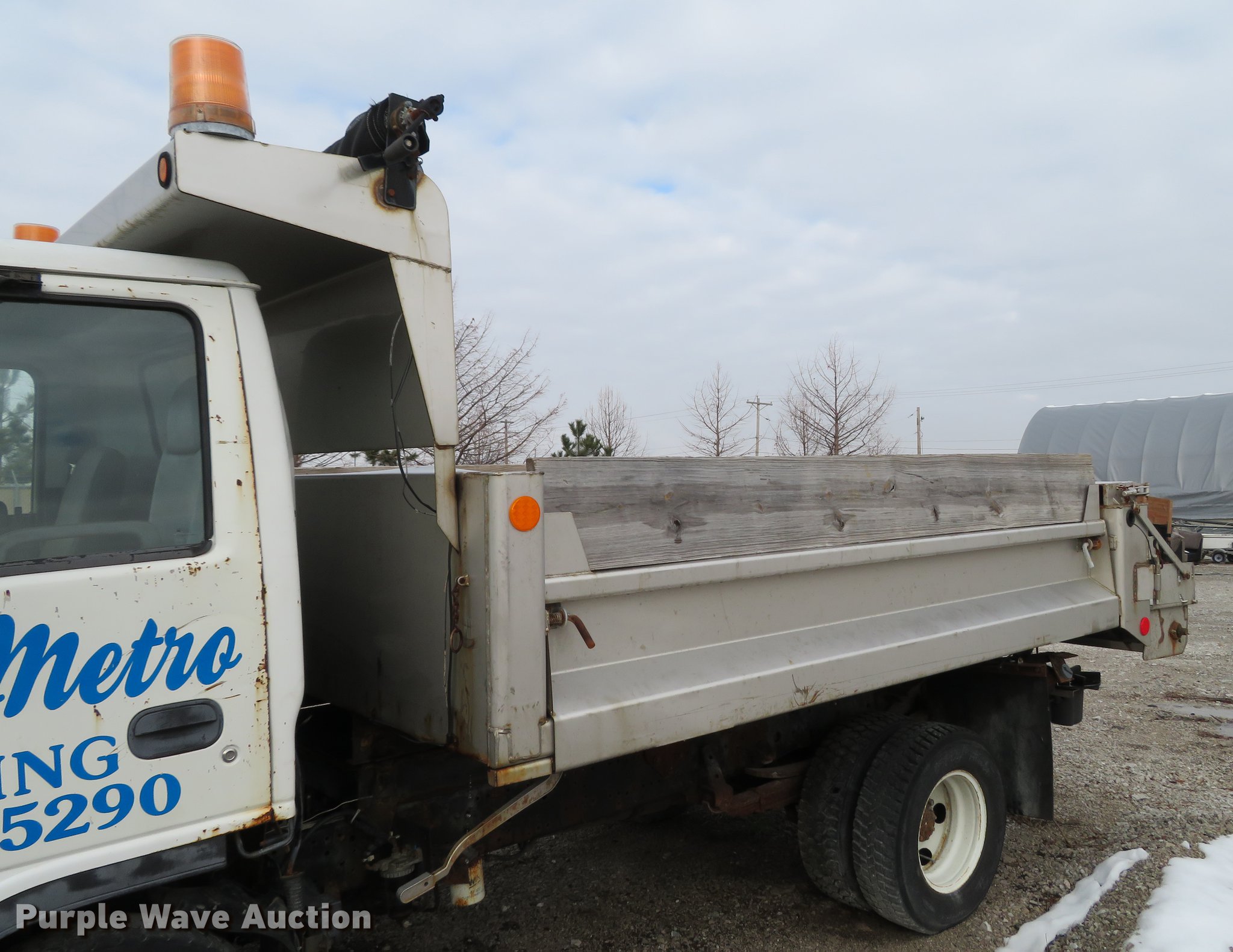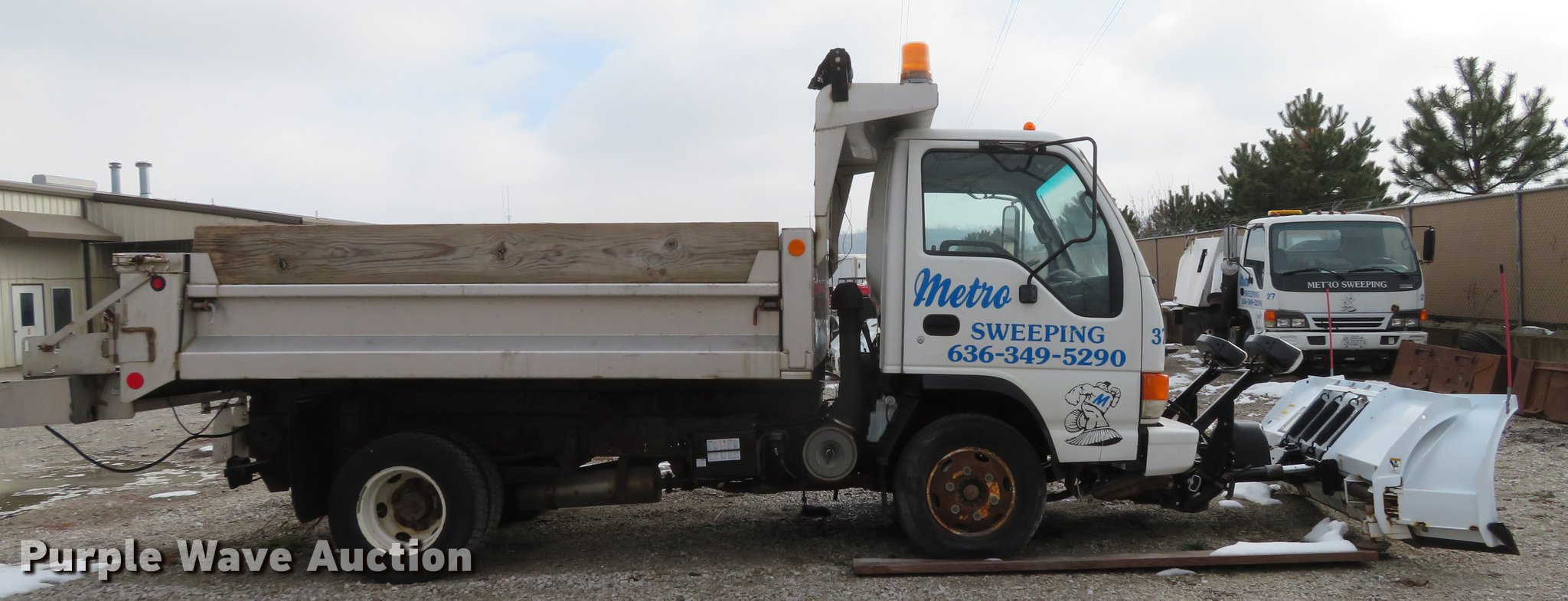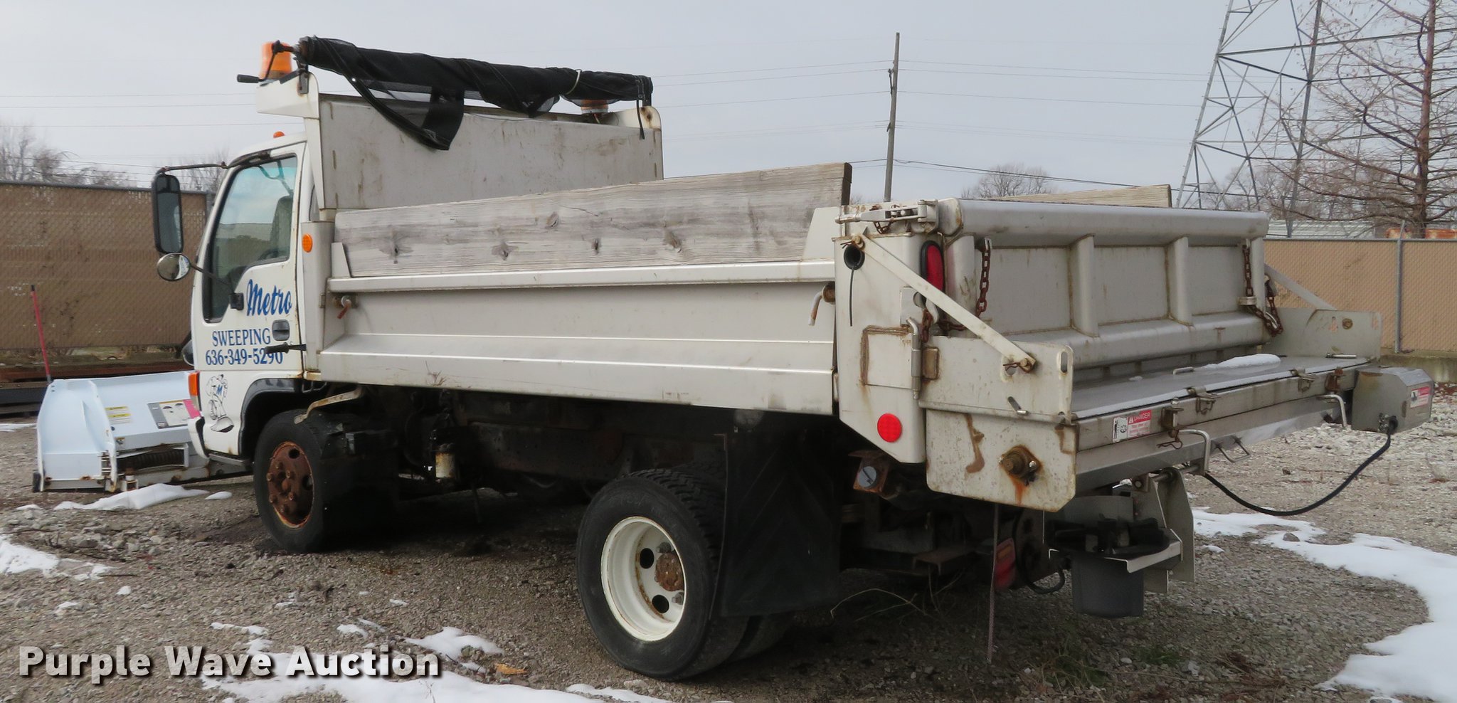 Purple Wave is selling a used Construction Dump Truck in Illinois. This item is a 2004 Isuzu NPC7SC dump truck with the following: 147,314 miles on odometer, Isuzu 4HE1-TC 4.75L four cylinder turbo diesel engine, Automatic transmission, Single axle, AC and heat, AM/FM, (2) beacon lights, Galion-Godwin 100UDS-11 stainless steel dump bed, 11'L x 95"W, 13" side height, 10" side board height, Single ram electric over hydraulic hoist, Manual operated end gate, Roll tarp, Salt Dogg 92440SSA under tailgate spreader, Blizzard 8600SW snow plow, 8'7"W, Single fuel tank, Spirng suspension, Hydraulic brakes, LT225/75R16 tires, GVWR 12,000 lbs, FAWR 4,700 lbs, RAWR 7,950 lbs, Windshield chipped, Non-operational engine, Possible electrical issues