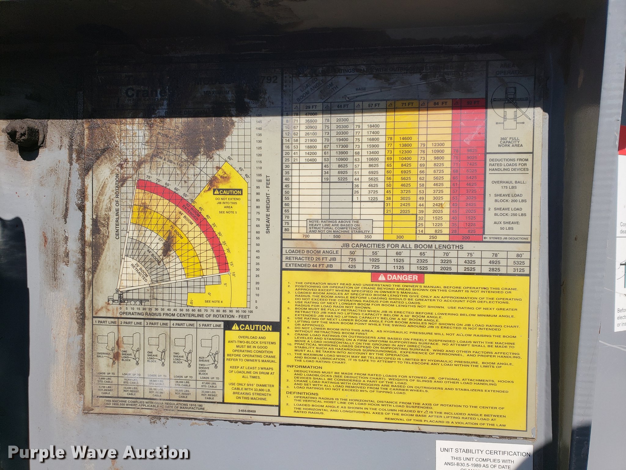 2002 Peterbilt 330 crane truck. 176,040 miles on odometer, 3,241 hours on meter, Caterpillar 3126 7.2L L6 turbo diesel engine, Eaton Fuller 10 speed manual transmission Lo-Lo, AC and heat, AM/FM, Heated mirrors, Air suspension seat, PTO, 21'L x 100"W flatbed 28"H removable sides, Terex Stinger TC-4792 crane 92' boom, 26' to 44' extendable jib, 47,000 lbs maximum lift capacity, (5) hydraulic outriggers, Spring over walking beam suspension, Air brakes, 425/65R22.5 front tires, 11R22.5 rear tires, GVWR 60,000 lbs. View repairs. Missouri title. Title has a lien that will be released following the close of the auction. Title distribution may be delayed up to 30 days from verification of funds. 2NPNLD0XX2M574220. 2215 Old State Hwy 210. Liberty, MO 64068