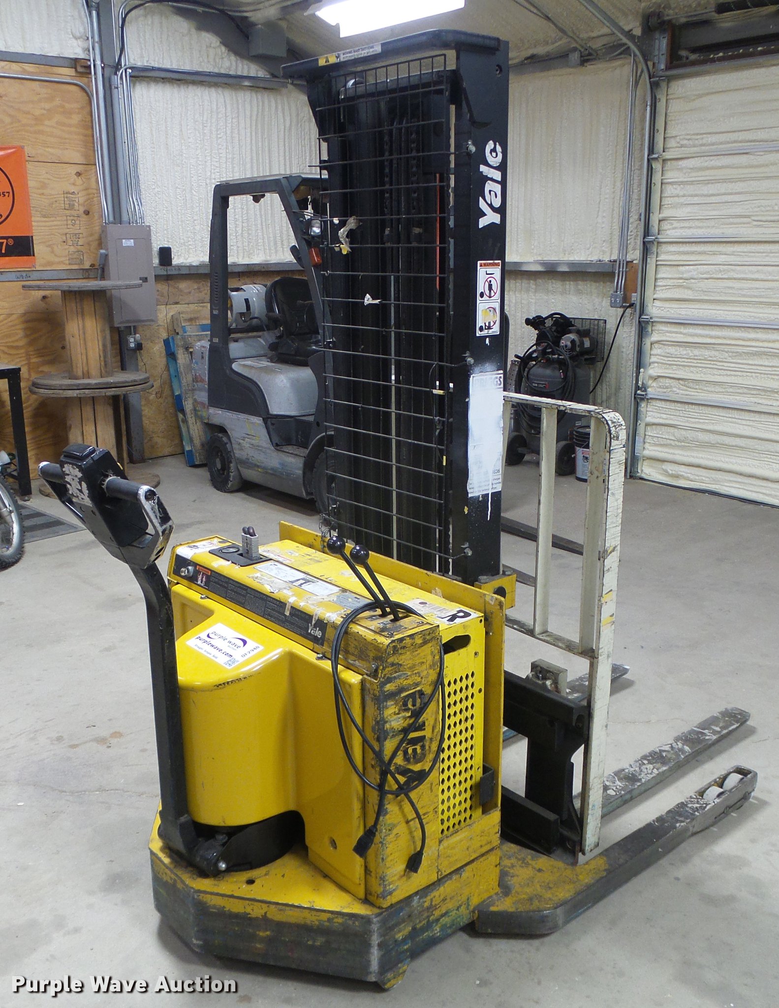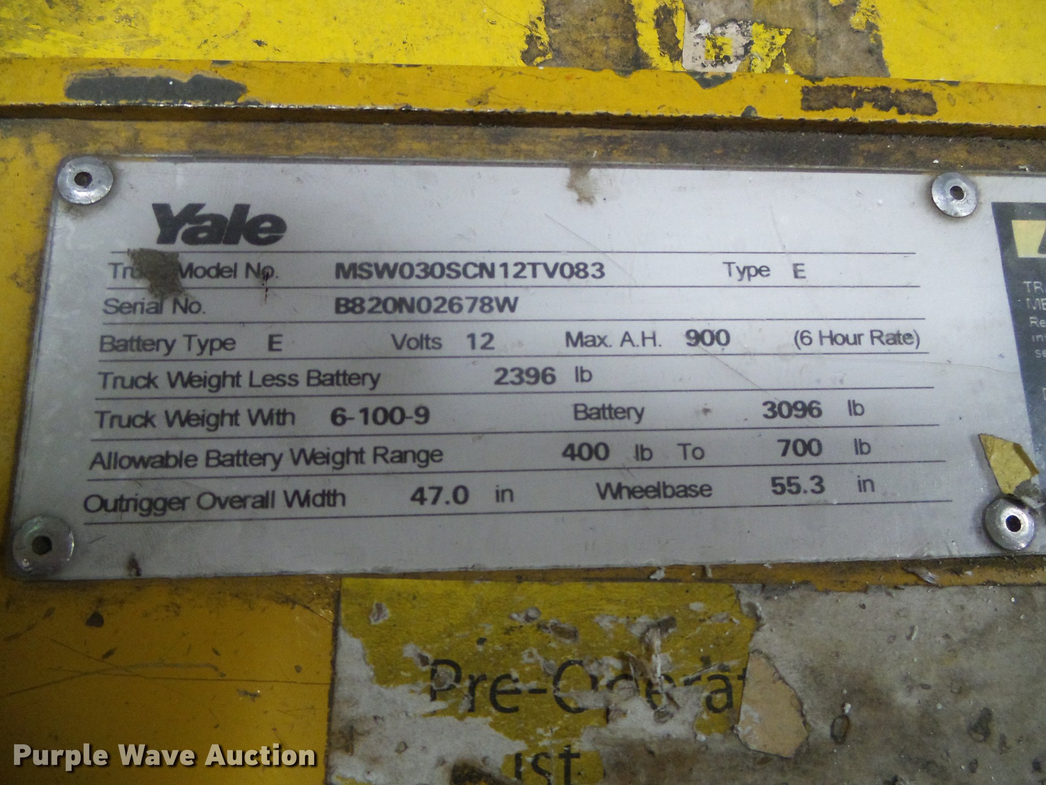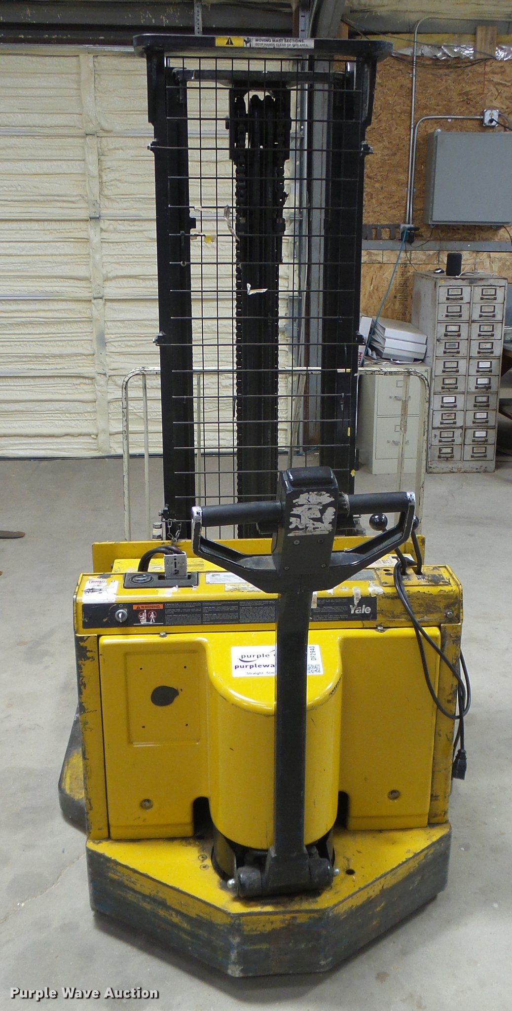 Purple Wave is selling a used Warehouse Forklift in Kansas. This item is a Yale MSW030SCN forklift with the following: 6,303 hours on meter, 12V electric operation, Hydrostatic transmission, 1F-1R gears, 2,800 lbs max lift capacity, 126" max lift height, Two stage mast, Side shift, 42" fork length, Solid tires, Charger included, Serial B820N02678W
