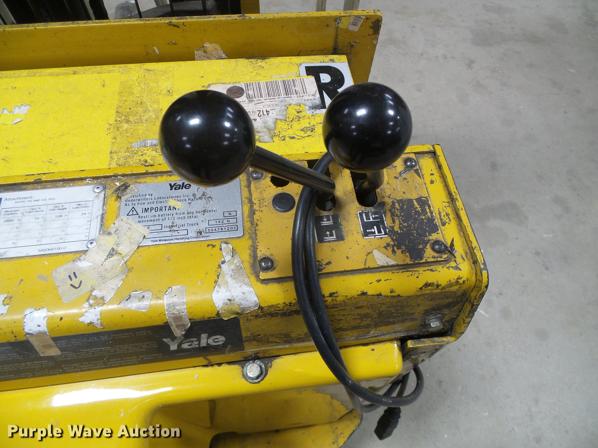 Yale MSW030SCN forklift. 6,303 hours on meter, 12V electric operation, Hydrostatic transmission 1F-1R gears, 2,800 lbs max lift capacity, 126" max lift height, Two stage mast Side shift, 42" fork length, Solid tires, Charger included, Serial B820N02678W. Pruitt Electric LLC. 415 N Main St. Spearville, KS 67876