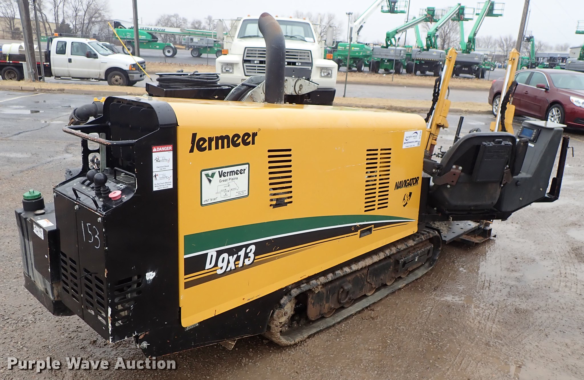2014 Vermeer D9x13 S3 directional drill, mud mixing system, and trailer. 2,354 hours on meter, Kubota V1505-T four cylinder diesel engine 44 HP, Hydrostatic transmission, Joystick controls, Approximately 30 drill stems 6'L x 1.66" diameter, Water system 15 GPM pump, 25 gallon poly water tank, Stake down system, 10"W tracks, Serial 1VR1120H6E1000153, Vermeer MX125 mud mixing system Honda gas engine, 500 gallon poly tank, 5 gallon freeze guard tank, 2006 Towmaster T-12DD trailer 16.5'L x 82"W wood deck, 72" x 18"W ramps, Pintle hitch, Tandem axle, 235/85R16 tires. Kansas title. 4KNUT16227L160453. Utilities Plus, Inc.. Wichita, KS 67204