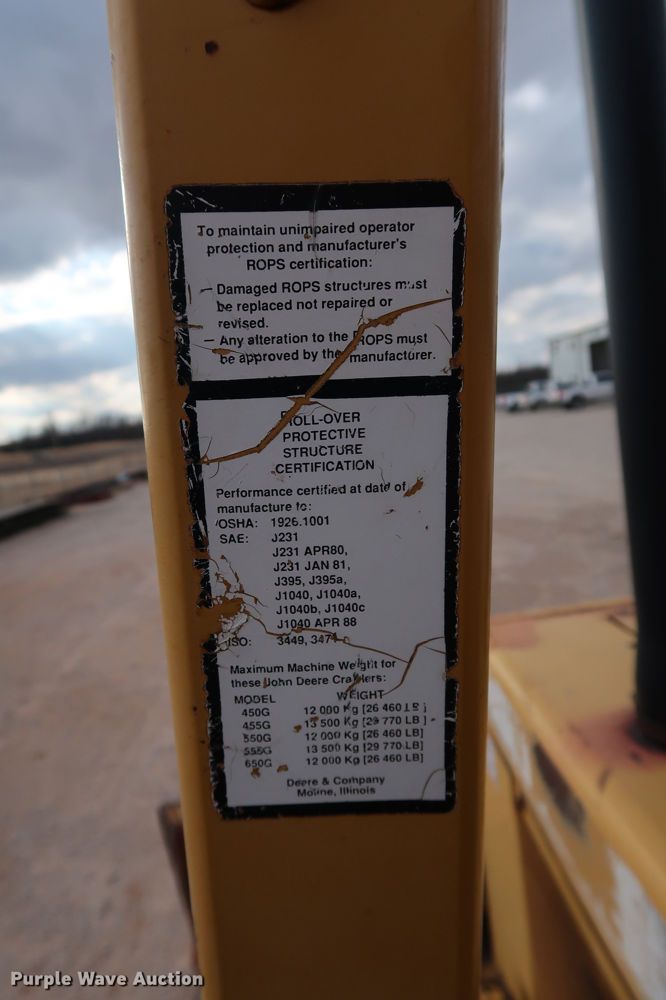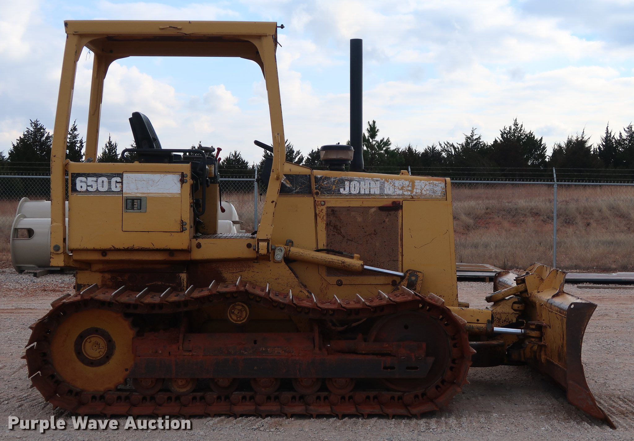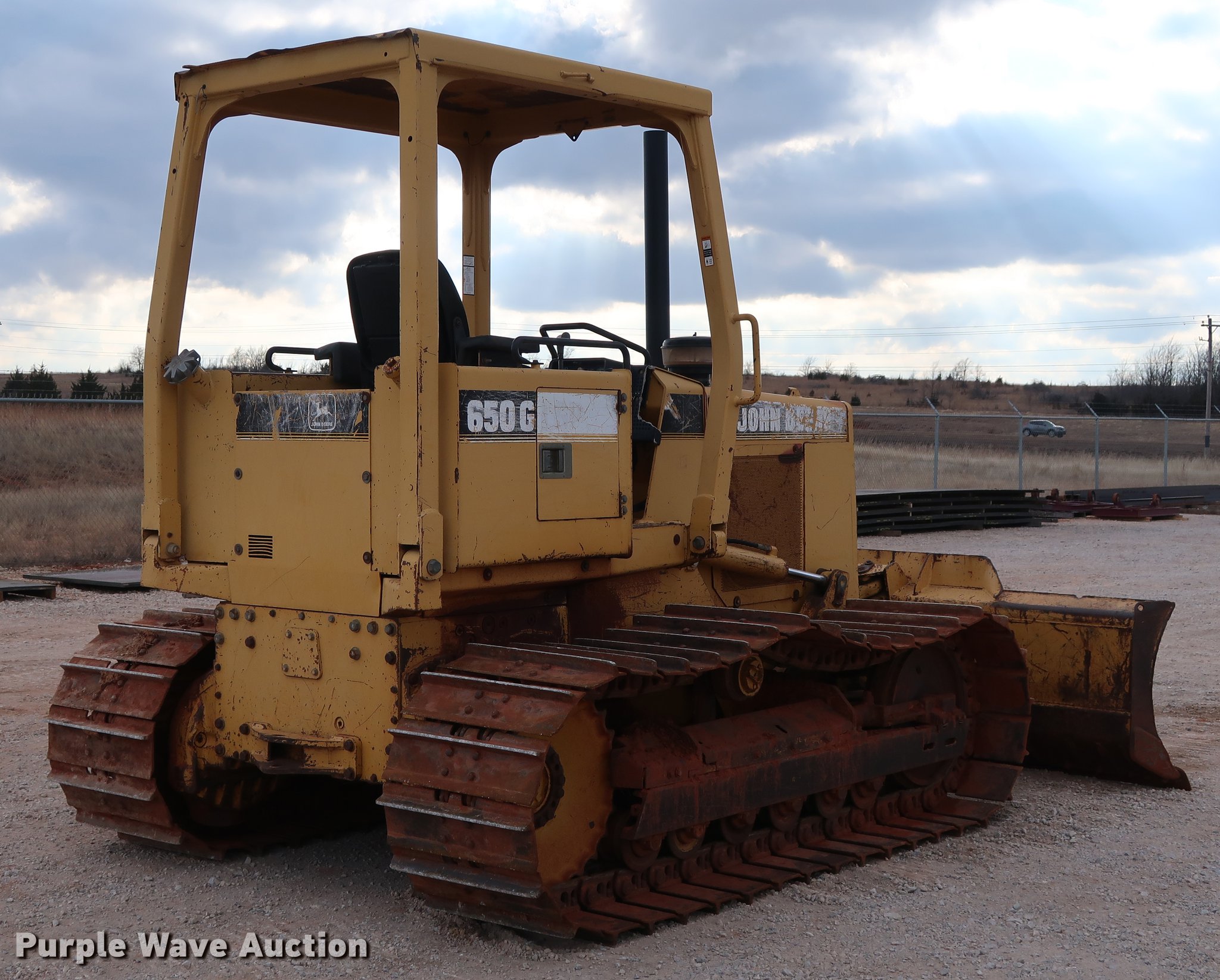 Purple Wave is selling a used Crawler Dozer in Oklahoma. This item is a 1997 John Deere 650G LGP Series IV dozer with the following: 6,685 hours on meter, John Deere 4045T 4.5L four cylinder turbo diesel engine, 90 HP, Powershift transmission, 4F-4R gears, Canopy, Suspension seat, Clutch brake steering, 115" six-way straight dozer blade, Pin hitch, Six bottom rollers, 24" single grouser track pads, Serial T0650GW825714
